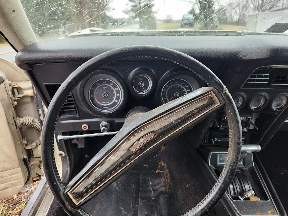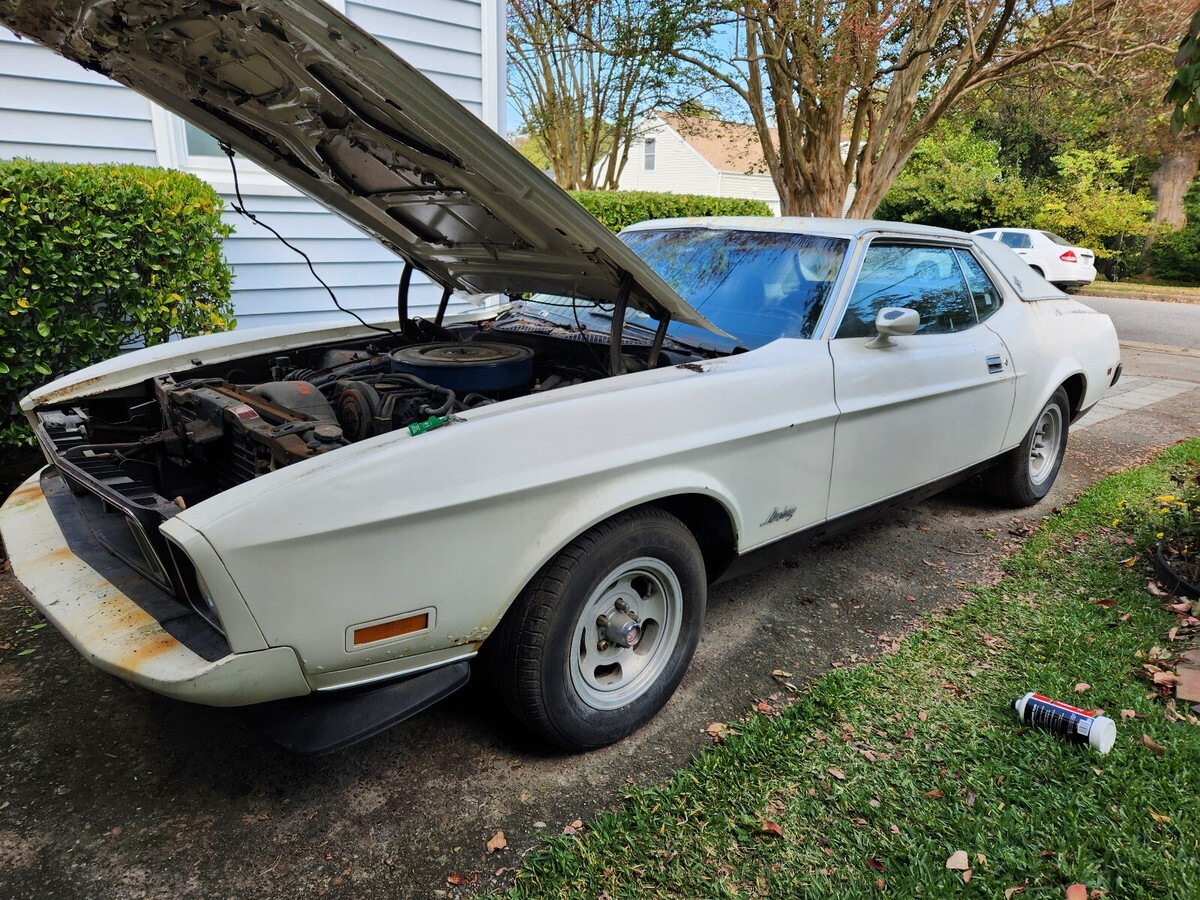 A little over 500 Q-code Hardtops and Grandes were built for 73.RARE TRIPLE WHITE. LOADED WITH OPTIONS!!! PS/PDB/AC/Power Windows/Leather wrapped steering wheel/Convenience group.. COMPETITION SUSPENSION. Original factory FORGED aluminum rims/front spoiler. Pretty complete and original. Always a Virginia car. Has been sitting 20+ years.Somebody put black upholstery in, but it is supposed to be white (see factory invoice for all options).Driver door was replaced by the original owner. Since the door data label cannot be removed without damage, there is a DMV VIN certification tag on the back driver door pillar (See pics). Apparently the original owner also replaced the dash, and the VIN tag was removed. The original buck tag is still on the car. (see pics).The DMV certification tag, the buck tag, the factory invoice, the original sales contract, the stamped numbers under the fender, TITLE, and ALL NUMBERS ON THE CAR ARE MATCHING. (SEE PICS). Reproduction door data labels, as well as the full "Marti Report", are available from Martiauto.comHas some rust in typical areas- not horrible if you're not afraid of doing some metal work.Hood is toast. Mach1 grille is good.Driver door is toast.Cowl needs repair.Roof needs repair.Frame rails good.Trunk floor is good.Trunk lid is good.Rear wheel houses pretty good.Floors not horrible, but needs some repair.Top center of the windshield/roof. Extra set of 73 fenders. NOS Wheel centers.ORIGINAL SPARE TIRE!!LOTS OF ORIGINAL PAPERWORK!1973 Ford service manuals.Original Factory Invoice.Photocopy of original title from 1973.Original sales contract from 1973.Original owners manual.More misc. paperwork.This is a rare pony, with a little over 500 Q-Code Hardtops built for 73... And with the triple white color scheme (factory lower body blackout with chrome trim strip), AC, power windows, and leather wrapped steering wheel, I'm certain there were barely a handful so WELL equipped. This car is so original- it has serious potential for a gorgeous concours restoration. I pulled the radiator, and was able to turn the engine back and forth with a wrench on the crank. I didn't want to move it too much since it hasn't been run in 20+ years. Just wanted to ensure it was free. I don't believe it's necessary to make it run. It's a 52 year old engine that's been sitting for 20. It deserves a rebuild if one restores the car. There is clean looking oil on the dipstick. Other than hoses, wires, and belts, (maybe the alternator), the engine looks 100% original.I don't really want to run it, since I know the brakes are inop. Inside the master cylinder reservoir is dry and ugly rust. The original factory forged wheels are in good shape, and will clean up nice with some wet sanding, and polishing.This car is so complete and original- it has serious potential for a gorgeous concours restoration. I DON'T WANT TO END UP PARTING OUT THIS BEAUTIFUL CAR! I HAVE 7 OTHER MUSTANGS, AND I JUST CAN'T KEEP THEM ALL.MUSTANGS THIS RARE, COMPLETE, AND UNMOLESTED ARE GETTING HARDER TO FIND!SEE PICS FOR MORE DETAILS, AND ASK QUESTIONS BEFORE YOU HIT THE BUY BUTTON. ONCE YOU HIT THE BUY BUTTON, IT'S A CONTRACT TO BUY THE CAR, NOT A FREE TICKET TO "TAKE A LOOK" AND DECIDE YOU DON'T WANT IT.SOLD STRICLTLY AS-IS, WHERE IS.NO DEPOSIT. FULL PAYMENT BY DIRECT BANK WIRE TO WELLS FARGO BANK ONLY.PICK UP STRICTLY BY APPOINTMENT ONLY DUE TO MY WORK SCHEDULE.NOT LOOKING FOR OFFERS... MY PRICE IS ALREADY BOTTOM LINE AND FAIR FOR THIS RARE COBRA-JET HARDTOP.. GO LOOK AT SOME OF THE JUNK MUSTANGS OUT THERE FOR $5000+. I HAVE 50 YEARS EXPERIENCE WITH MUSTANGS, AND FORDS.. I WILL BE HAPPY TO ANSWER QUESTIONS AS BEST I CAN..