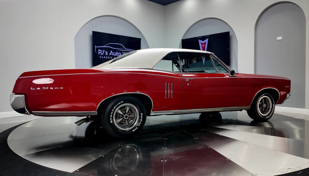 1967 Pontiac Lemans For Sale. 326 cubic inch V8 engine (correct YO suffix code block), power steering, detailed engine bay and underside, dual exhaust, automatic transmission, 14" Rally II wheels with new BF Goodrich Radial T/A tires, correct Regimental Red exterior, white vinyl top, black bucket seat interior, dual chrome mirrors, 3 spoke steering wheel, working factory AM radio, cold factory A/C updated with R134a refrigerant. Nothing beats the experience of owning a '60s era A body GM car, these cars offer an amazing ride and turn heads everywhere you cruise!!! With over 45 years of dedicated service to the collector car community, we've cultivated a wealth of knowledge and experience that we're eager to share with you. Whether you're a seasoned enthusiast or a curious newcomer, ou