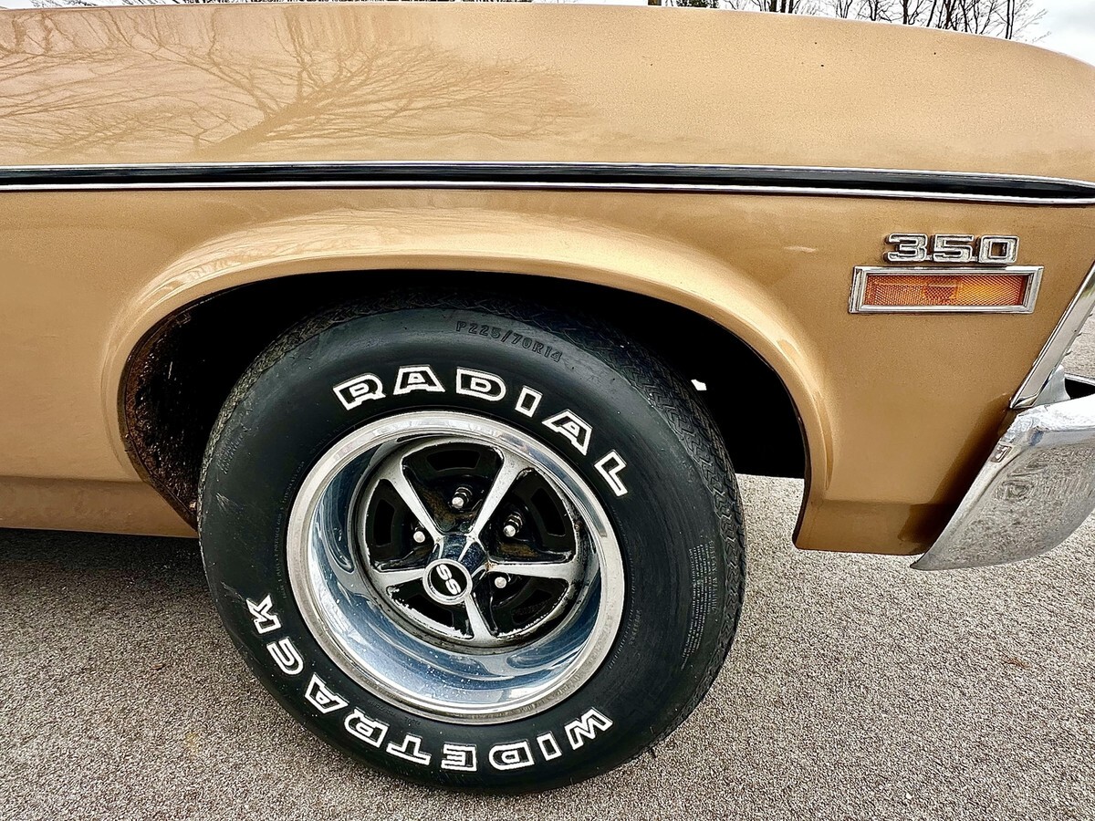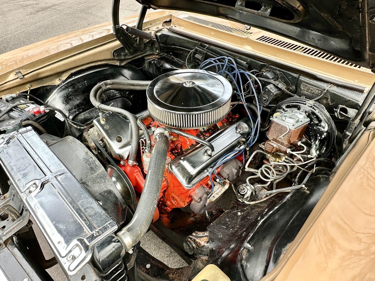 Under the hood sits the original numbers matching 350ci / 300HP V8, which starts easily, idles smoothly, and pulls strong through the rev range. The engine was painted Chevy Orange years ago and, while some peeling and light overspray are present, it still looks very good. A few aftermarket pieces like the air cleaner and valve covers have been added, but the engine bay remains largely original. The motor runs smoke-free with no valvetrain noise—an honest and healthy powerplant.