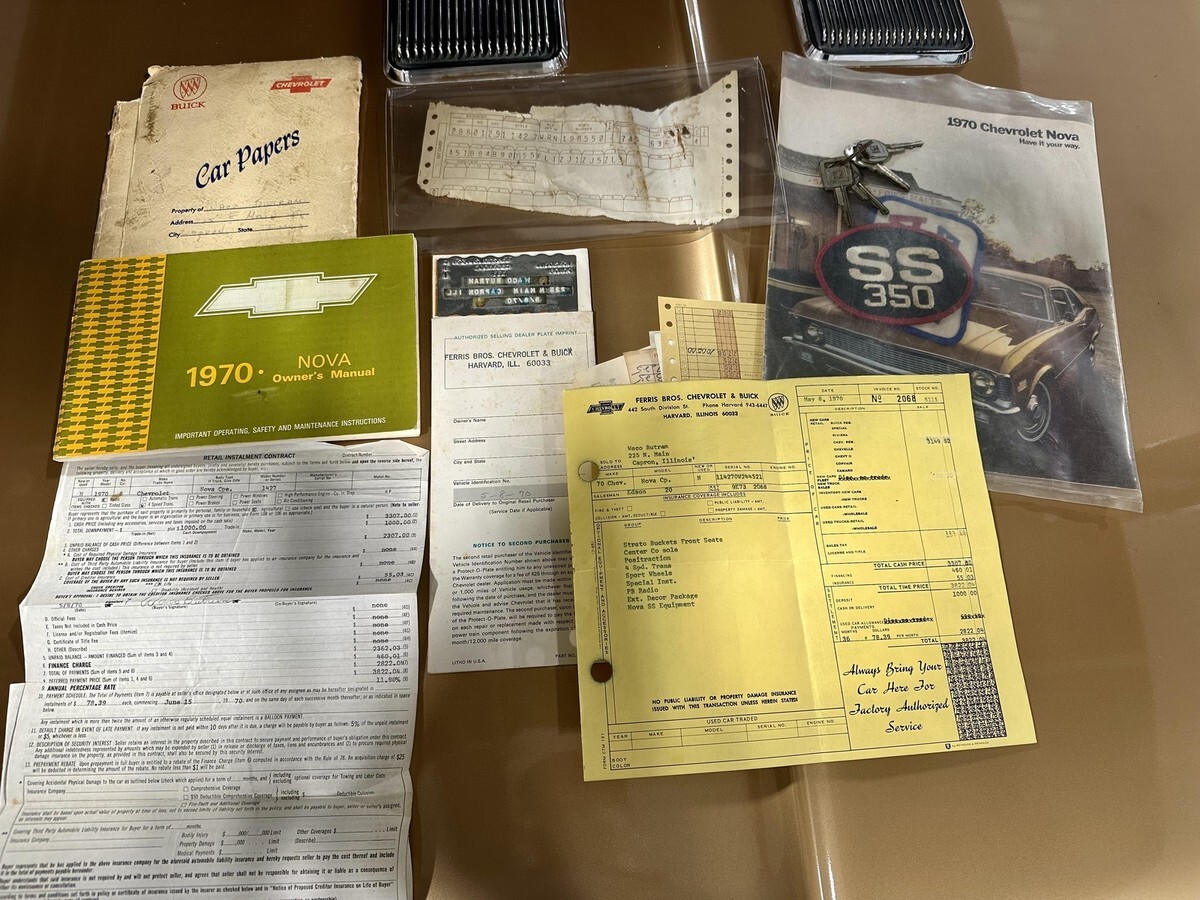 Offered here is an incredibly original and documented 1970 Chevrolet Nova SS 350, a true one-owner car from new with just 59,000 original miles. This survivor was sold new at Ferris Brothers Chevrolet & Buick in Harvard, Illinois, to Waco Butram on May 8, 1970, and has been meticulously preserved ever since. Included is an impressive trove of original documentation: the original bill of sale, finance contract, Protect-O-Plate, warranty booklet, original keys, dealer brochure, and even factory patches.