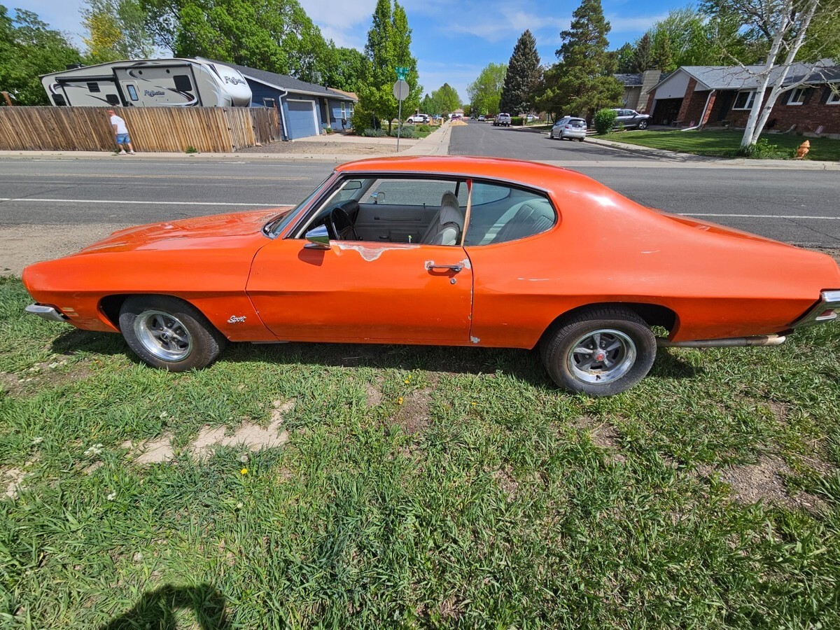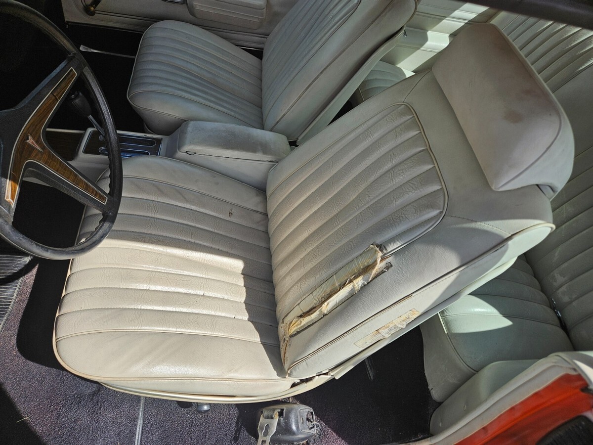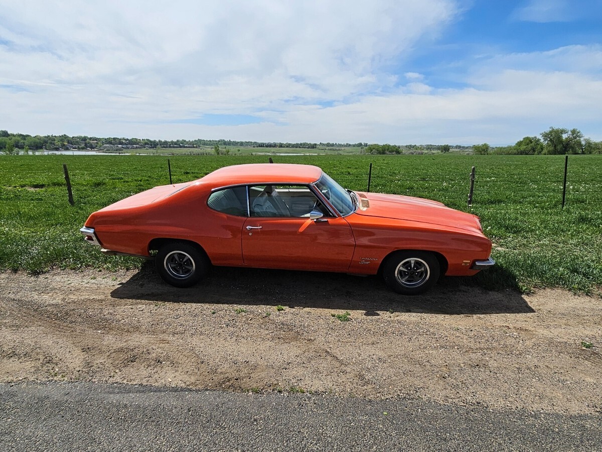 Hard to find, still running well Pontiac Lemans Sport. 2-door. I purchased this car in 2004 and have had little time to do much to her. Life got in the way. I had the radiator rebuilt, put on new tires and installed a custom exhaust. She runs great. I have taken her on long drives many times over the years. She is missing her drivers seat belt. I was told when I purchased her that she was a barn find and the owner I purchased her from only had her long enough to clean her up and repaint her. I was also told her mileage is correct. I cannot confirm either of these. With that, you can tell over the years she was not primed and her paint is chipping and her rust is showing. Coming from Pontiac MI, she has rust! Her numbers show she is all original. I pulled the information from PHS (Pontiac Historical Society) and have it available. 350, 288L with a 2 barrel carb, automatic, power steering, drum brakes all around. Ivory vinyl interior with buckets seats. Driver seat is torn. Carpet and the rest of the seats are in good shape. Her dash is weathered and torn. I have a plastic cover on it. Sundance orange now and originally. Shifter on the floor. There is no stereo and the A/C does not work and hasn't since I owned her. Engine ID matches per the information given from PHS. Her back brakes lock up. Not sure why. I've had her looked at and no one has been able to tell me how to fix them. Its time she goes to a home that will give her the TLC she deserves.