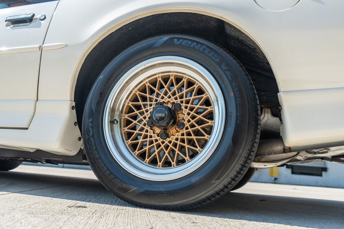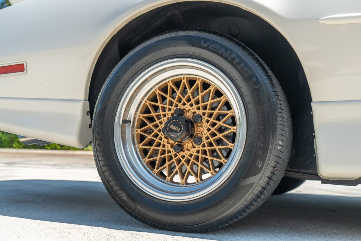 The car is finished in White (40) and features the Aero Package, which added revised front and rear fascias and side skirts. Additional equipment includes 20th Anniversary badging, Indianapolis Pace Car graphics, removable T-top roof panels, a rear spoiler, body-color side mirrors, quad exhaust outlets, and pop-up headlights. The 16" gold-finished diamond-spoke aluminum wheels are mounted with 245/50 Hankook Ventus V2 Concept 2 tires. The car came equipped from the factory with power steering and a revised suspension.