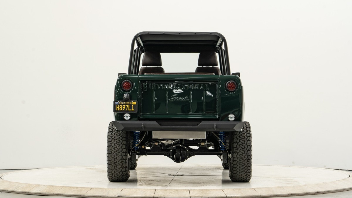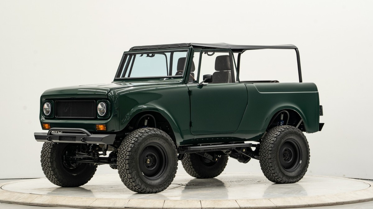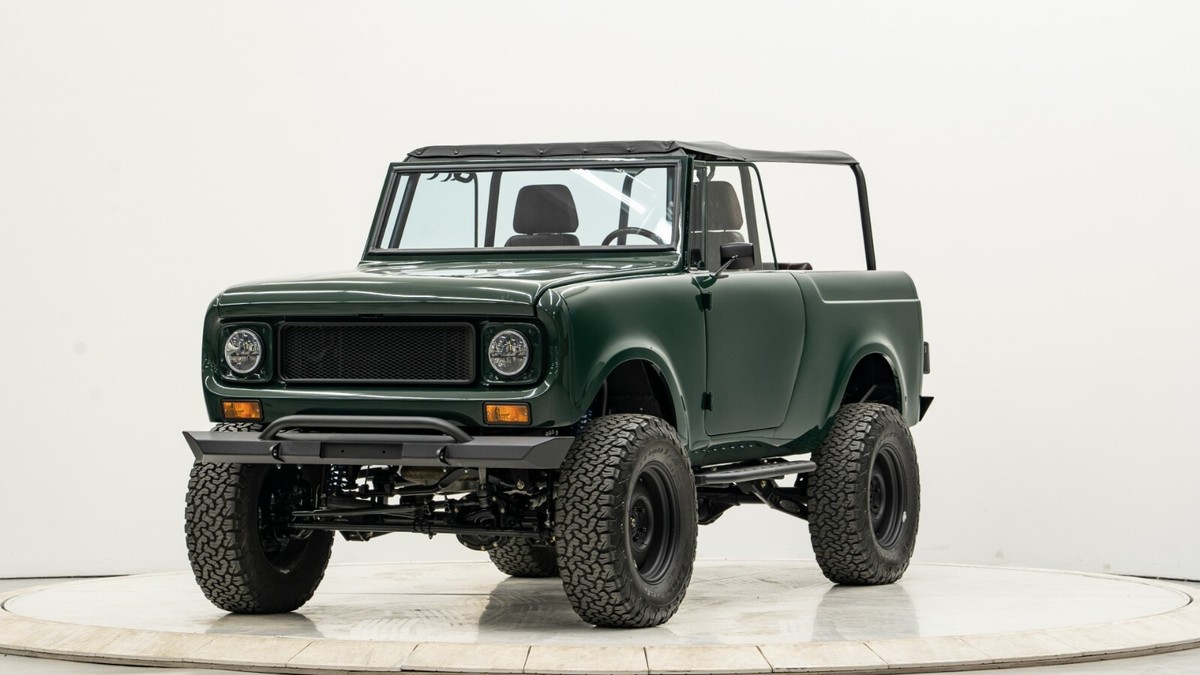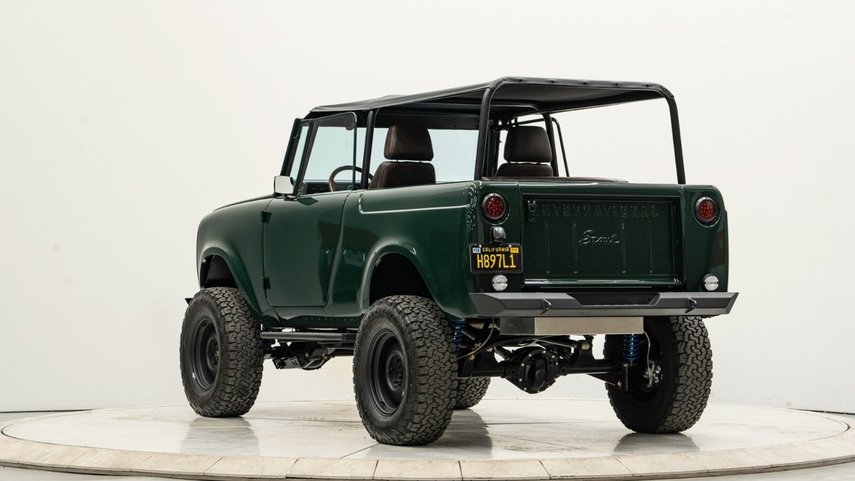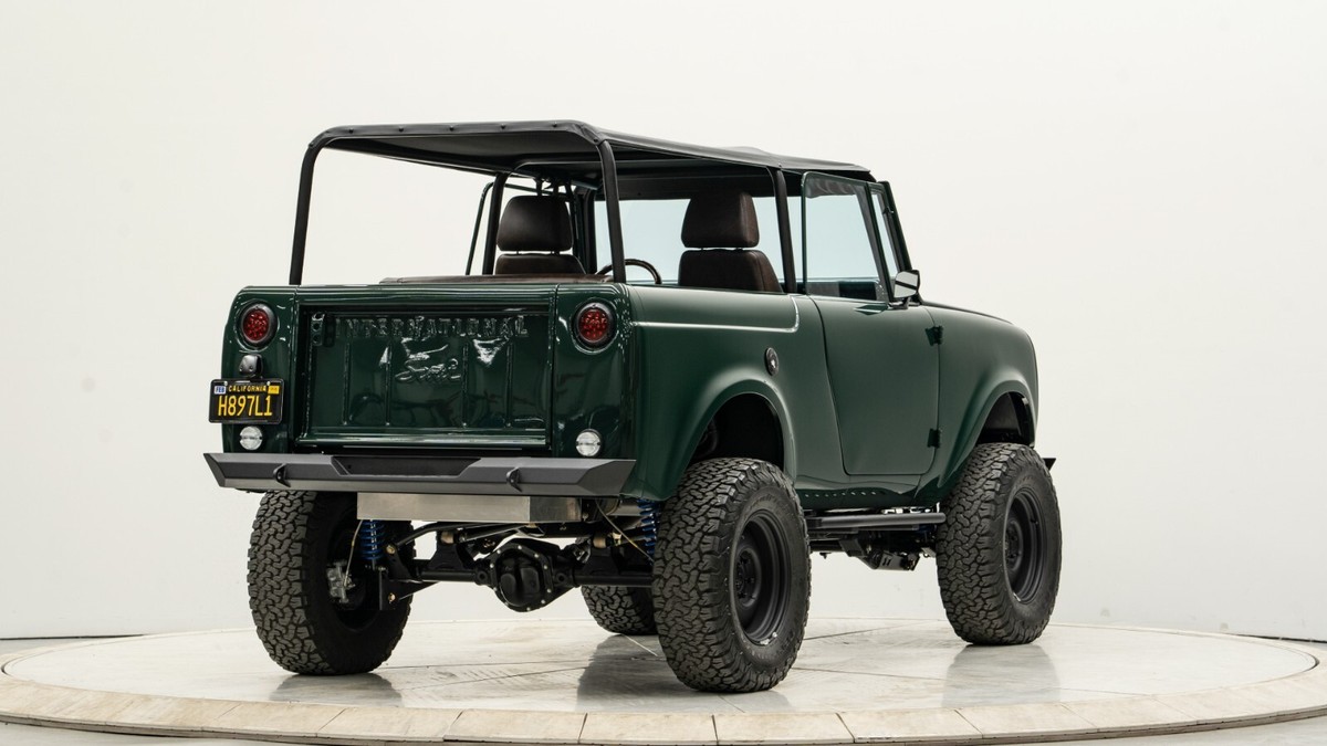 Finished in a striking Verde Albertone green hue, this custom Scout exudes timeless charm with a modern edge.Custom features like shaved door handles streamline its look, while 17-inch steelies wrapped in 32-inch BFG KO2 all-terrain tires complete its off-road stance. The TK1 Racing stabilizer and four-wheel disc brake kit ensure control and safety over the roughest terrain.
