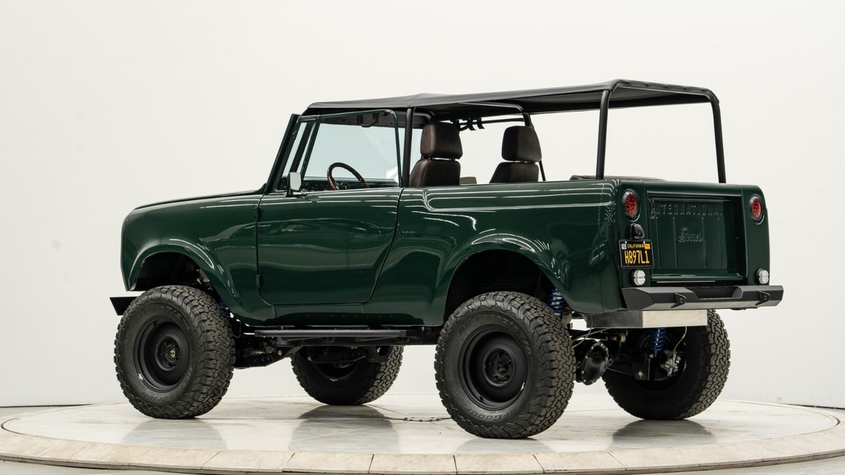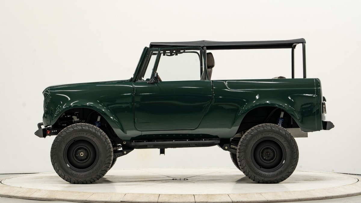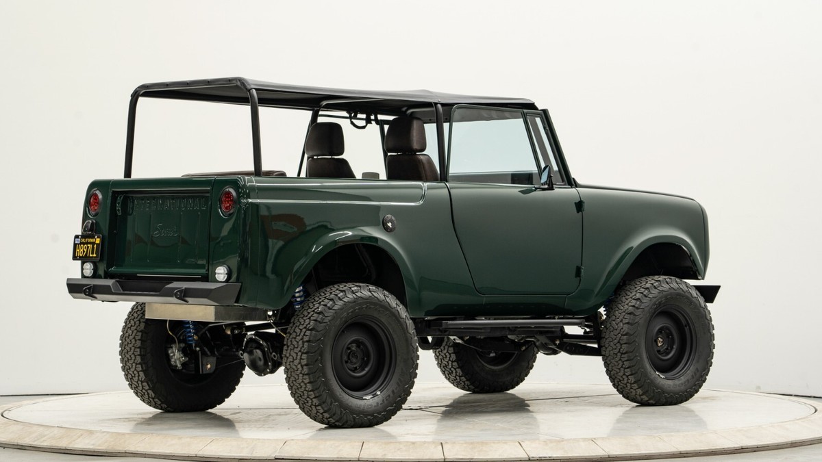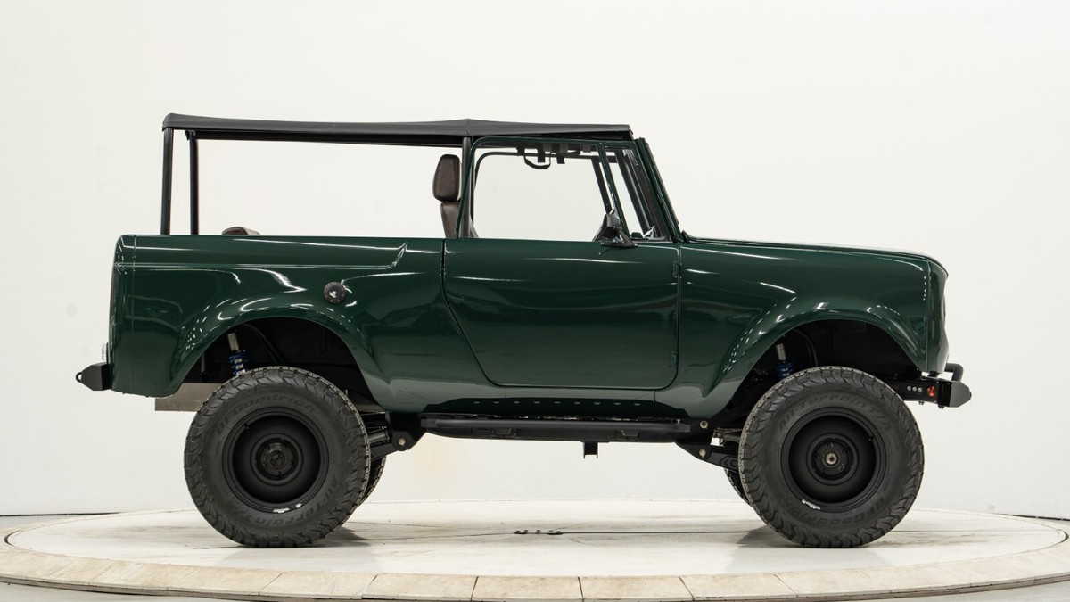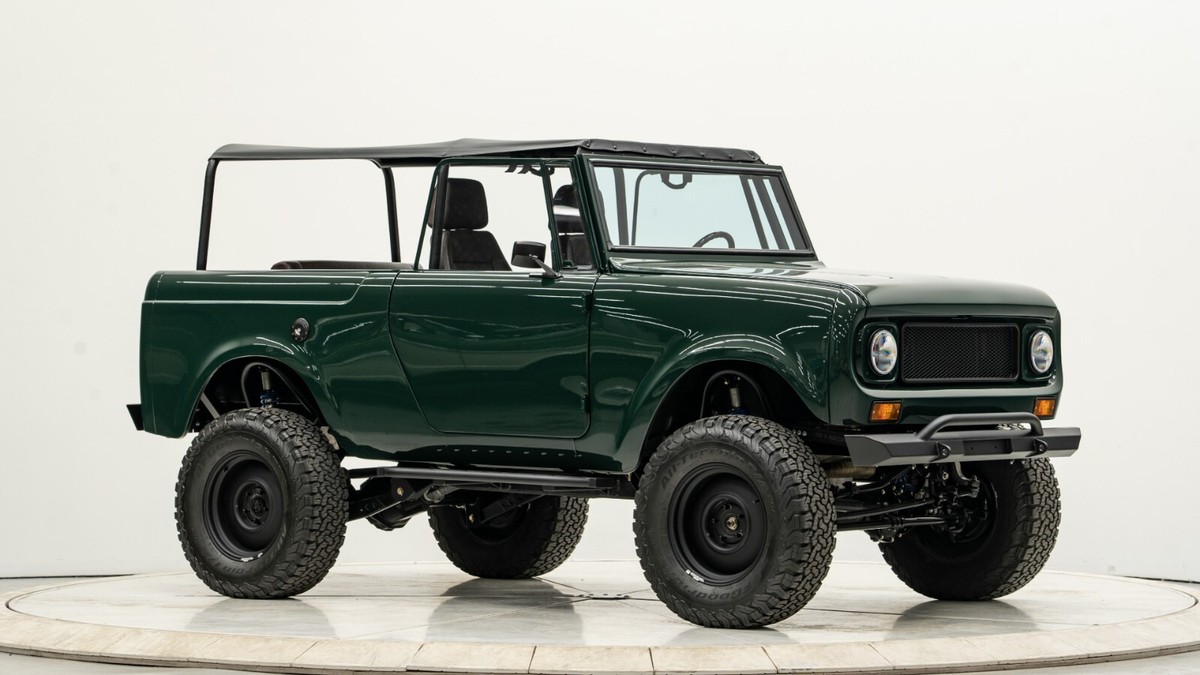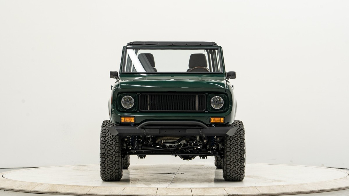 Finished in a striking Verde Albertone green hue, this custom Scout exudes timeless charm with a modern edge.Custom features like shaved door handles streamline its look, while 17-inch steelies wrapped in 32-inch BFG KO2 all-terrain tires complete its off-road stance. The TK1 Racing stabilizer and four-wheel disc brake kit ensure control and safety over the roughest terrain.