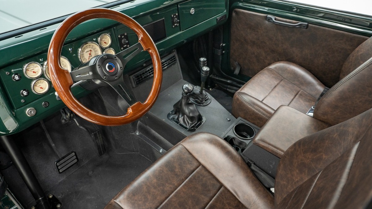 Inside, the cabin revealstobacco-colored bespoke leather upholstery and a Dynamat-lined interior for a quiet, luxurious ride. Modern conveniences like power windows, power door locks, and a Vintage Air HVAC system provide contemporary comfort. The custom leather door cards, locking center console, and vintage-style gauge set from Classic Instruments blend seamlessly with the Scout’s heritage.Stay connected and entertained with a Pioneer head unit featuring Apple CarPlay, driving an Audiofrog speaker set for crystal-clear sound.