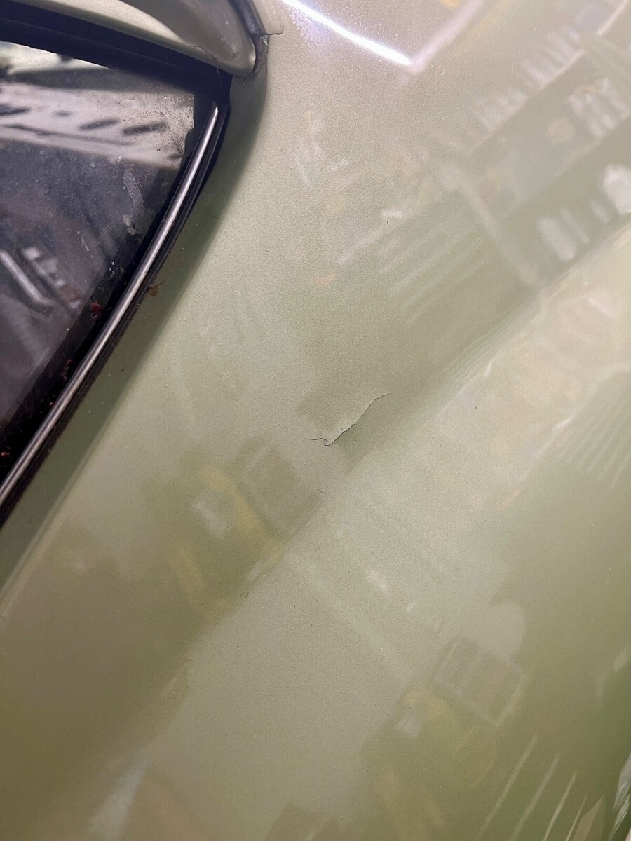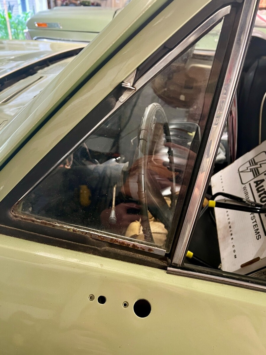 - New fenders, quarters, trunk pan and trunk lid. It was professionally painted back to the factory frost green. Does have very small grinding spots on back quarter glass.