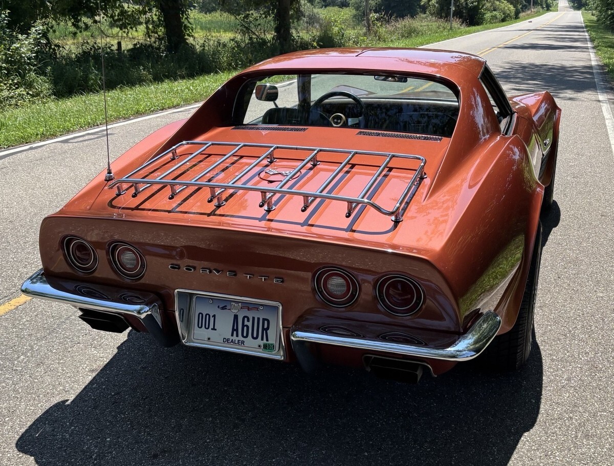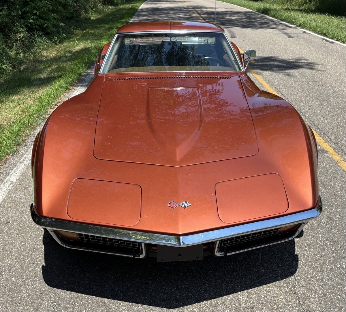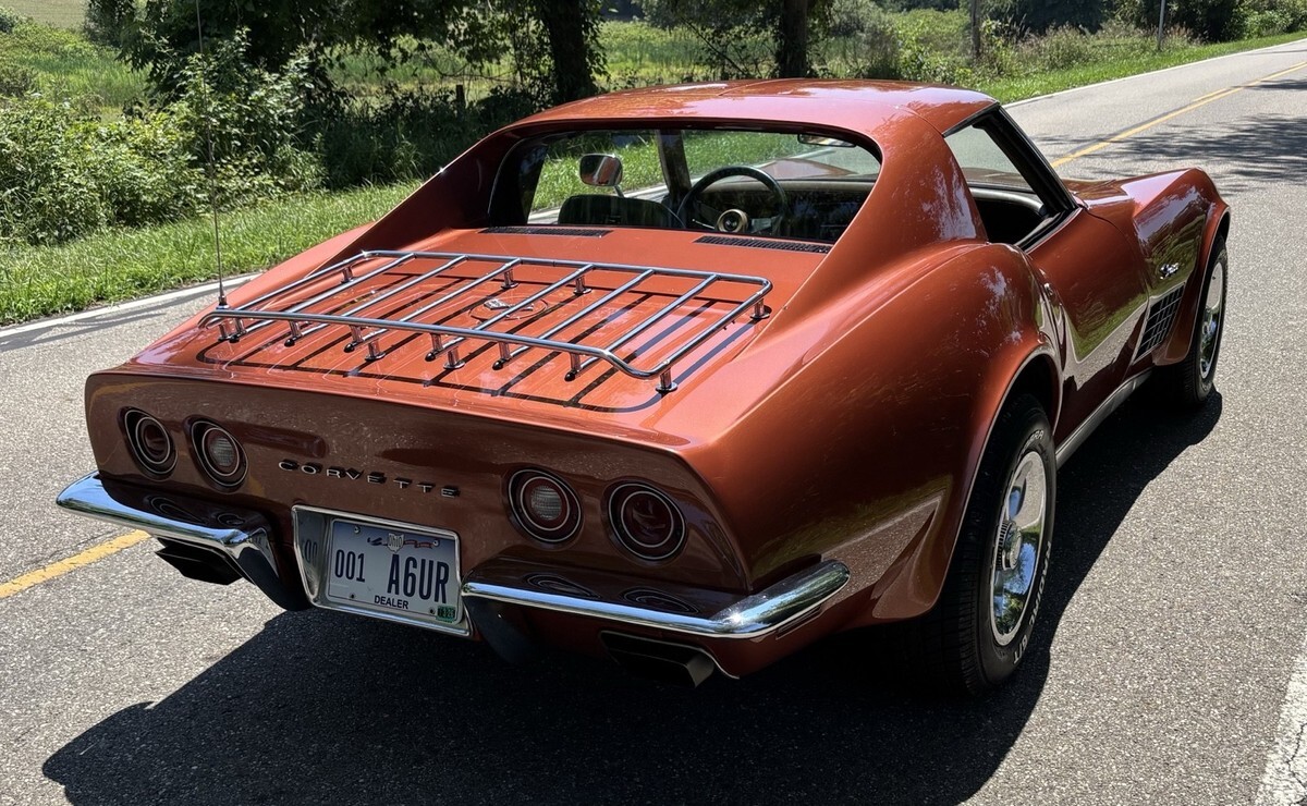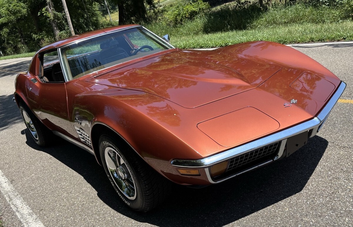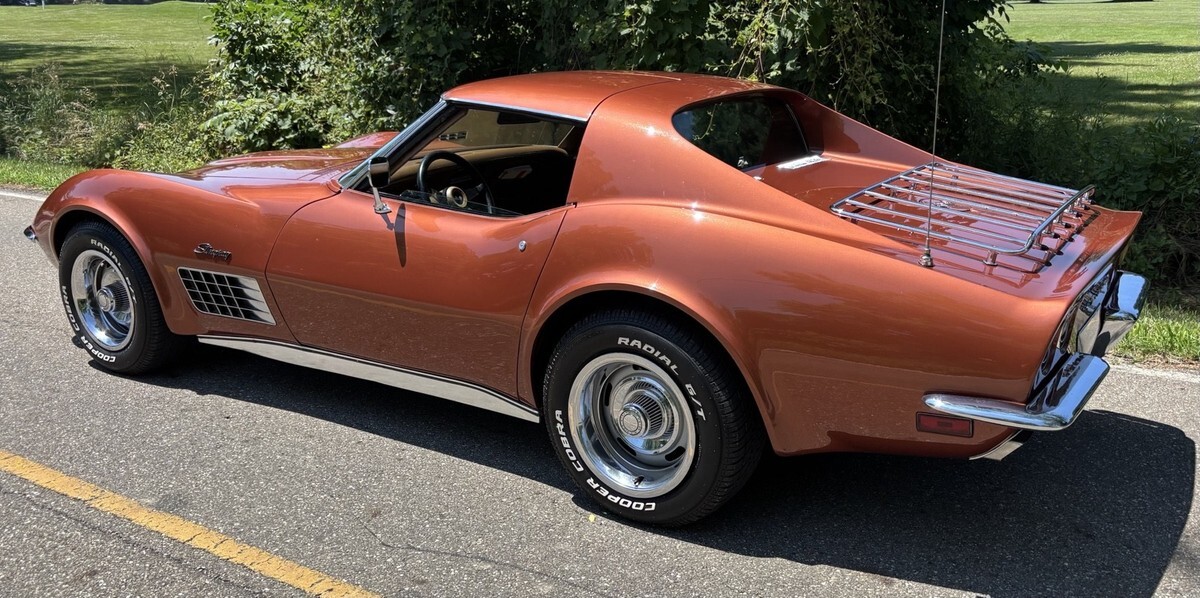 This is a 1972 Corvette that appears to be the 50th one built for that model year “first day production”. It was a factory warbonett yellow that a previous owner had resprayed Corvette Bronze. The paint that is on it is beautiful condition with very little chips or imperfections. This is a numbers matching engine that seems to run very good. It has newer tires that are in good shape.
