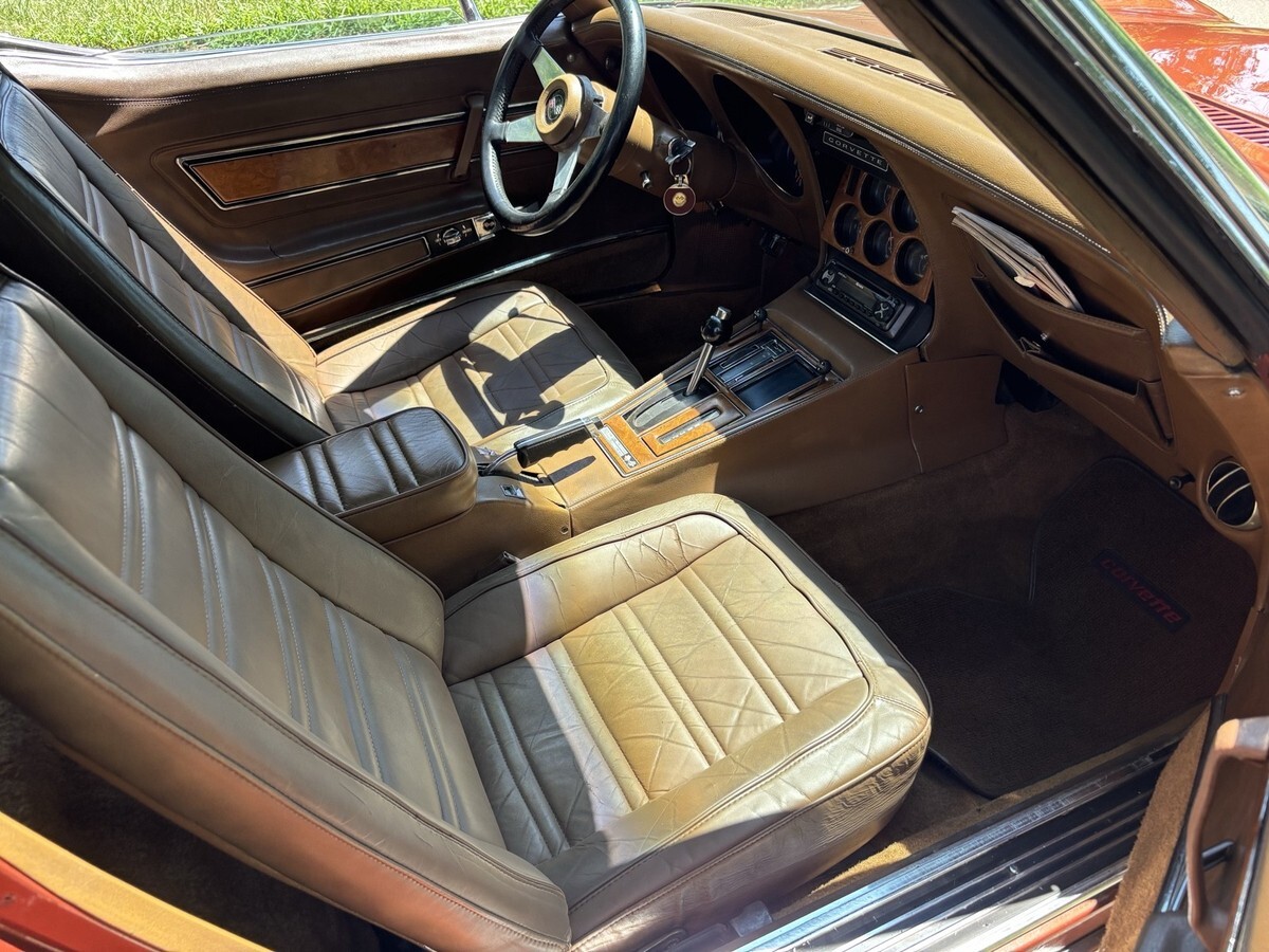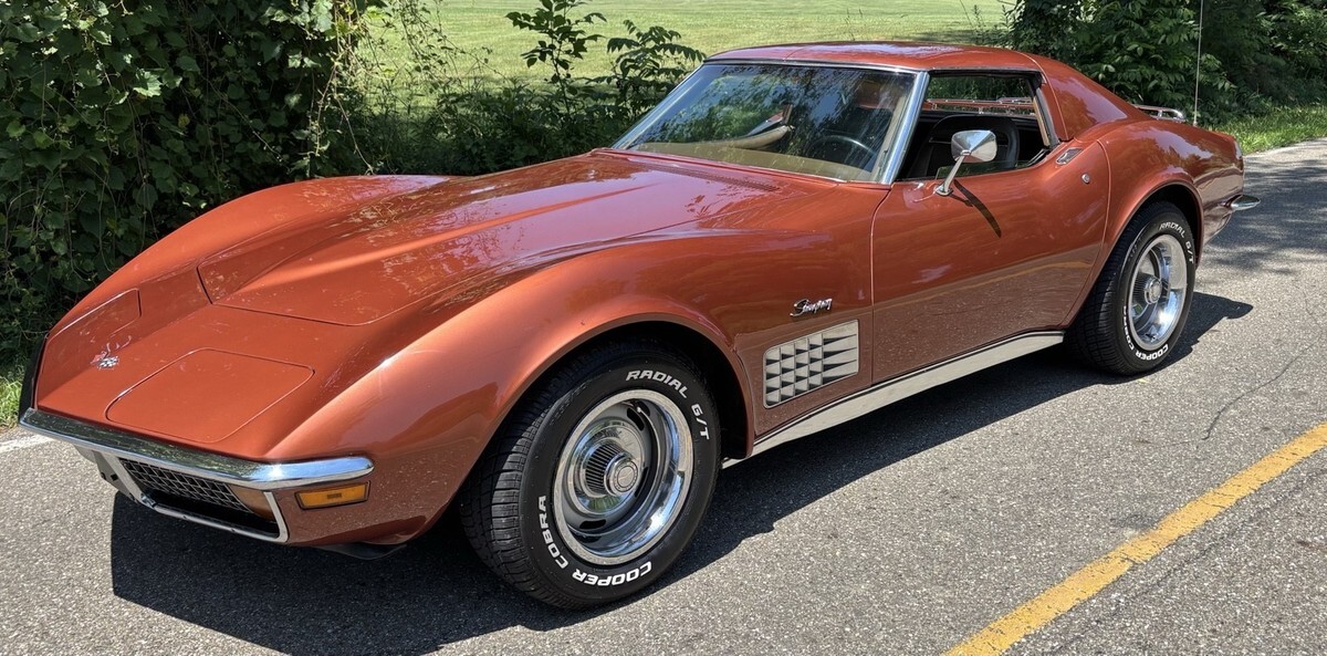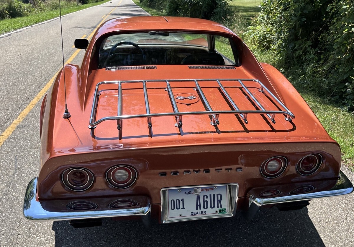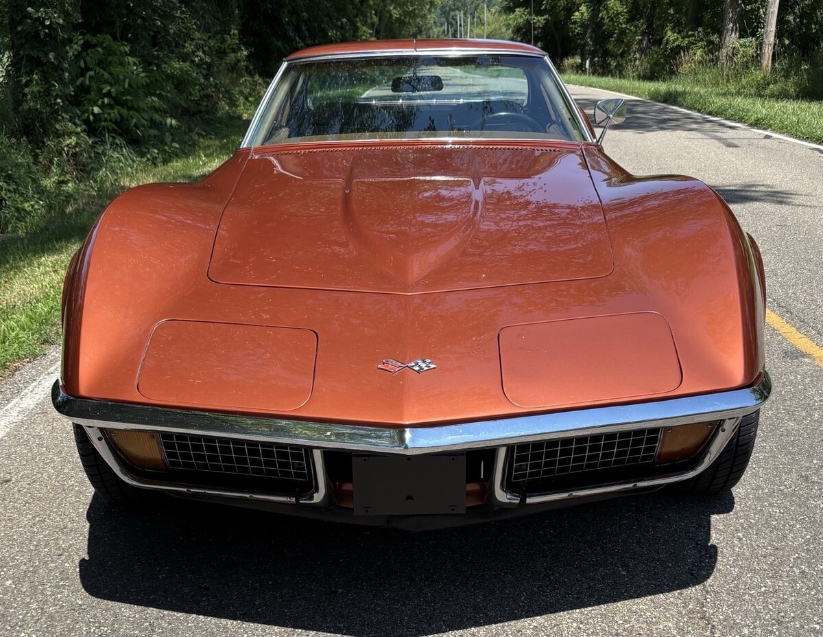 This is a 1972 Corvette that appears to be the 50th one built for that model year “first day production”. It was a factory warbonett yellow that a previous owner had resprayed Corvette Bronze. The paint that is on it is beautiful condition with very little chips or imperfections. This is a numbers matching engine that seems to run very good. It has newer tires that are in good shape.