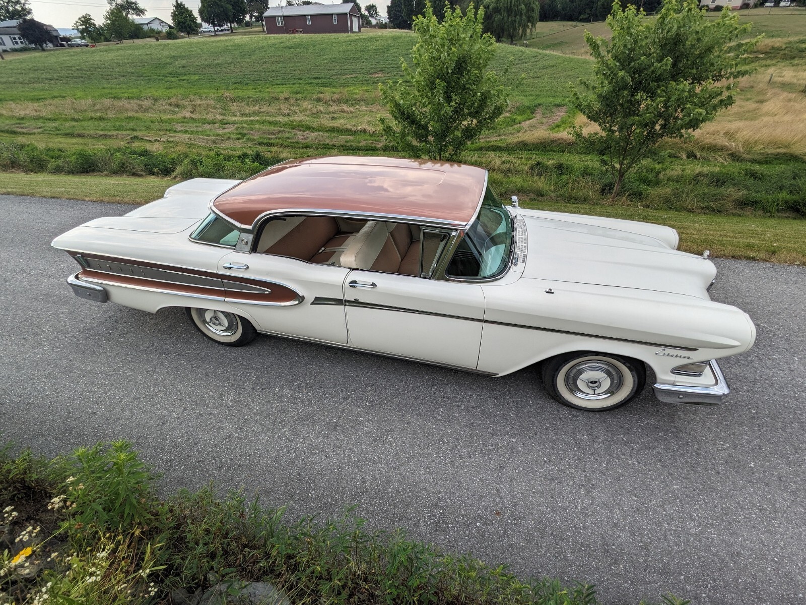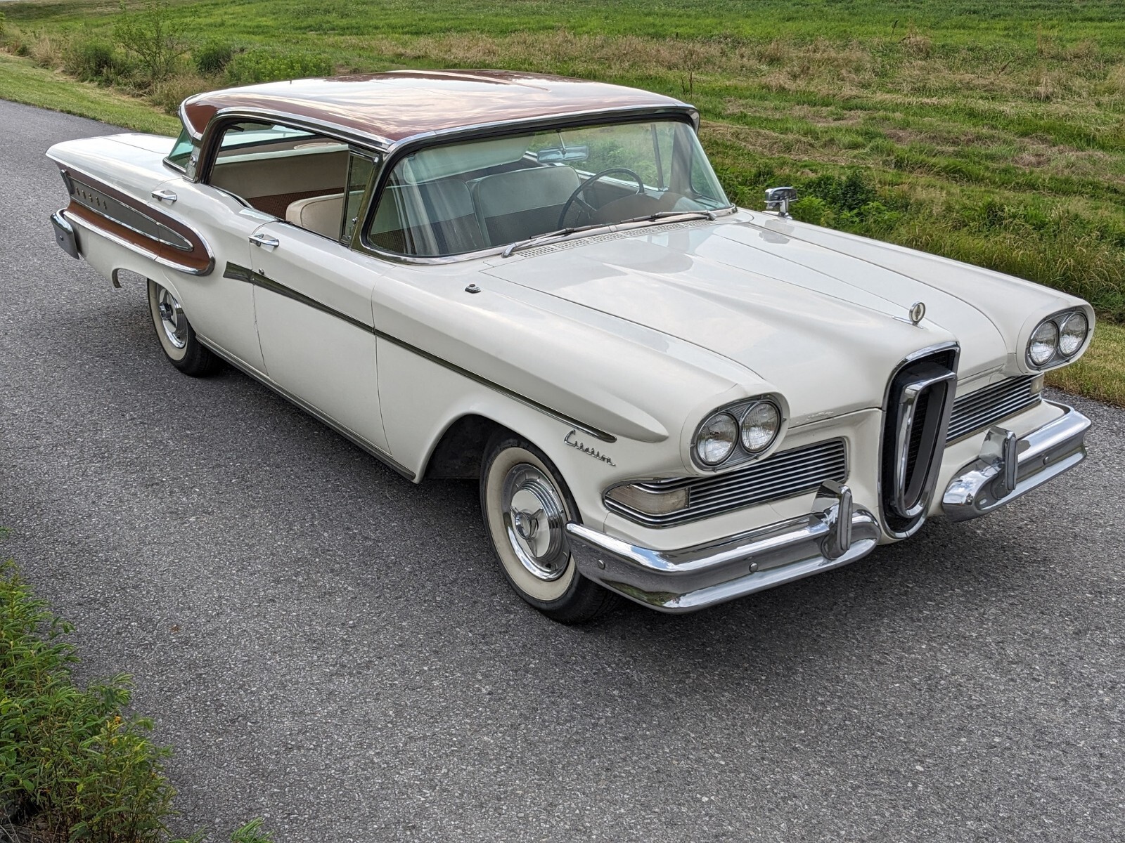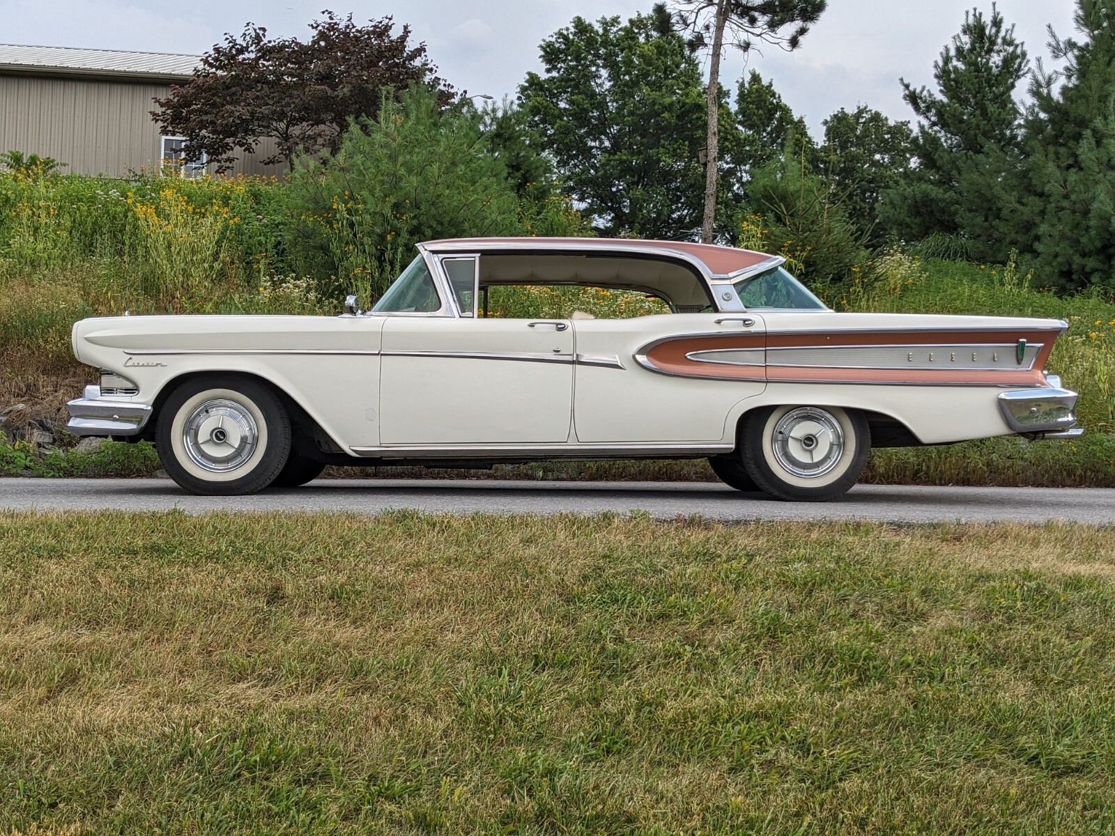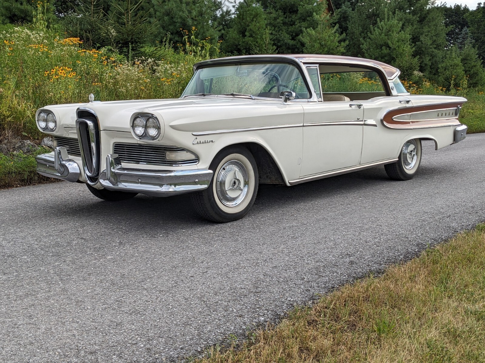 1958 Edsel Citation 4 Door Hardtop in white and copper metallic paint. 95k original miles. Early electric wiper car, (discontinued September 1957). Spent the majority of its life in the mid-west. Very good, solid condition - paint has some scratches, chips, and peeling. Road worthy with recent brake work. Tires are in good condition but older. Comes with original brake booster and other small parts. Please ask any questions before bidding. VIN X8SX703700 Body 57B EUE AB 16H 4 A