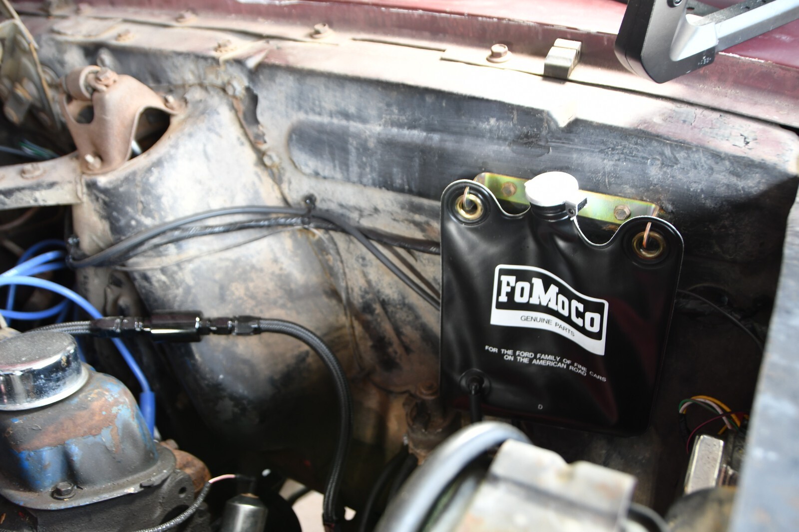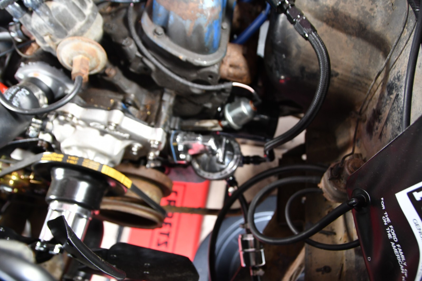 The 289 V8 engine (a period-correct replacement from a 1965–66 Mustang, installed ~1978), clutch, and 3-speed transmission are present but need rebuilding. The engine presently turns over using the starter.