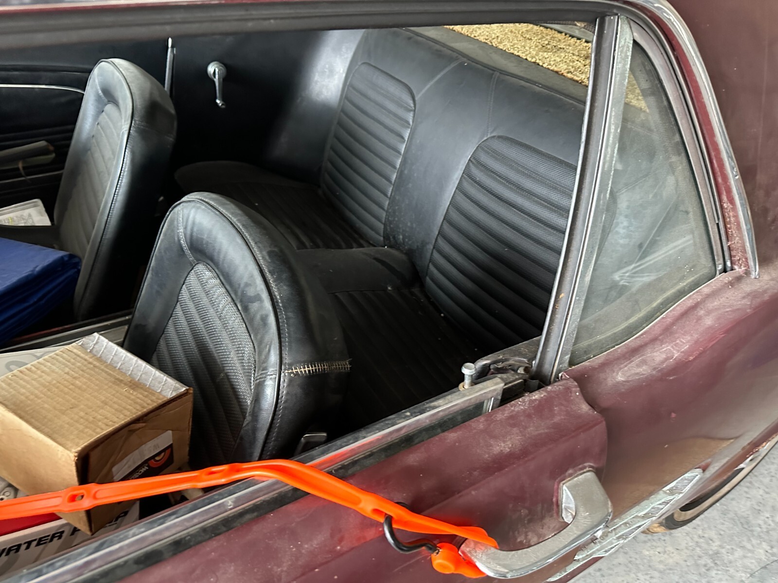 Original interior with damage to the driver’s seat from mice. A salvaged center console—likely from a '66 model—was added and painted black to match. AM radio condition is unknown; heater fan is non-functional. - Powertrain: