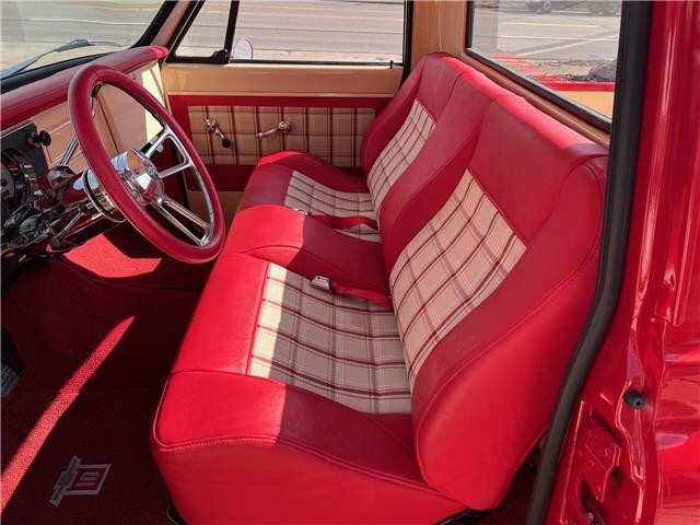 480 miles on Frame Off Restoration, clean Tennessee truck, stunning PPG Victory red & Chrysler cream paint scheme, custom two-tone plaid interior, 5.3 LS EFI engine with GM controller, Edelbrock cold air kit, BTR Stage II camshaft, ceramic headers, Chevrolet script valve covers, power steering, power front disc brakes, Vintage air conditioning, March aluminum pulley’s & brackets, 4L60 automatic overdrive transmission, custom bench seat, chrome Ididit tilt column with billet wheel, Dakota VHX gauge cluster, H-pipe dial exhaust, 12 bolt 3.73 limited slip rear axle, custom fuel tank, 295/40ZR20 rear tires, 245/45ZR20 fronts, 20” Billet Specialties Tech 5 wheels, new glass, custom hood, Ready to Cruise!