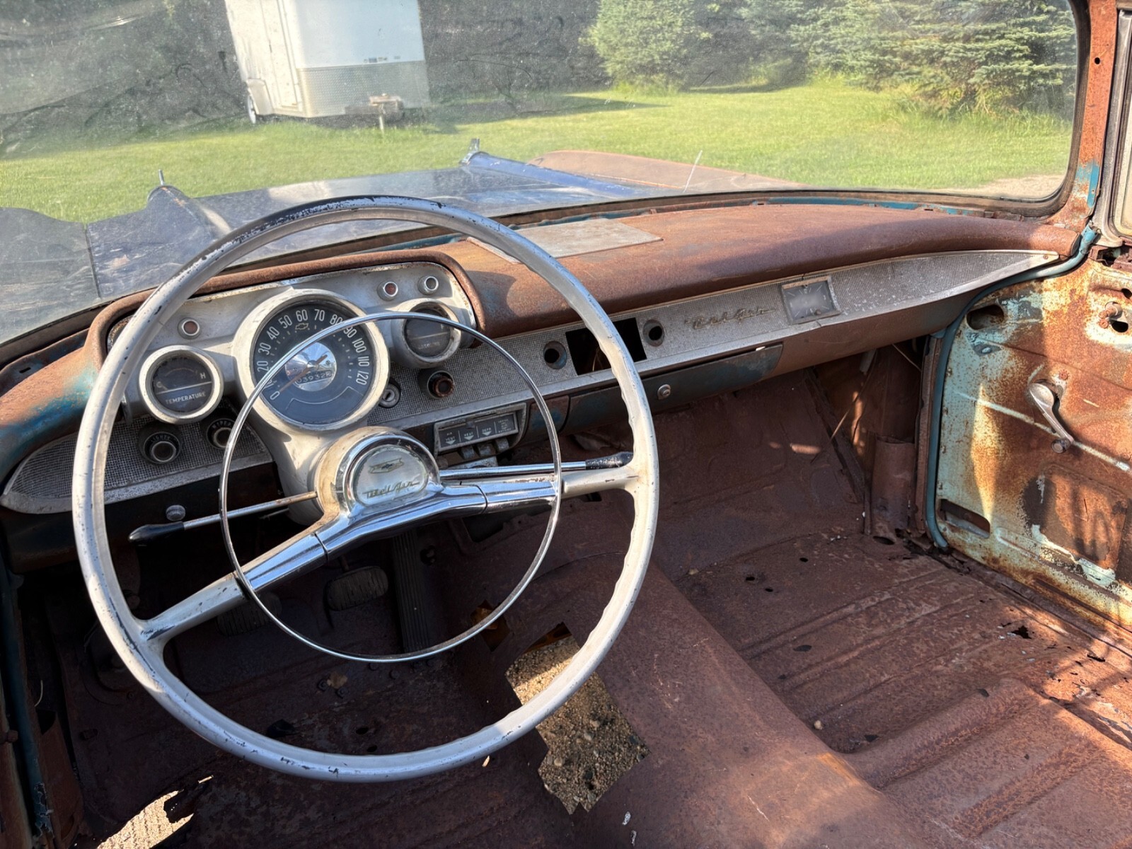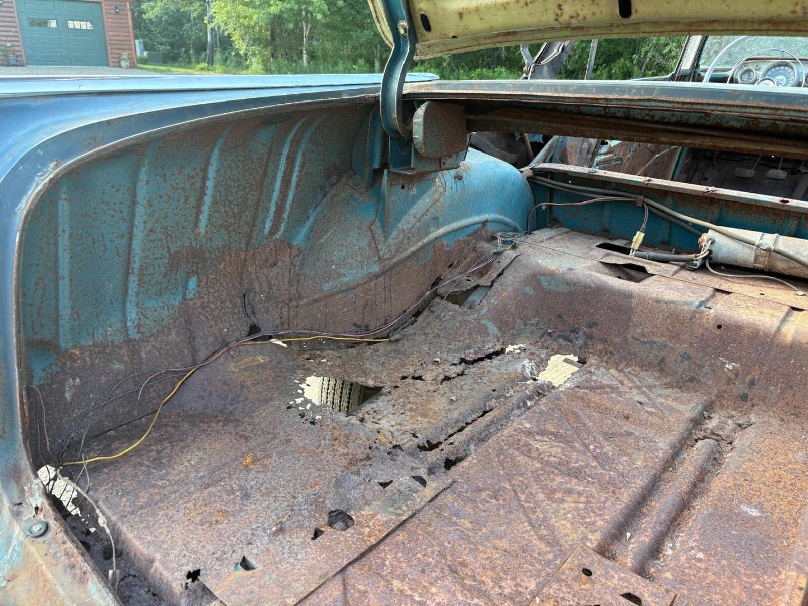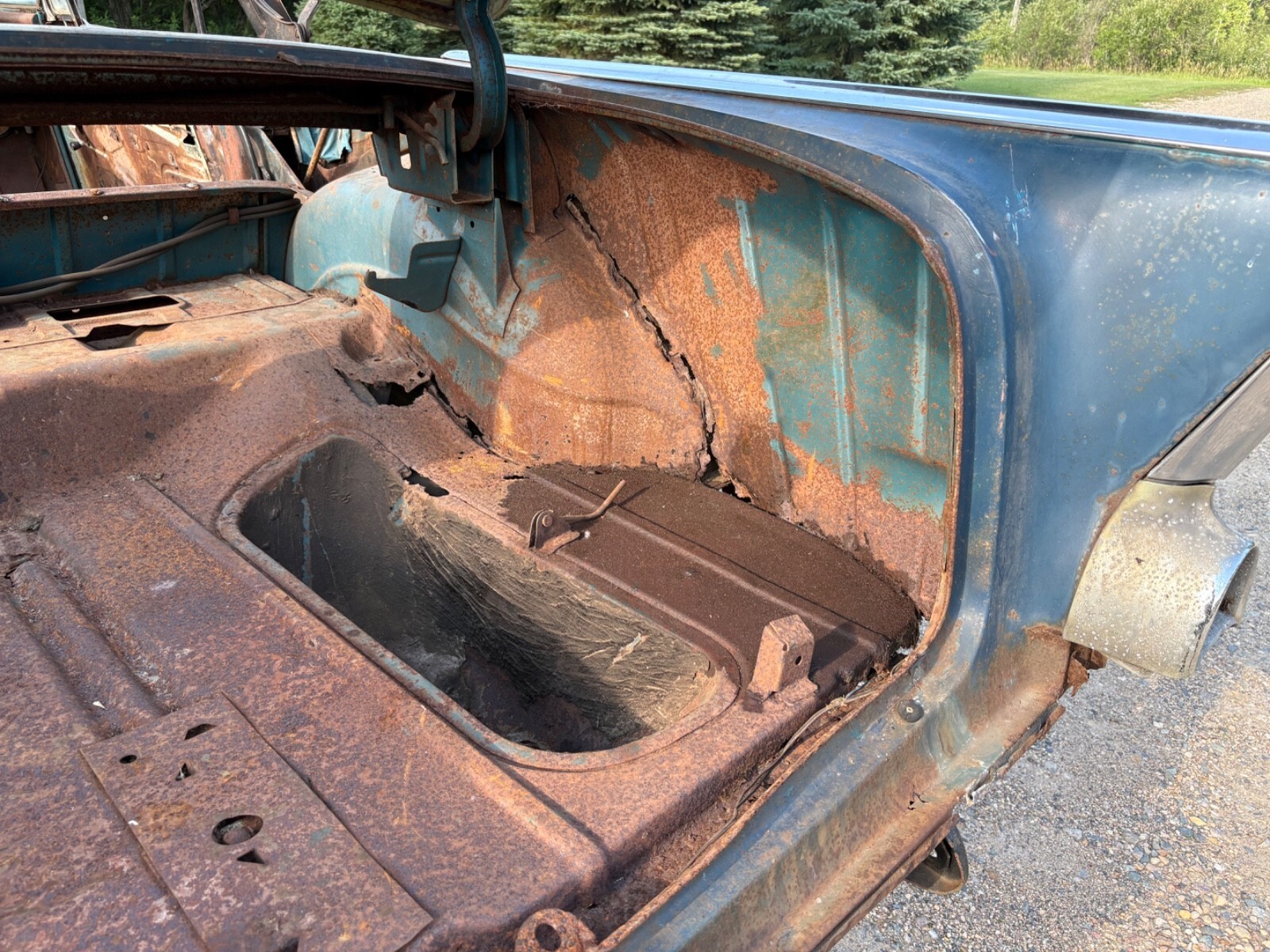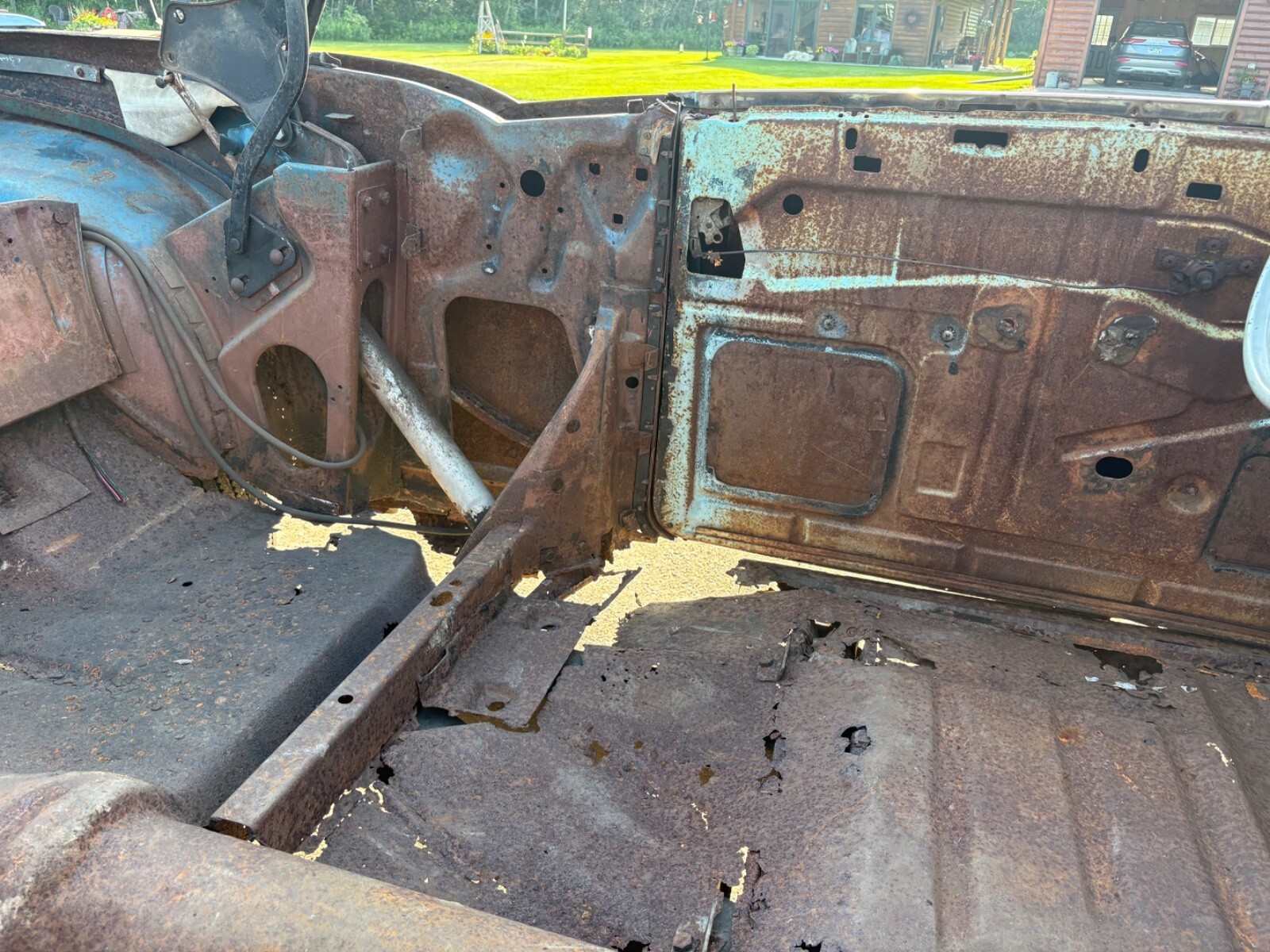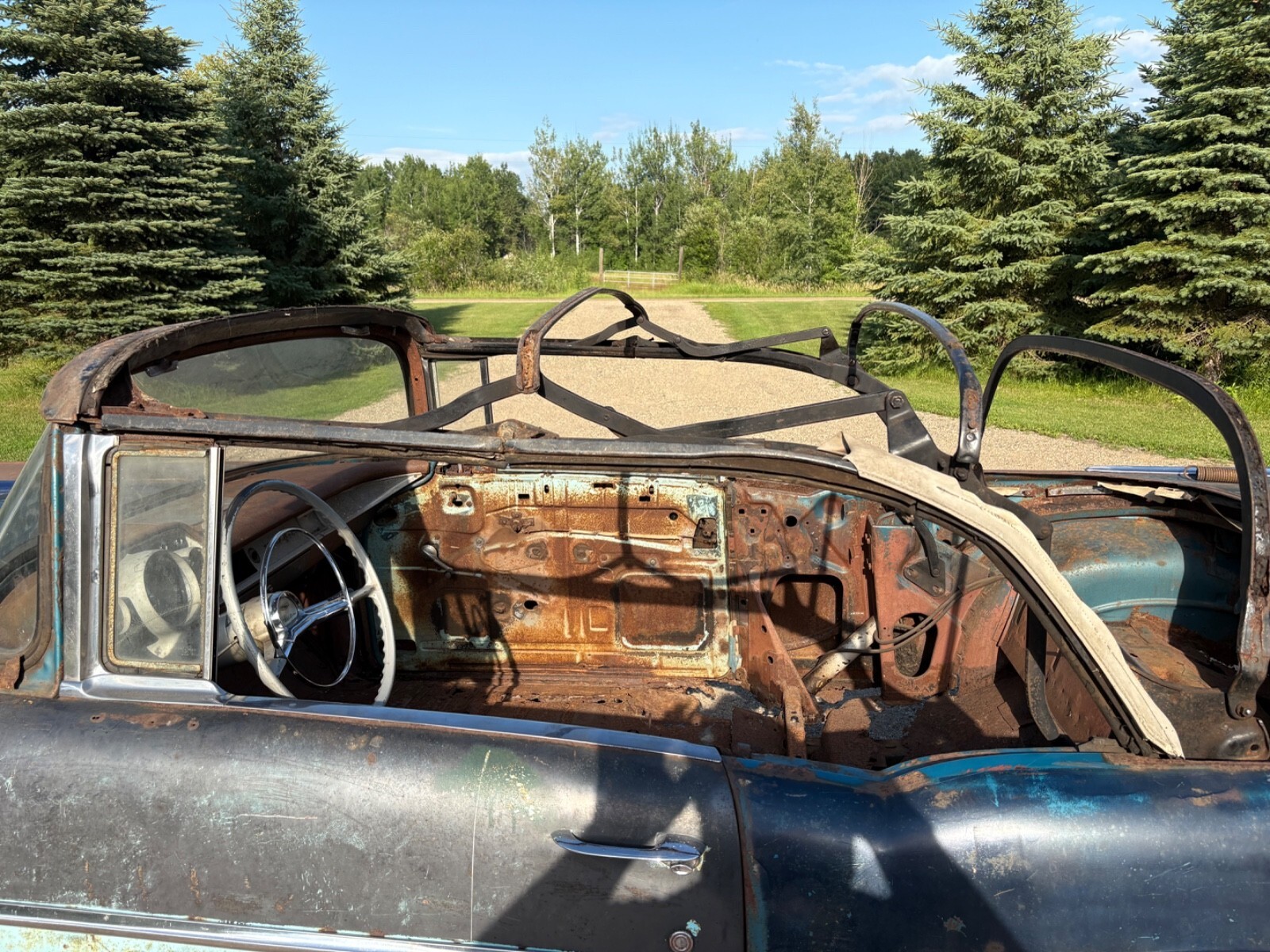 The Floor and trunk pans are rusty, and need replacement. The rockers are rusty The doors open and shut and are mostly complete. The convertible top frame is in usable condition. Car does not have seats. Trunk lid is usable. Engine is an original 1957 Chevrolet 283 with two barrel carburetor. The engine turns over freely, but is not 100% complete. Missing exhaust manifolds and various unknown parts. This engine is a good rebuildable original 57 283. This car was a manual shift car but currently does not have a transmission.