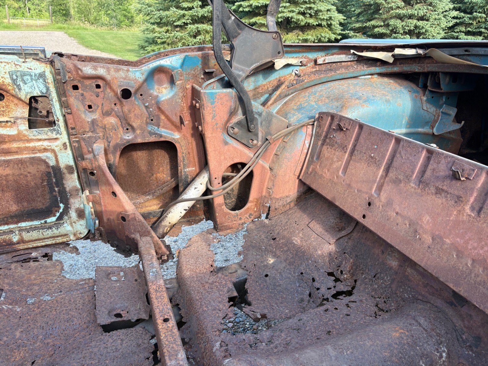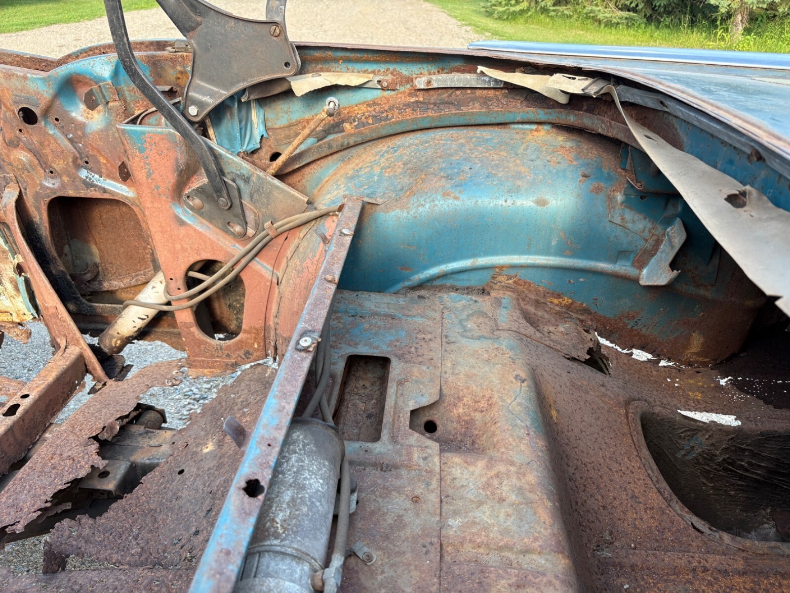 The frame has been blasted and painted some years ago prior to my ownership. It is overall usable but does have a few areas that will require repair In the rear area of the skid plates. This car needs a lot of work but is a good start for someone wanting to build a real 57 Chevy convertible.