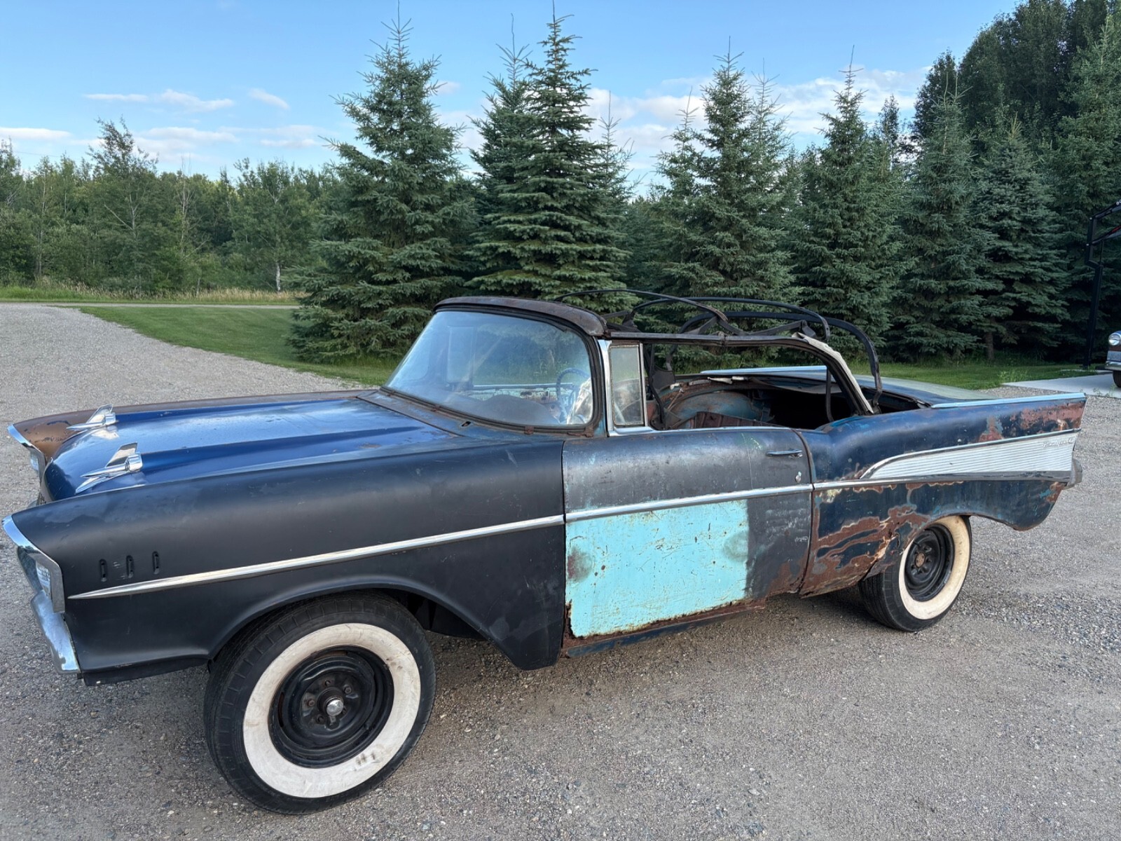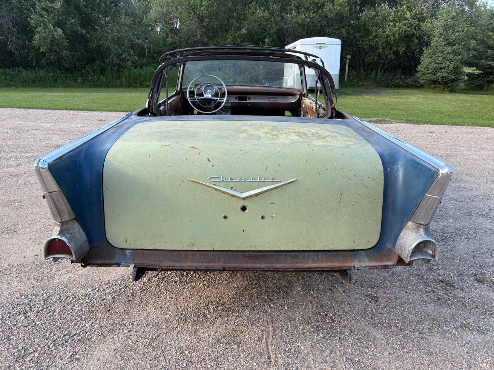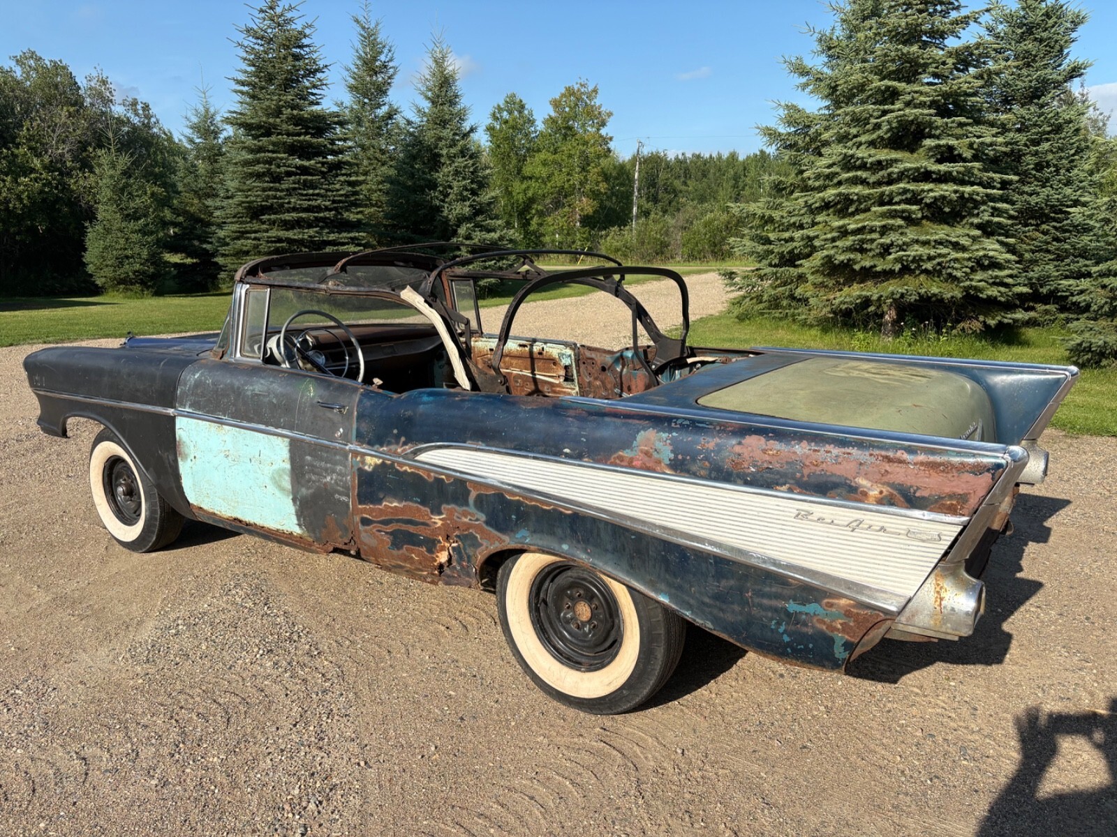 Up for sale is a 1957 Chevrolet Bel Air convertible project. This car was harbor blue from the factory. It still wears its original Vin tag and trim tag. The car has a clean title.This car needs a total restoration. What you see in the photos is what goes with the car, but I will also be including a pair of inner fenders and the fresh air ducts.