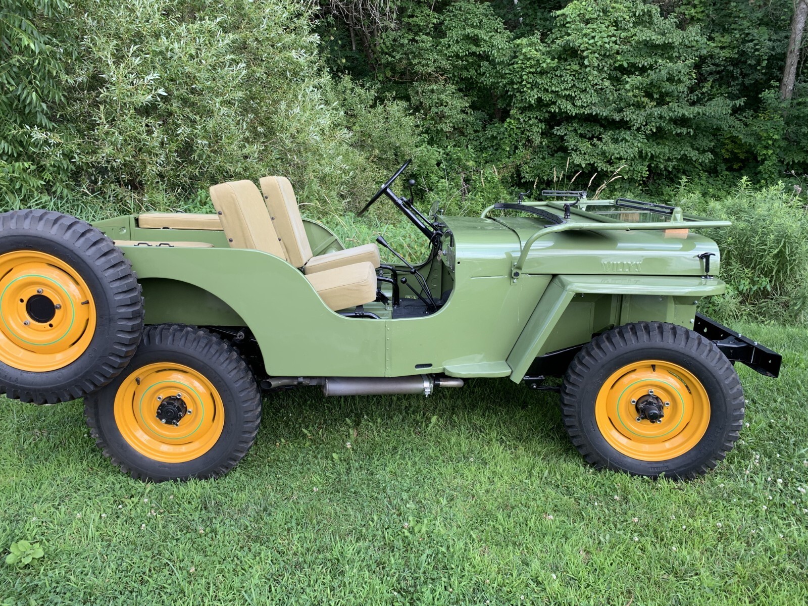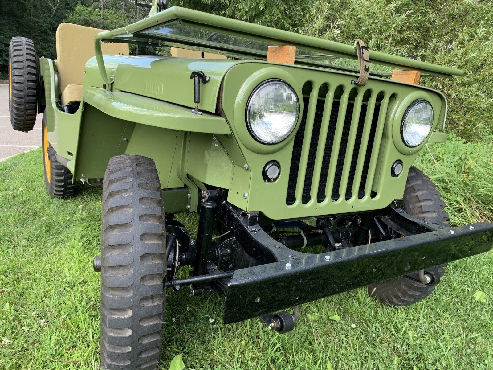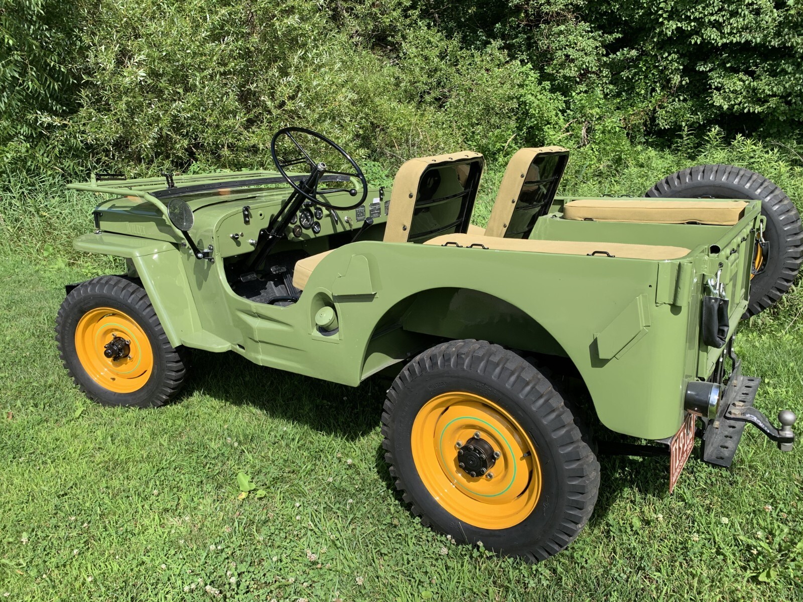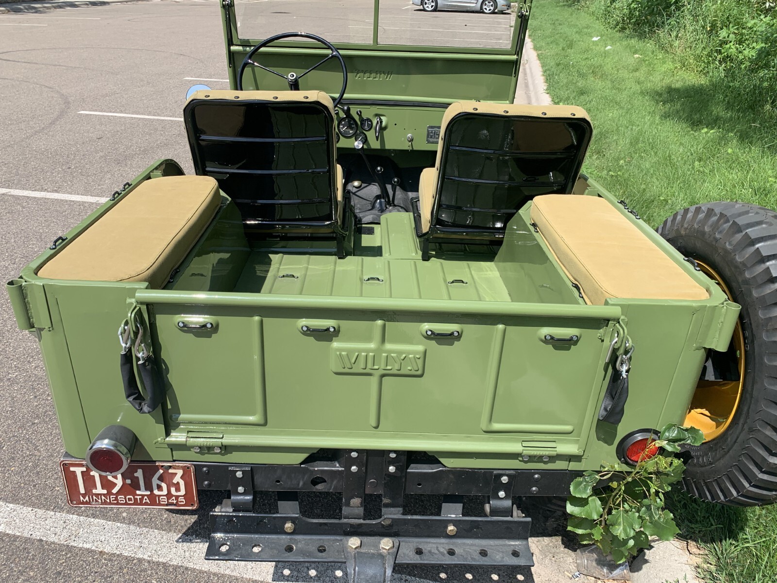 1945 CJ2AWillys Jeep. Frame off restoration brought back to near stock condition "as purchased new" as it came off the line. Original engine freshened up with rings, bearings and seals. Transmission is the correct side-shifting "3 on the tree". Rebuilt period correct transfer case and over-drive added for drivability. From the new front bumper to the rear hitch, it is a remarkable vehicle. VIN number is 11793 so only 1792 CJs were made before this one. Thought to be only one of 100-200 surviving stock 1945 left making this a rare one. If a part wasn't replaced it was carefully sandblasted and repainted to maintain stock status. I have receipts for most parts that now make up this unique vehicle.