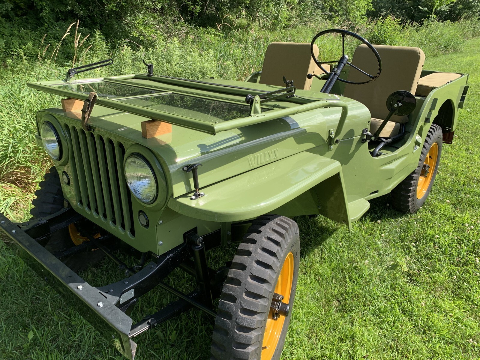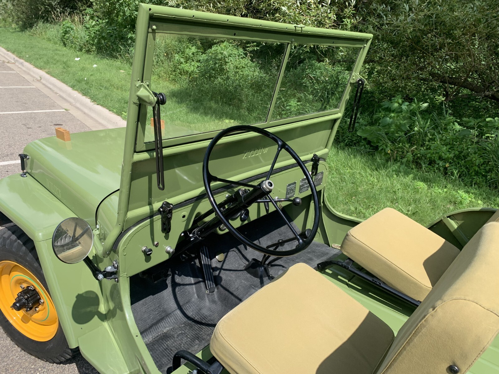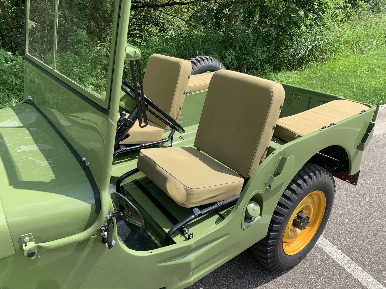 1945 CJ2AWillys Jeep. Frame off restoration brought back to near stock condition "as purchased new" as it came off the line. Original engine freshened up with rings, bearings and seals. Transmission is the correct side-shifting "3 on the tree". Rebuilt period correct transfer case and over-drive added for drivability. From the new front bumper to the rear hitch, it is a remarkable vehicle. VIN number is 11793 so only 1792 CJs were made before this one. Thought to be only one of 100-200 surviving stock 1945 left making this a rare one. If a part wasn't replaced it was carefully sandblasted and repainted to maintain stock status. I have receipts for most parts that now make up this unique vehicle.