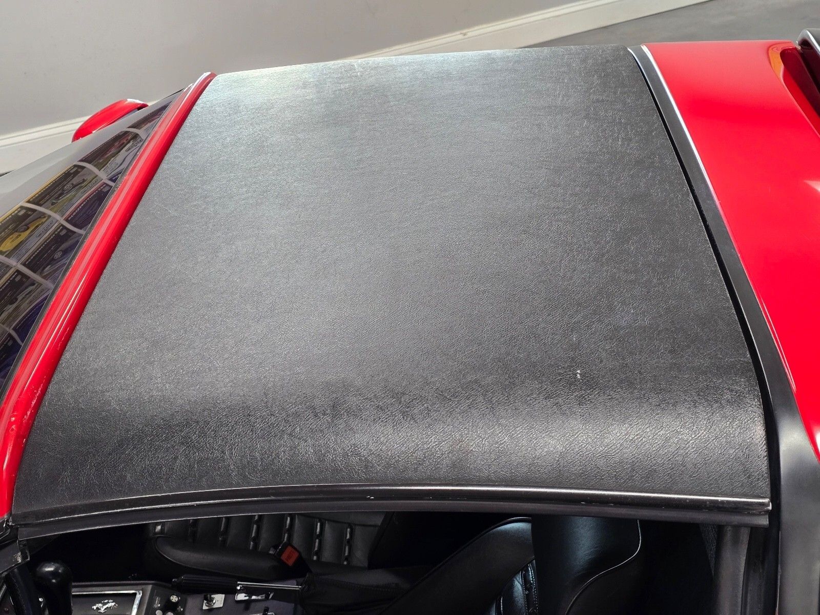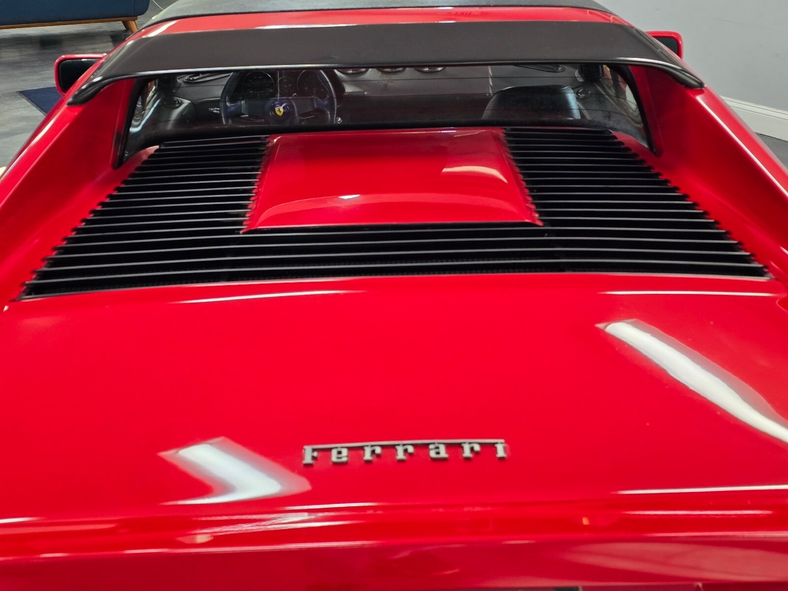 The three-spoke steering wheel has a Ferrari badge and a Ferrari-logo center emblem. A 180-mph speedometer has been installed, and its six-digit odometer shows 7k miles.