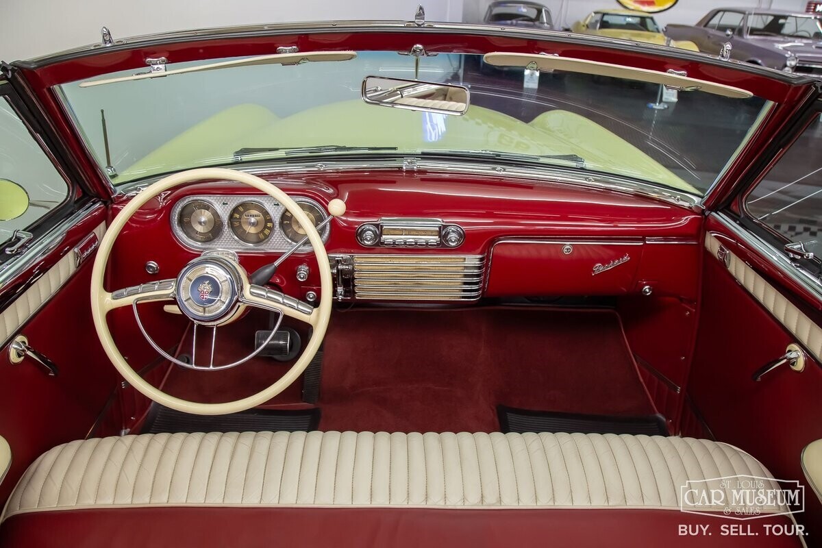 We are pleased to offer the collector car market a stunning 1953 Packard Caribbean Convertible, finished in Carolina Cream with a red and white interior and a Tan Stayfast cloth convertible top. Powering this classic Packard is its original 327ci, 4-barrel straight-8-cylinder engine, producing 180 horsepower and 300 lb-ft of torque through a Carter WCFB 4-barrel carburetor, mated to the Ultramatic automatic transmission. Notable features of this sharp example include Packard's revolutionary power steering and Easamatic power-assisted brakes, Kelsey-Hayes chrome wire spoke wheels, AM radio with power antenna, hydraulic power folding top & side windows, Coker Classic 8.00-15 wide whitewall tires, continental spare tire, heat/defrost, tinted window glass, and fully carpeted trunk with interior light.