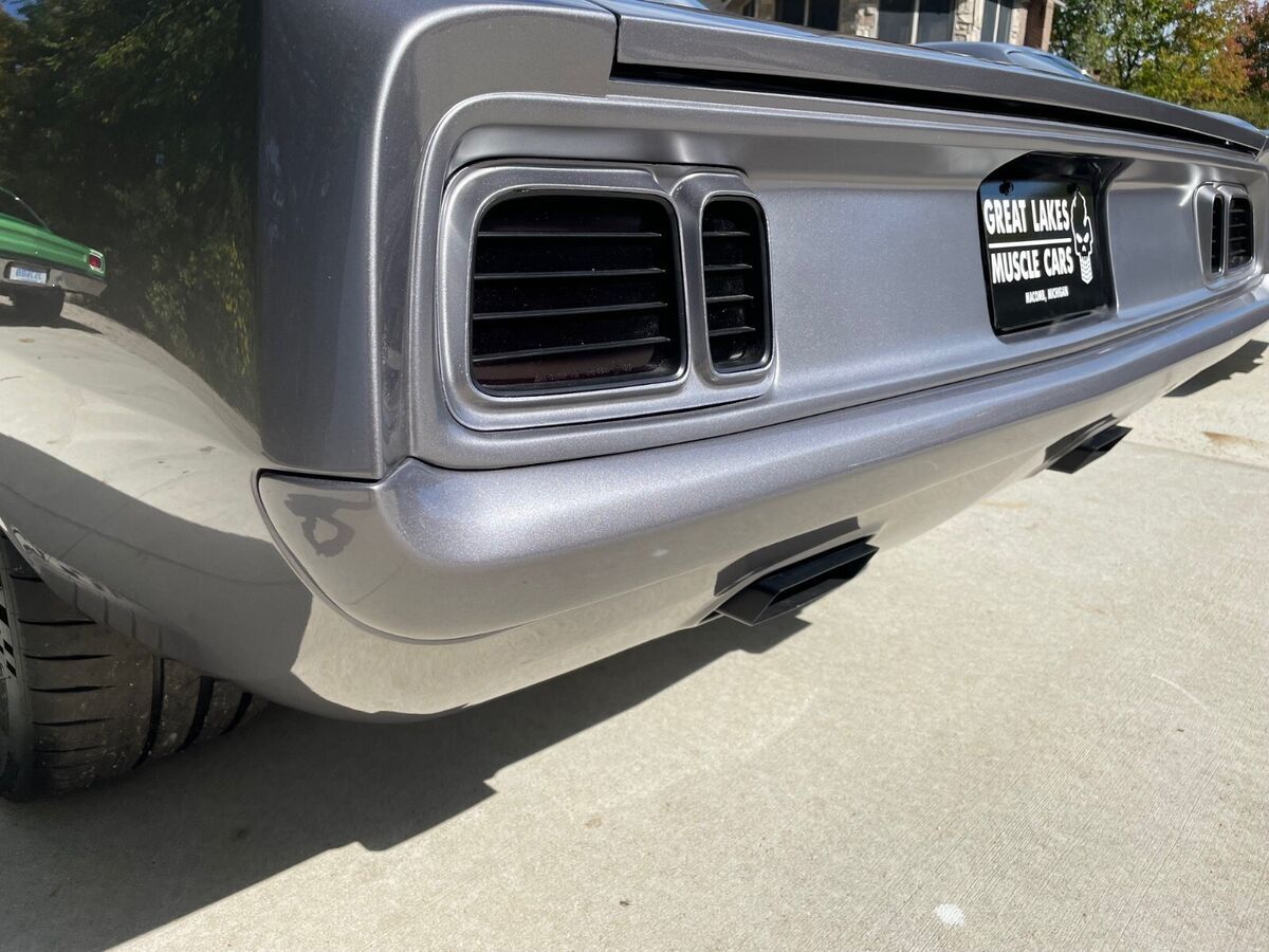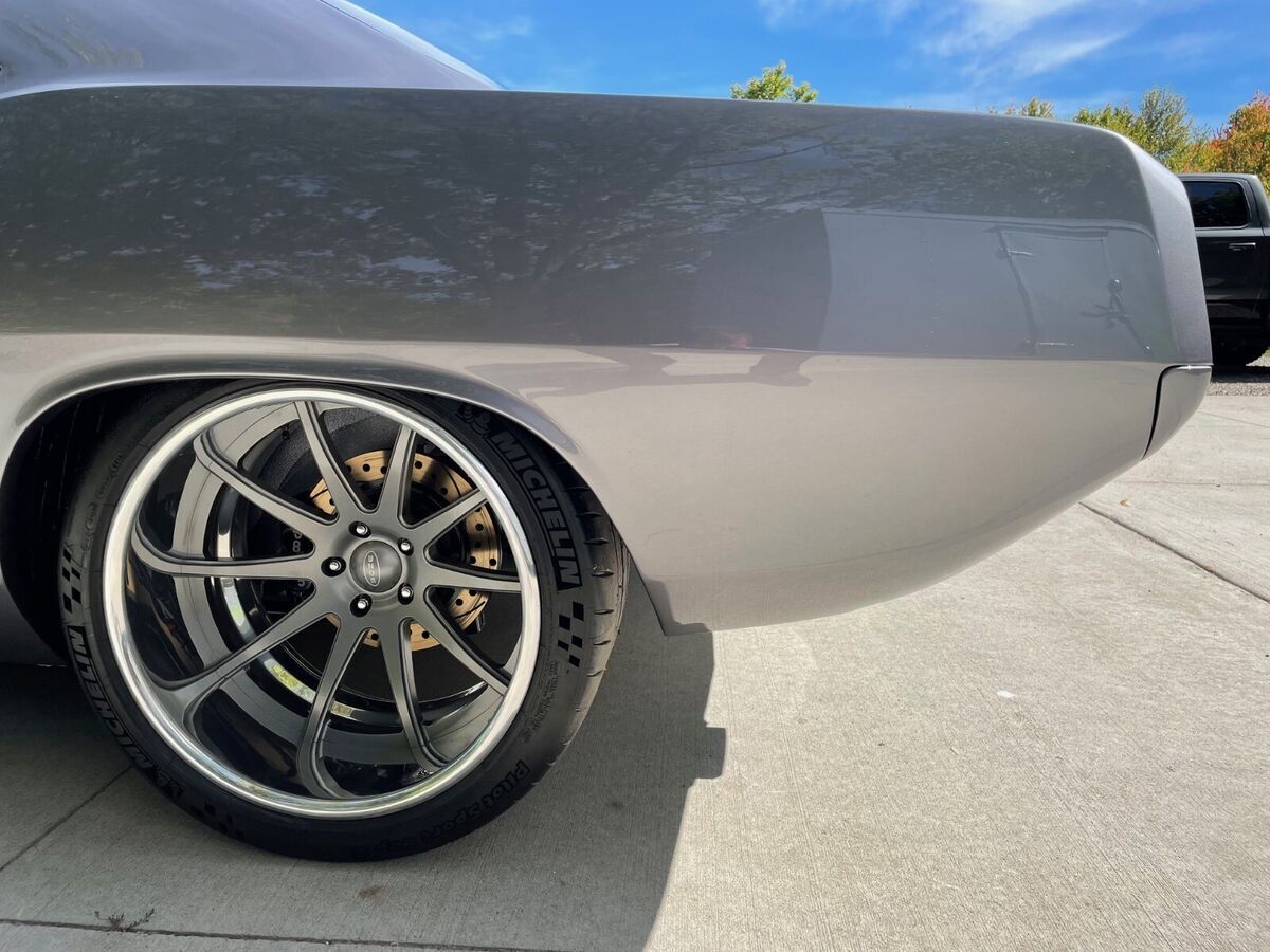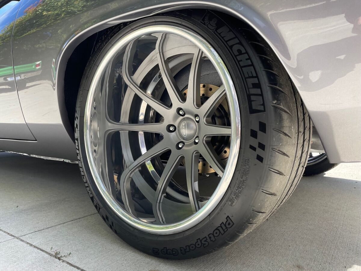 The rotisserie restoration started with a frame stiffening kit from US Car Tool that included frame ties, front upper bar tie in, and a radiator core support, all designed to keep the car from twisting from all the power generated from the massive Hellephant engine. Eiger Gray paint covers a thousand man-hours of metal work that includes: full mini tubs, smoothed firewall, inner fenders and taillight panel, shaved door handles, marker lights, moldings and drip rail, custom frenched rear exhaust pan and tucked and shorted bumpers by Tommy Chryco. The Auto City custom glass is flush mounted. Even the hood and deck lid hinges are upgraded from Ring Brothers. The Octane Lighting HID headlamps light up the road while adding to the aggressive appearance of this monster. The bodywork and craftsmanship are second to none. The stance is completed by wrapping 325/30/20 Michelon Pilot Sports around custom one off 2-piece rims from Boze.