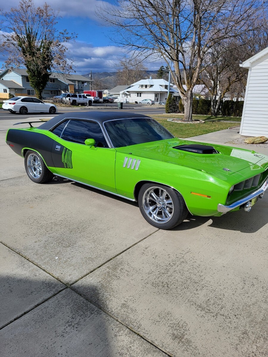 The 1971 Plymouth 440 is a rare collector car featuring a sassy grass green exterior with a black interior. With less than 3000 miles on the odometer, this automatic transmission coupe is powered by a powerful 8-cylinder engine delivering over 500 horsepower. The motor is a 440 wedge block with aluminum Indy heads. It comes equipped with features such as AM/FM stereo, rear spoiler, air conditioning, and power steering, making it a desirable choice for car enthusiasts looking for a classic piece of automotive history. This is not an original V code car. Included three binders of receipts for restoration.