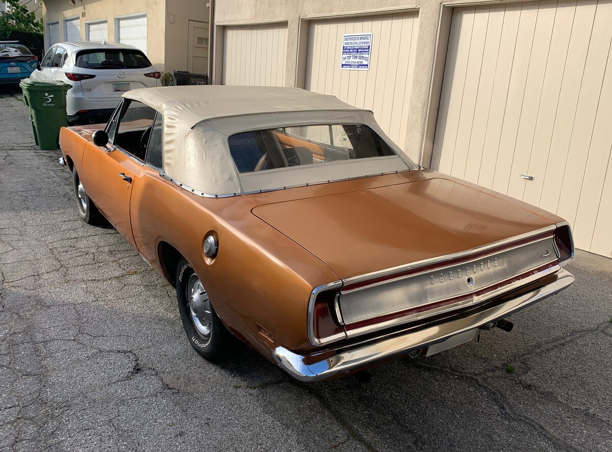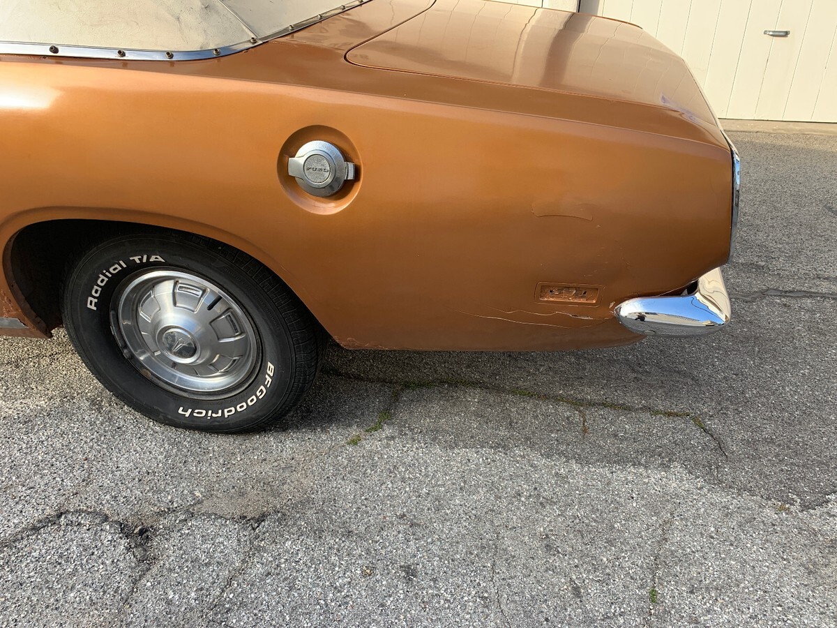 This 1969 Plymouth Barracuda convertible is in it's original bronze color, with a white vinyl top, bucket seats, and original tan interior which is in excellent condition. The engine was replaced with a 1971 LA 318 and has the stock Carter BBD 2 barrel carburetor with standard intake manifold. It has a 3 speed A904 Torqueflite automatic transmission with 21,731 miles and a clean title. Garaged for two decades, it has had some recent upgrades, including a new correct gas tank, fuel sender, 3 row radiator, water pump, fuel pump, oil filter, replaced fluids, hoses, water thermostat and thermostat housing. Registration status is planned non-operation (PNO).There was a collision on the rear left side that predates current ownership. It was cosmetically repaired but some damage remains structurally (please see photos). There is a little paint blistering around rear trim areas. The lower quarter panels have rust holes (please see photos). There is a hole in the trunk that is over the tank. The right rear is missing the reflector housing. Frame rails appear to be in good shape, surface dirt and oil etc.I can start the car but registration prevents me from driving on the street. It will need to be transported with a flatbed or something similar.Please contact me with any questions, I don't want any surprises.Local Pickup OnlyNo Trades. Serious Buyers Only.Private sale by owner. No warranty.