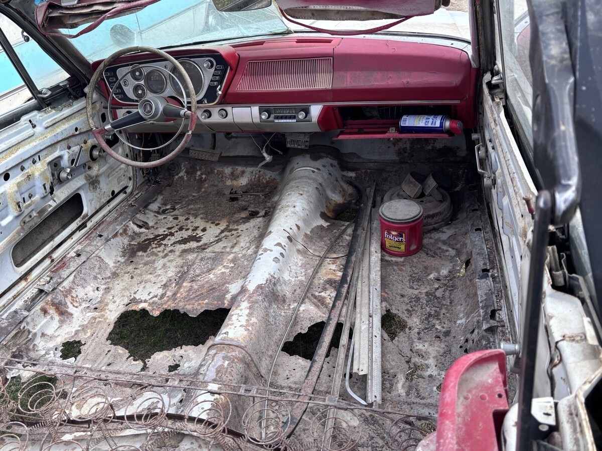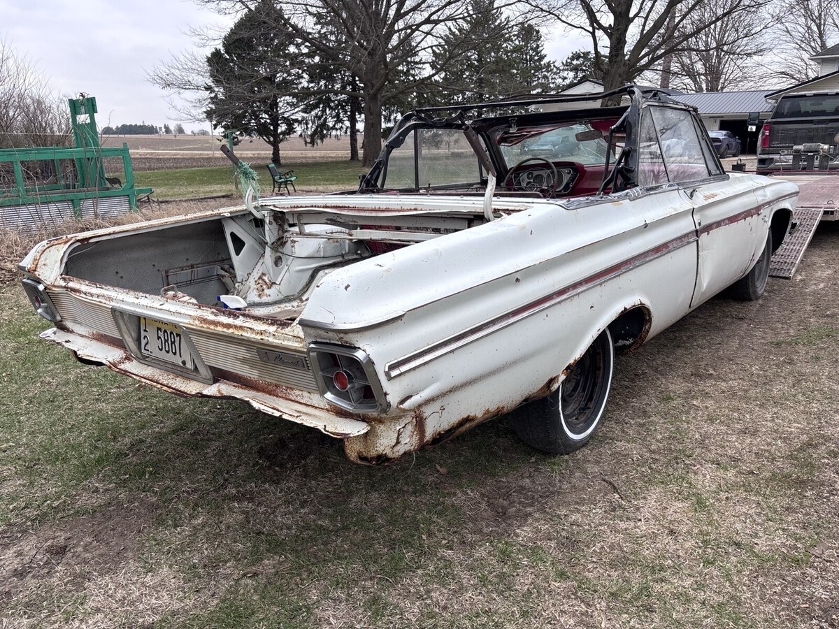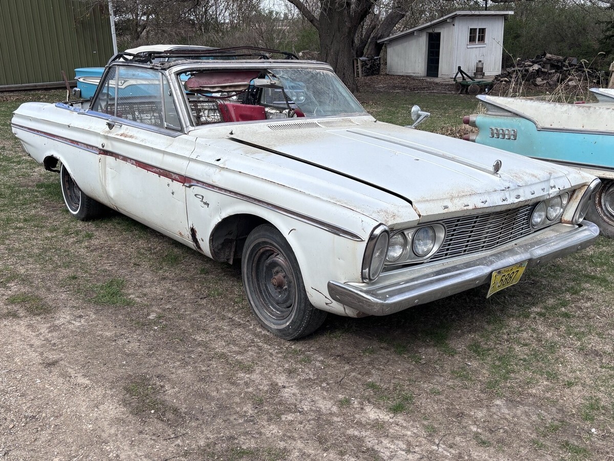 1963 Fury Convertible 318 Auto. White and red, no front seat, decklid or rear bumper. Needs restoration. Dash area all complete and decent.