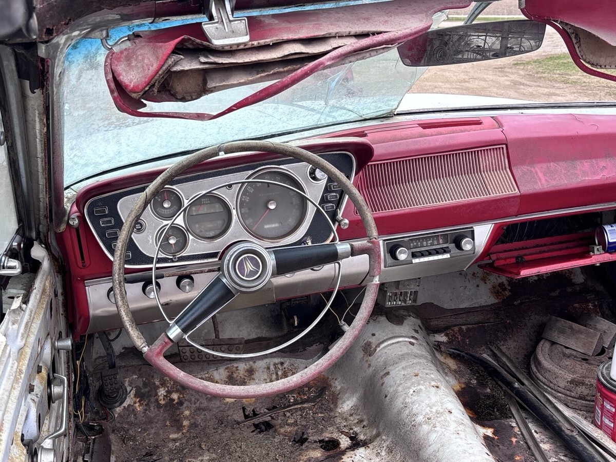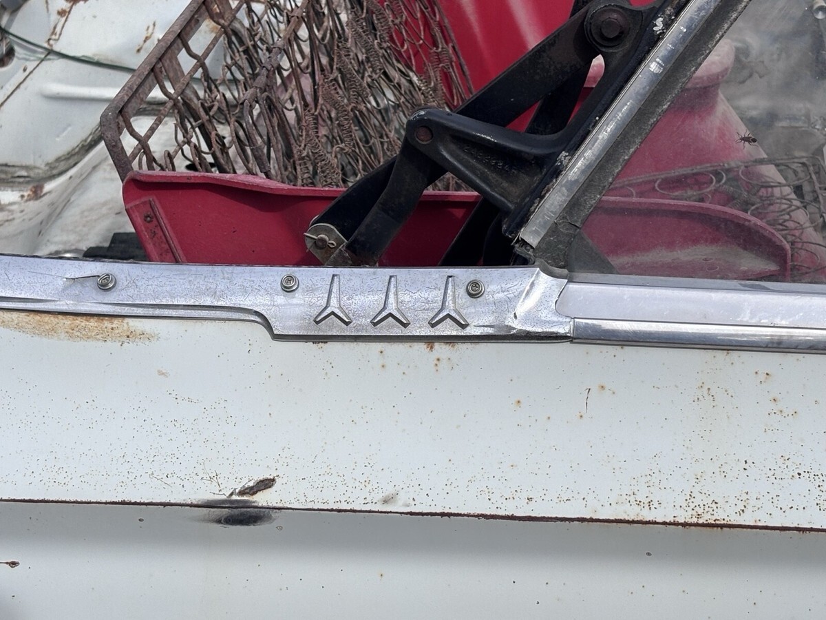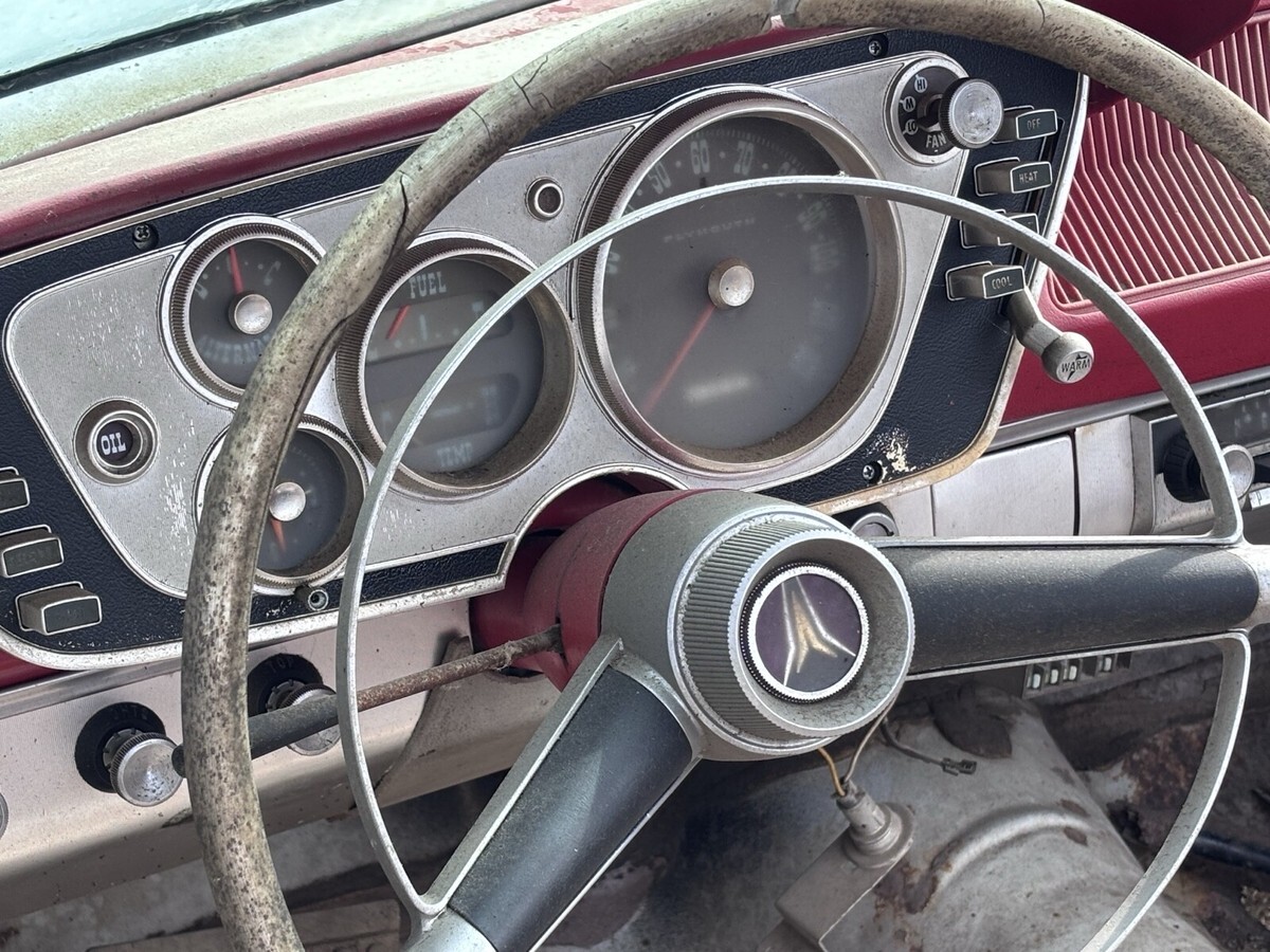 1963 Fury Convertible 318 Auto. White and red, no front seat, decklid or rear bumper. Needs restoration. Dash area all complete and decent.