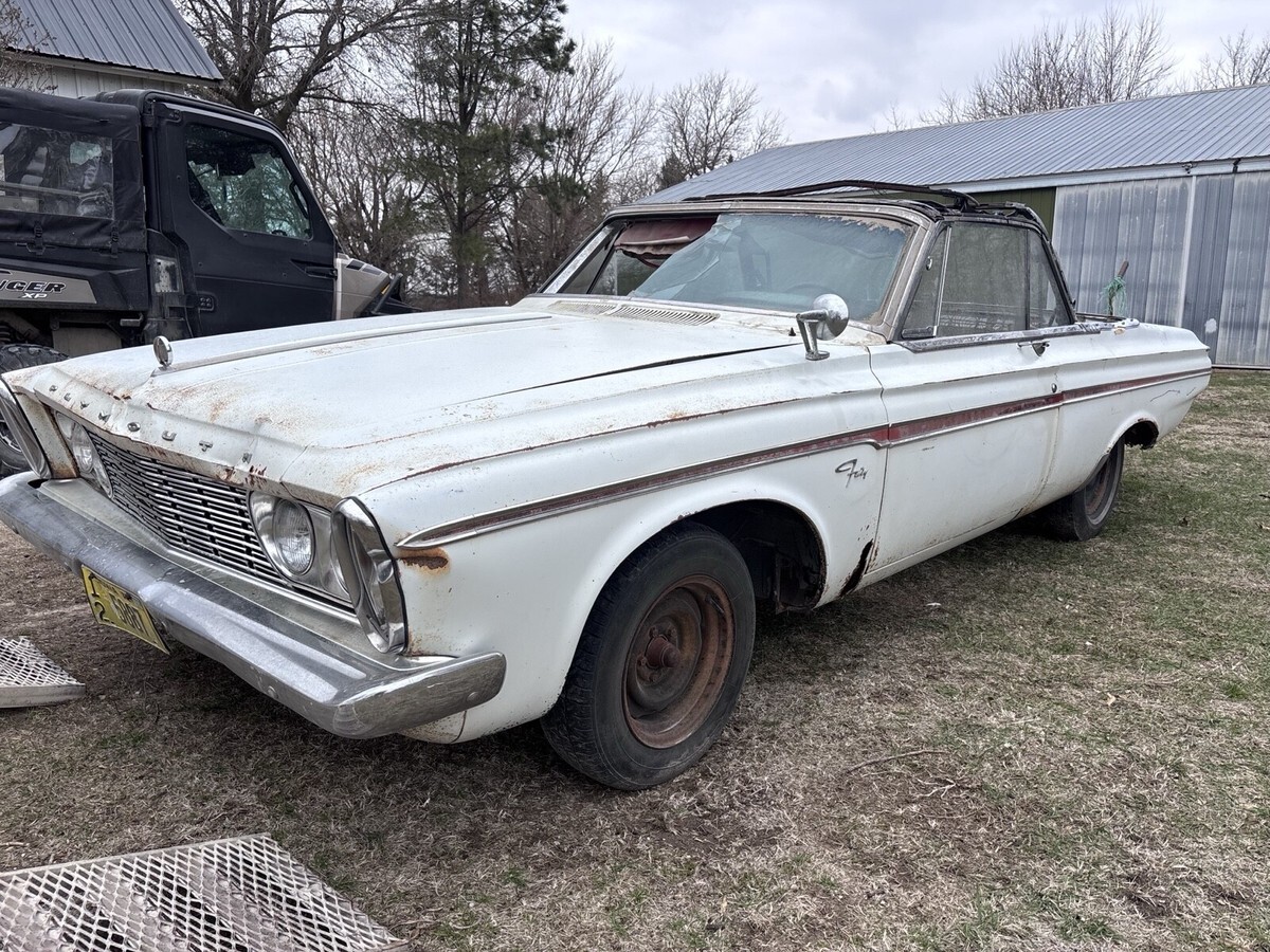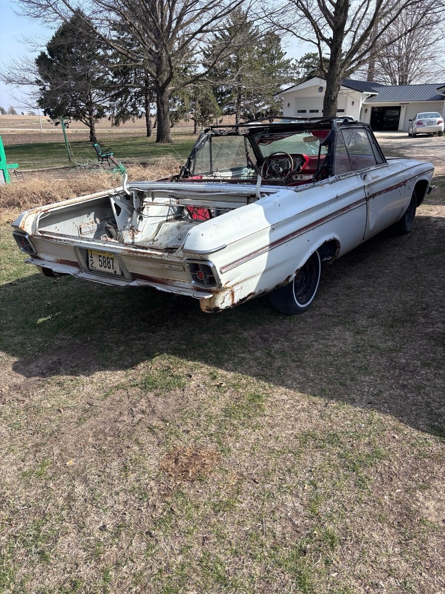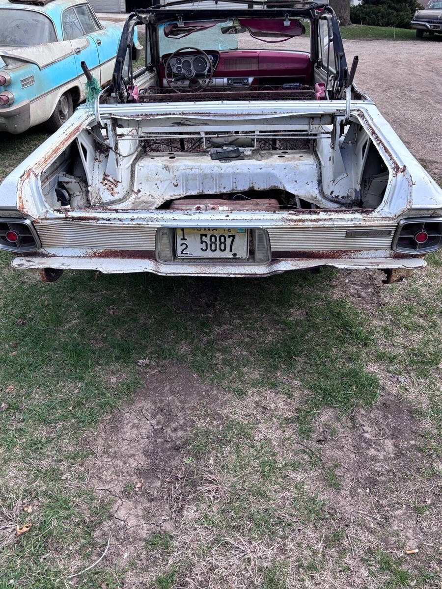 63 Plymouth Fury, unusual convertible model, sold with BILL OF SALE ONLY, no title. Quite original been in storage 50 years plus, engine and trans complete, bad windshield otherwise good glass, most trim is there plus spare and better grill etc. car has rust in pans and quarters otherwise quite solid. Convertible components and convertible well floor area solid, good rockers. Have wheel covers for it. Rolls and steers easy. No deck lid or rear bumper. Sold with BILL OF SALE only. Located in IA 50621 sold as-is and not running (haven’t tried). As-is, where is. Pay within 3 business days please. Pick up In within 2 weeks. I can assist on this end with your shipper.