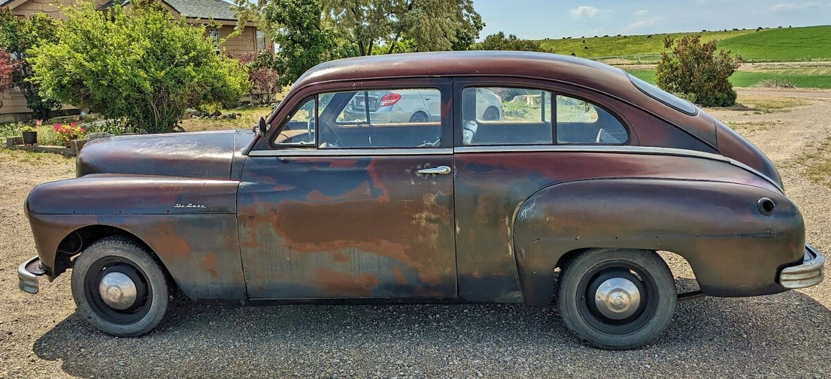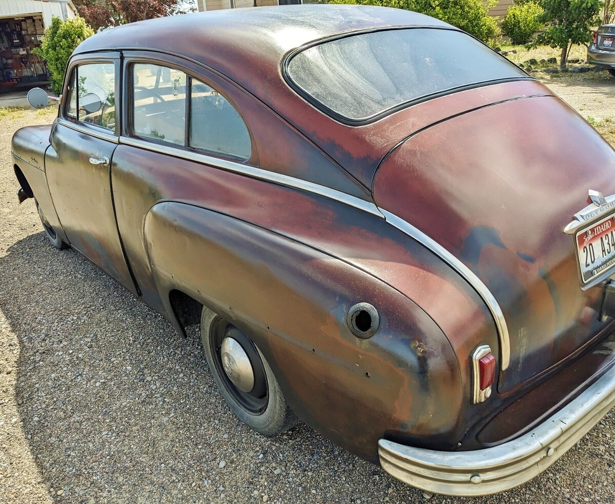 This is a 1949 Plymouth Deluxe 2 door coupe in a rare fastback model (P17). We were daily driving this car with a Ford 200 6 and C4 transmission, unfortunately the block developed a crack. It still has the original ribbed bumpers which are exclusive to 1949.Engine and transmission have been removed - you have a clean slate!DIFFERENTIAL - 1962 Chevy II with 3.0 gear and re-drilled axle flanges to 5 lug.BRAKES - Fronts are disc brake conversion, rear brakes are 1962 Chevy II drums with modern master cylinder.SUSPENSION - Front has custom coil springs with gas shocks, rear has custom leaf springs with gas shocks.WIRING - the headlights and taillights are wired.GLASS - Front windshield has been replaced, passenger front door replaced, both rear glass have cracks, rear windshield is sheet metal.TIRES - Recently replaced, has a spare.BODY - the body is stock, a lot of the floor has been replaced.Seat is from a 1966 Chevelle, both front windows roll up and down, wiper is a manual lever. We don't have any extra trim or other parts.Car is sold as is with NO implied warranties, clear Idaho title, NO TRADES!Please message with any questions before bidding. We will not end the auction early.