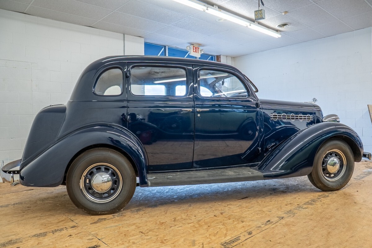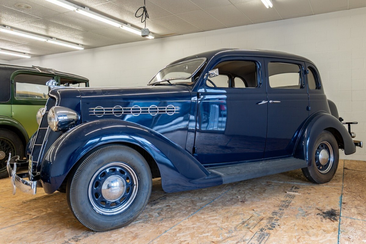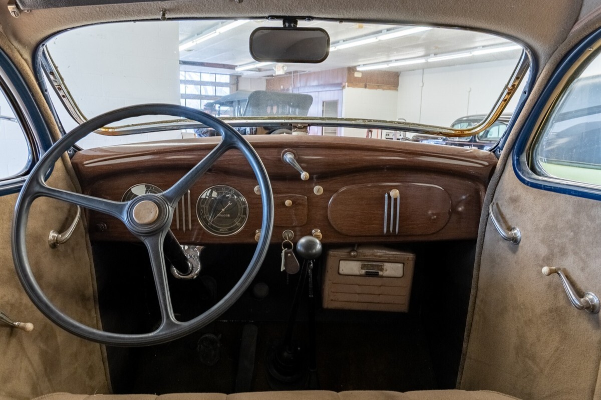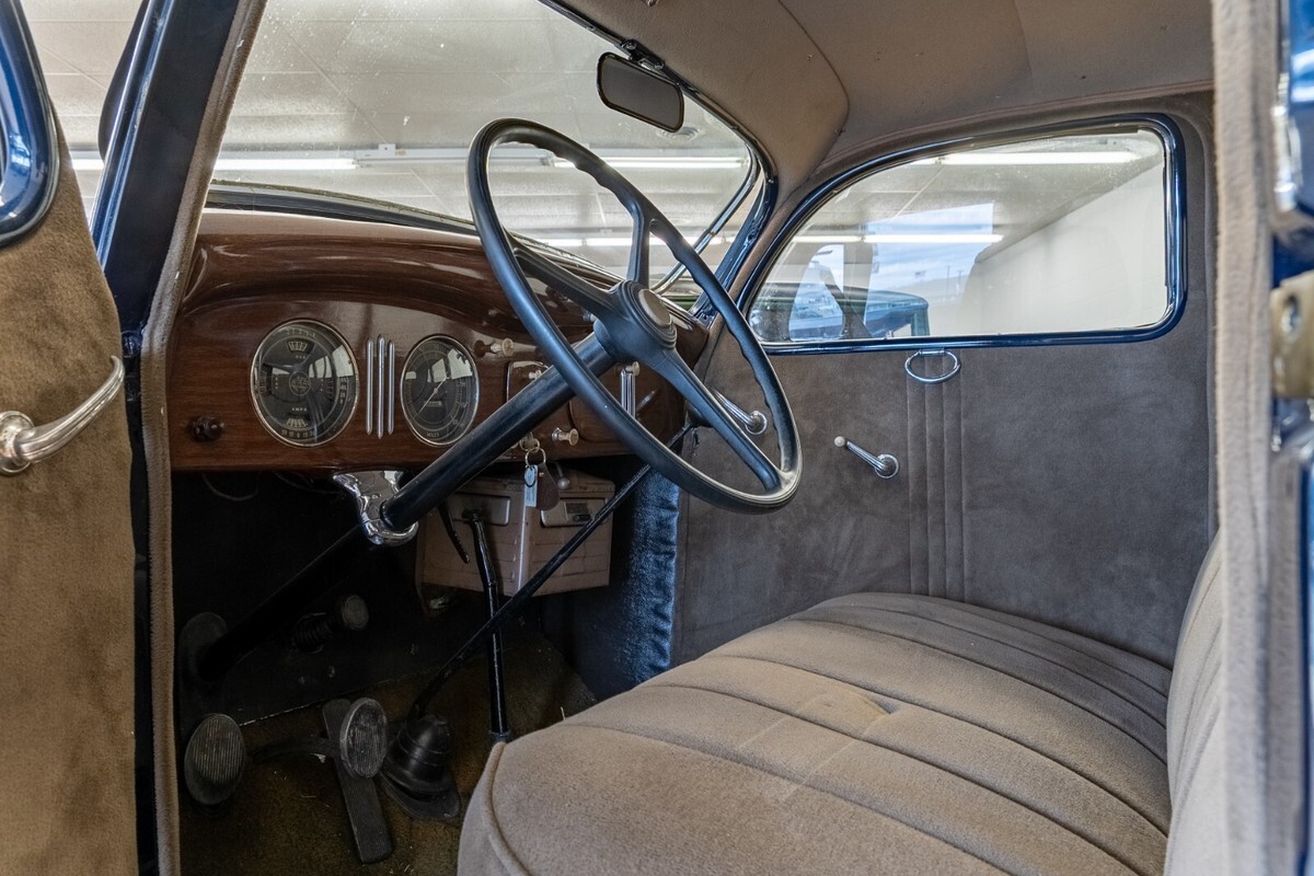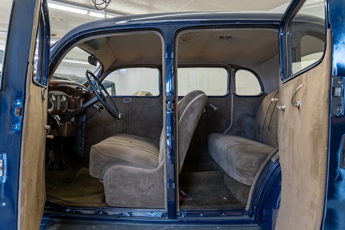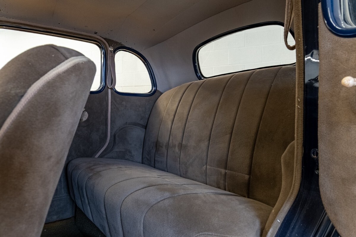 This Plymouth Deluxe is a classic sedan (suicide doors) with a tan interior and blue exterior. It has a manual transmission and a 201 CI 6 cylinder engine. The car has 86,605 miles, had a previous ground up restoration, and would be a great addition to any collection.