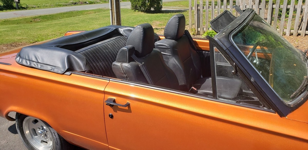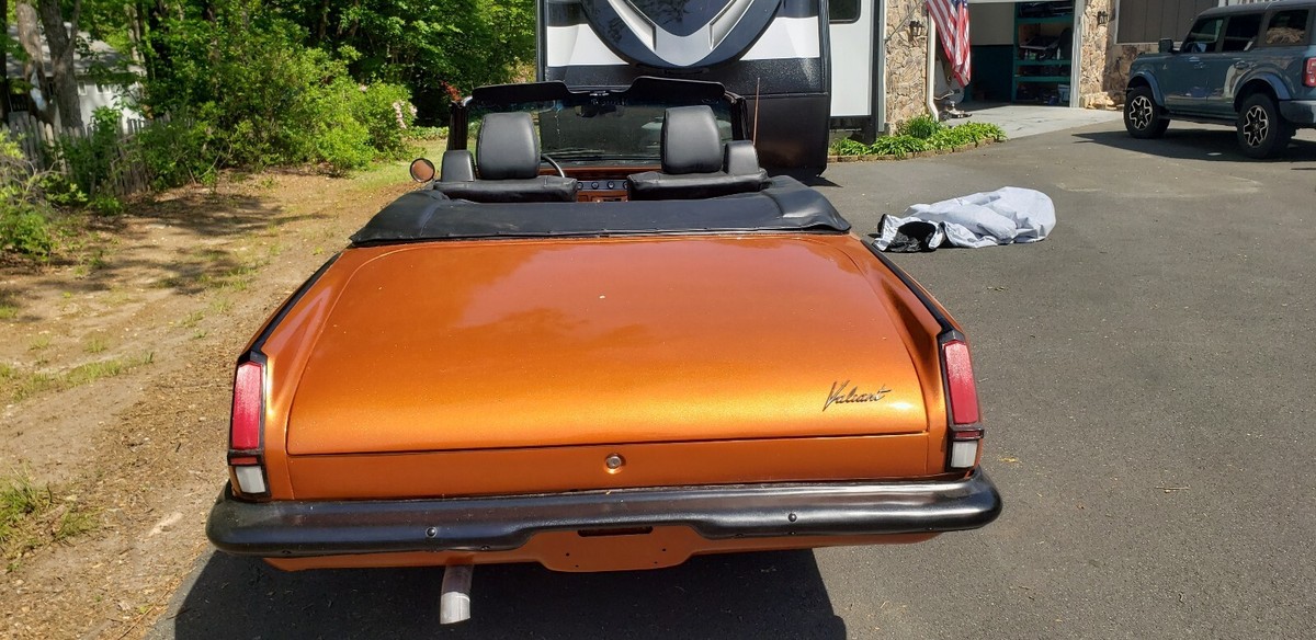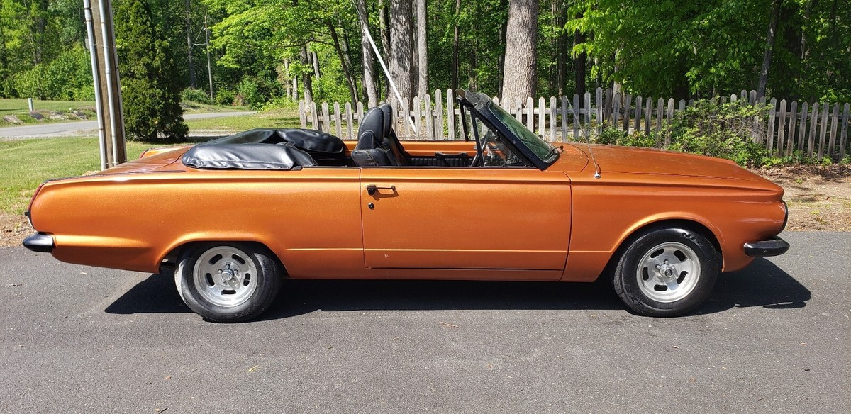 Classic rust free Valiant Convertible with a 225 slant 6, push button automatic. Clifford's intake and headers,TTI 2.5 inch exhaust. Many new components including paint, carpet, gas tank, Mancini steering box, radiator, Convertible top and shift/park cable.