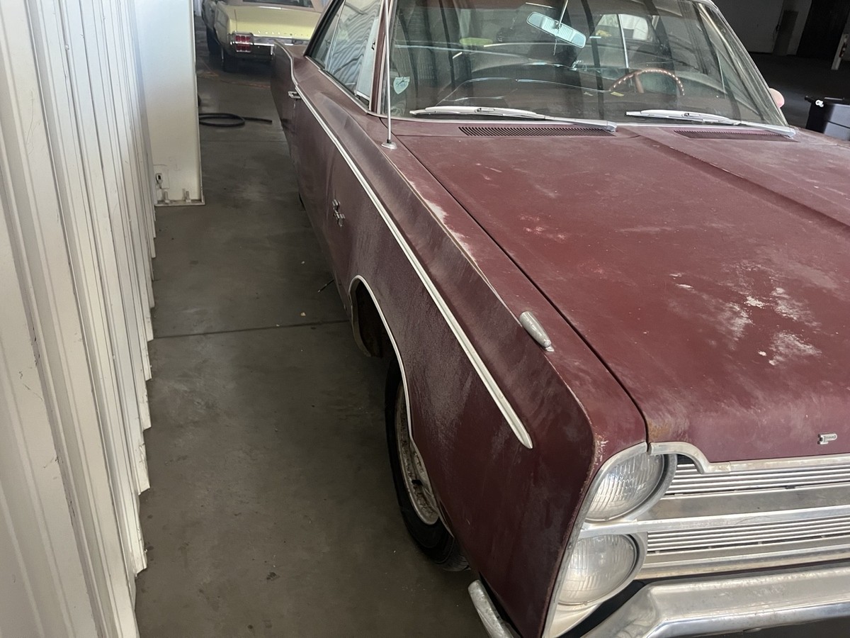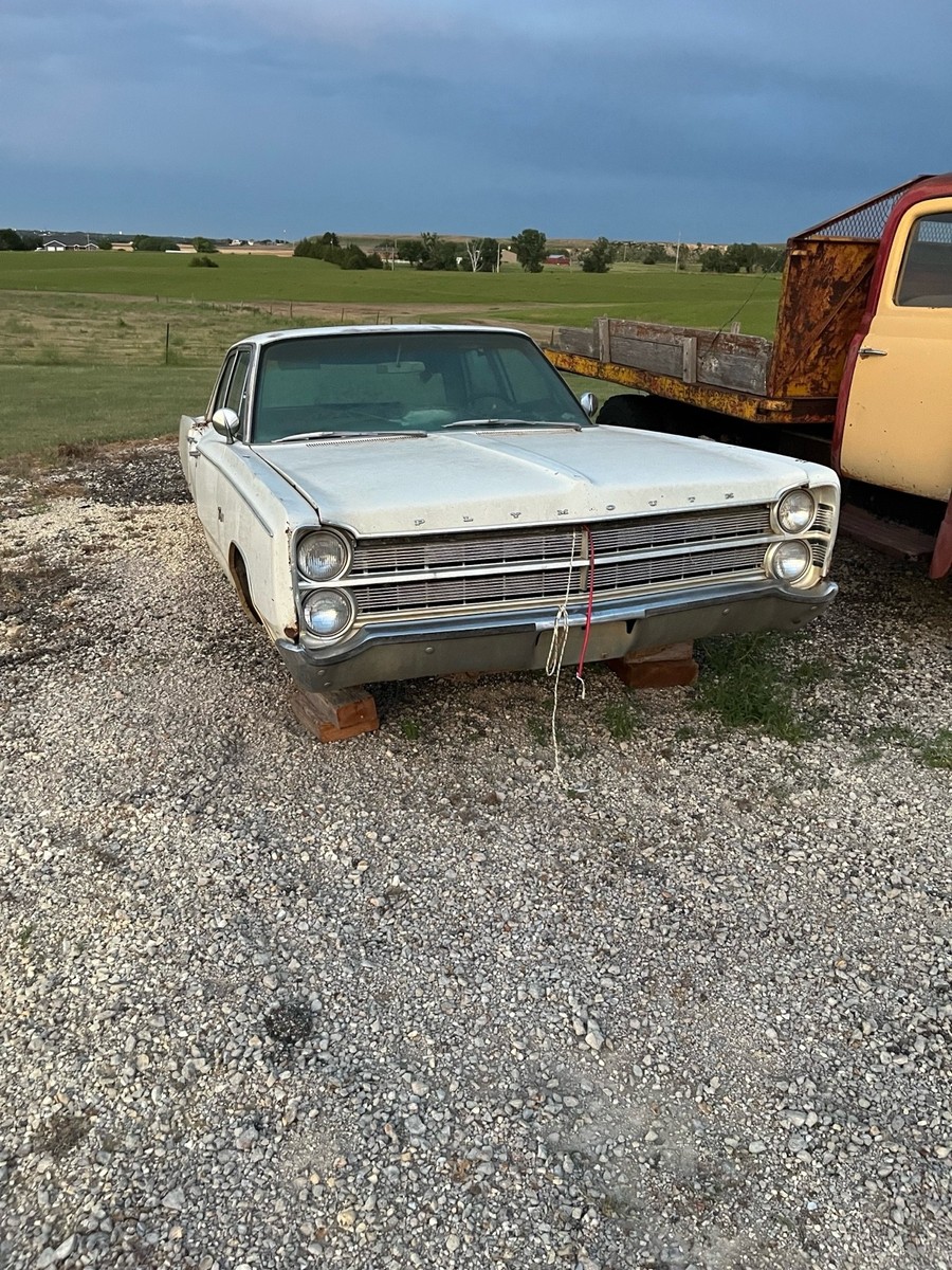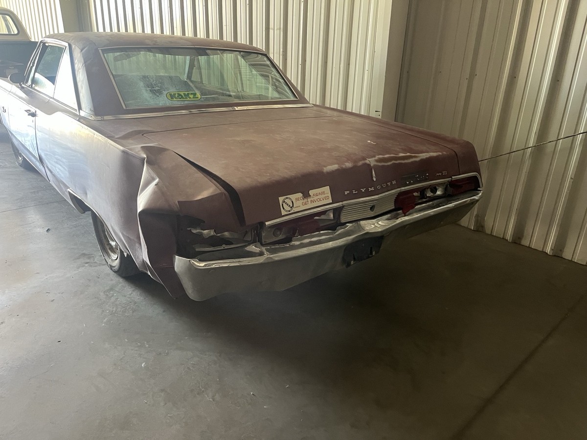 Fresh barn find, 1967 Plymouth Fury III, been in storage for 35-40 yrs. 318 auto running condition unknown. Left rear 1/4 needs to be replaced, otherwise pretty straight body with a little rust on Right lower 1/4. Complete interior with split bench seat not shown needing recovered. Comes with complete 4dr parts car along with extra rear bumper and NOS taillights. New tires