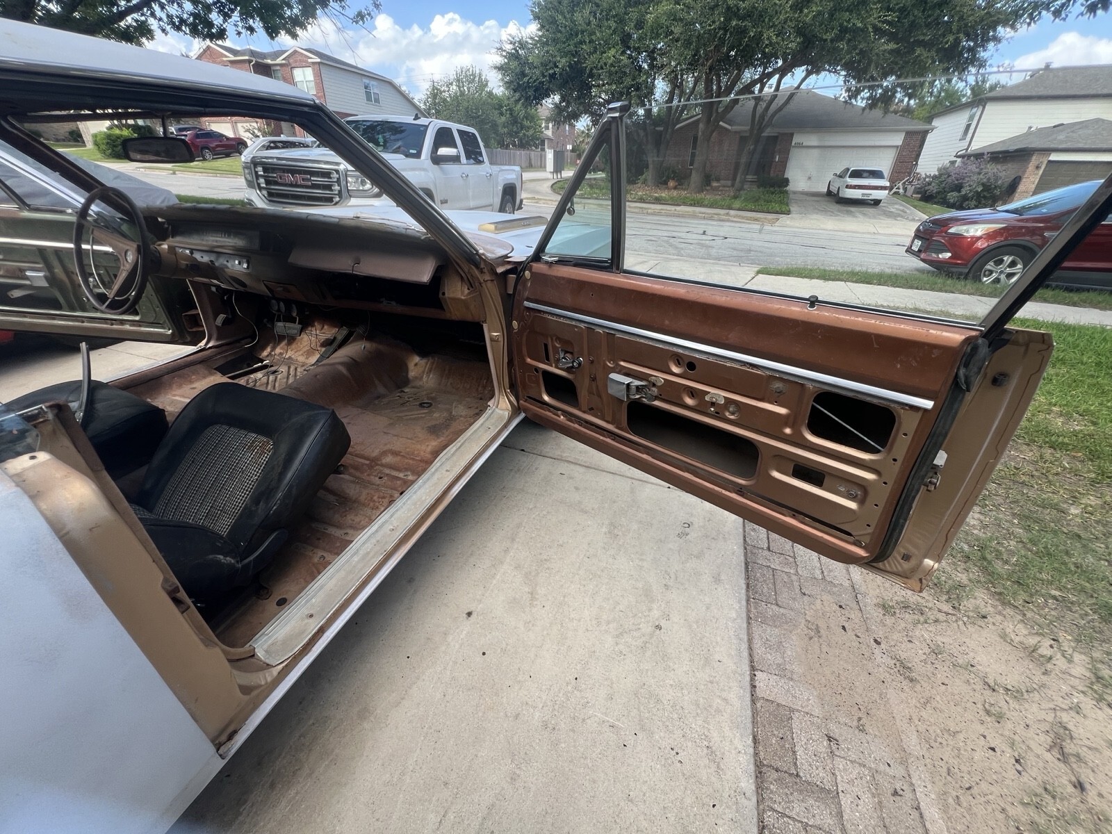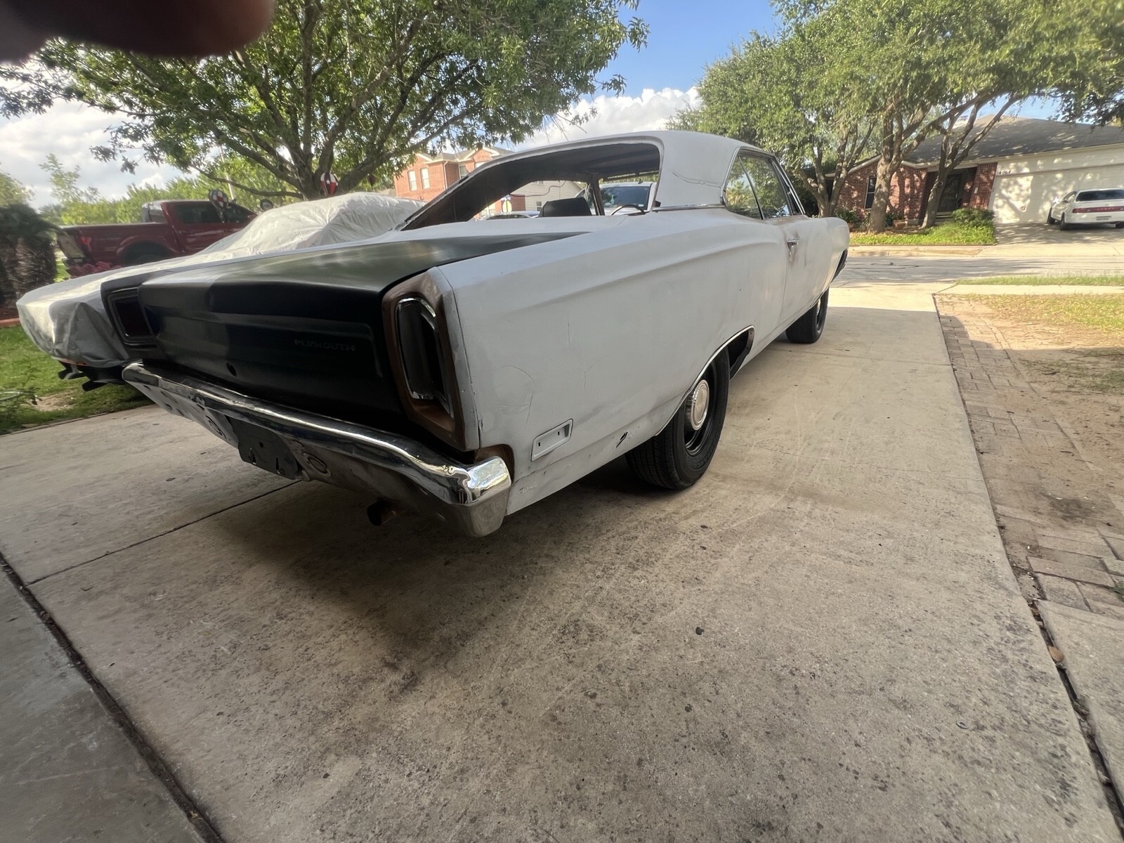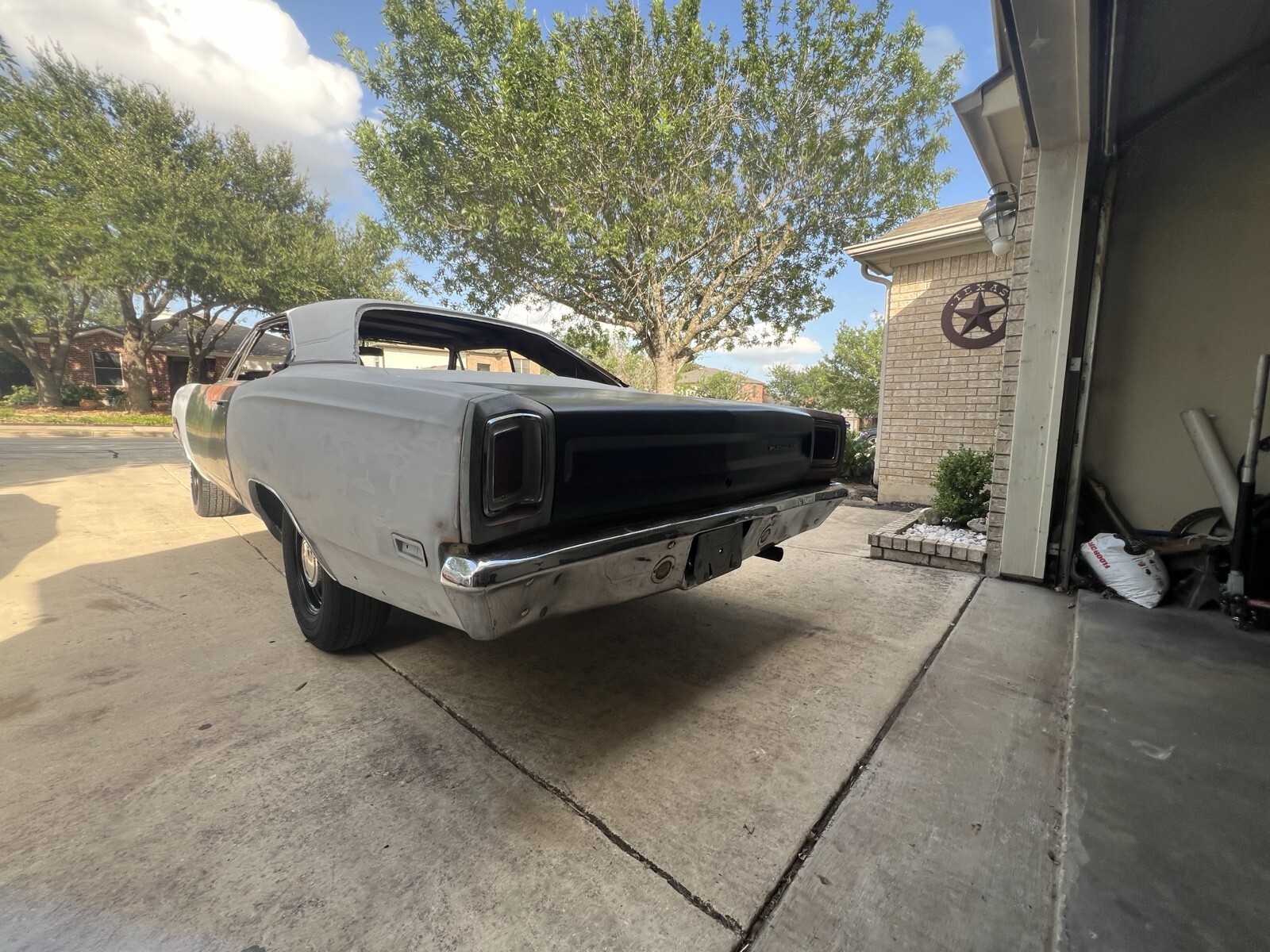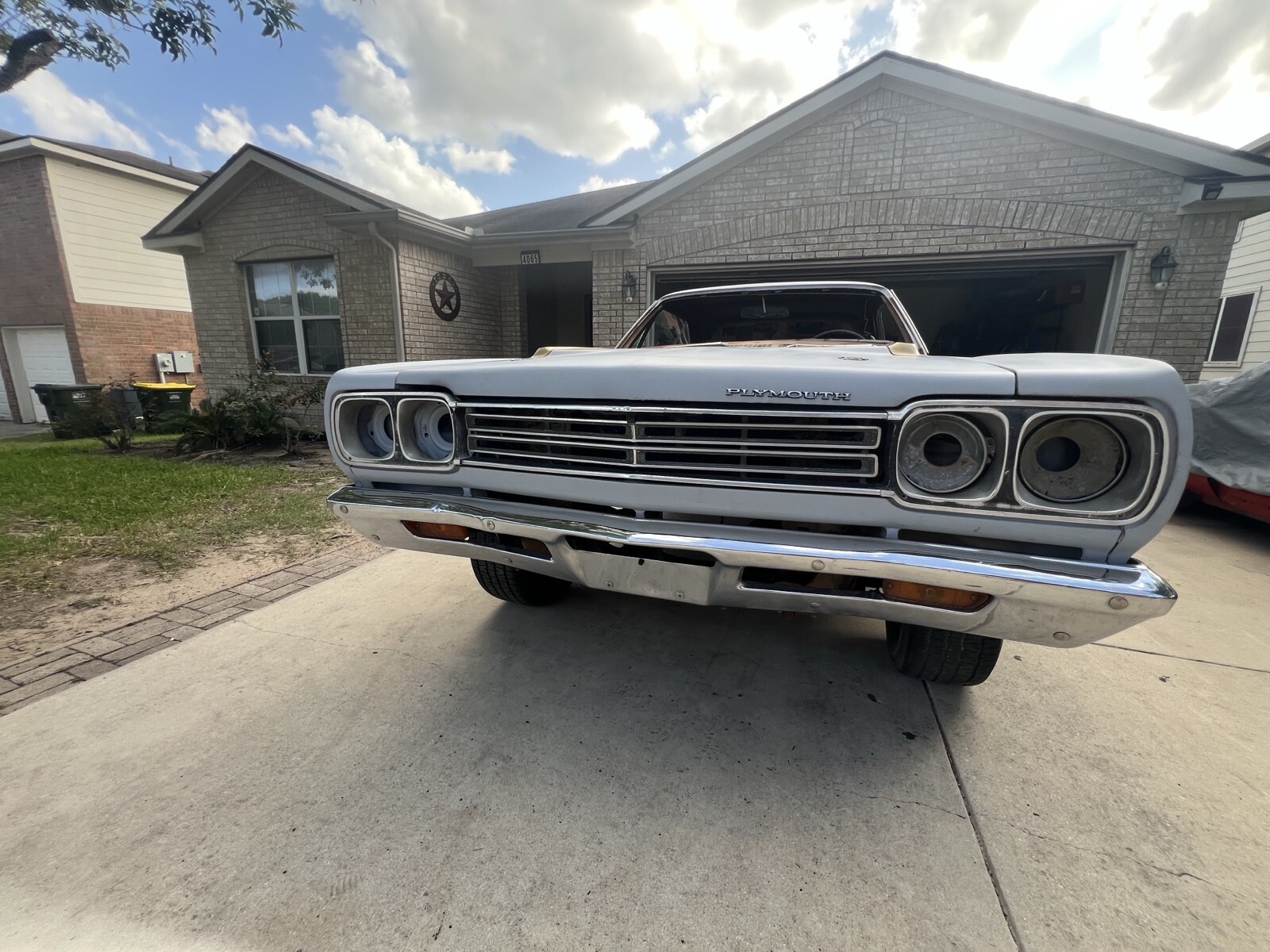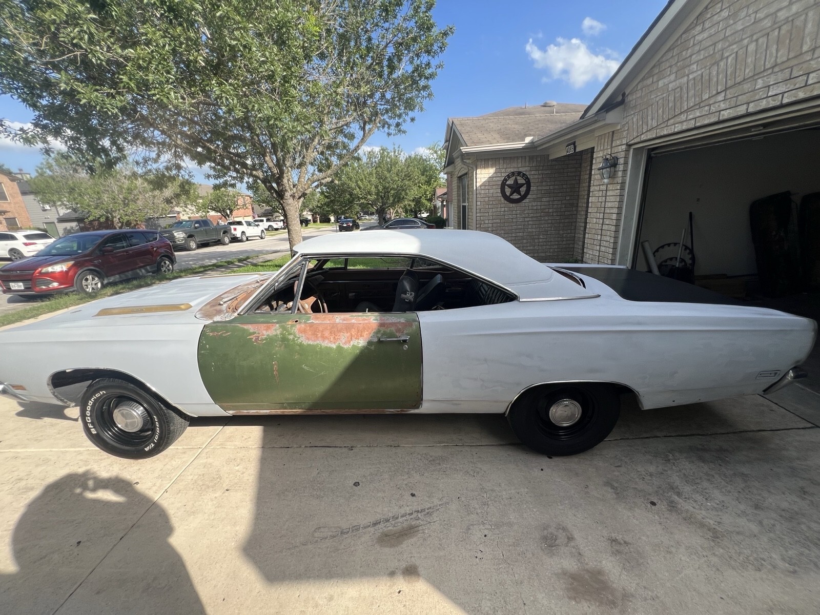 I have a 1969 plymouth roadrunner for sale. Car was a 383 auto car in Honey bronze metallic. Have all glass aside from the front windshield, and all chrome, windows work. also comes with front b body seats that need full restoration. Car will need minimal rust repair, is very solid and a great start for someone to finish. Dash vin, fender tag, core support, and trunk gutter numbers all match. Car will come with bill of sell and have trhe paperwork showing vin has been verified as clean b y the sheriffs department and can get a title. feel free to contact me with any questions at 210-367-0288. Also have a complete running drivetrain out of a hellcat with the auto trans, and ecu for an additonal charge