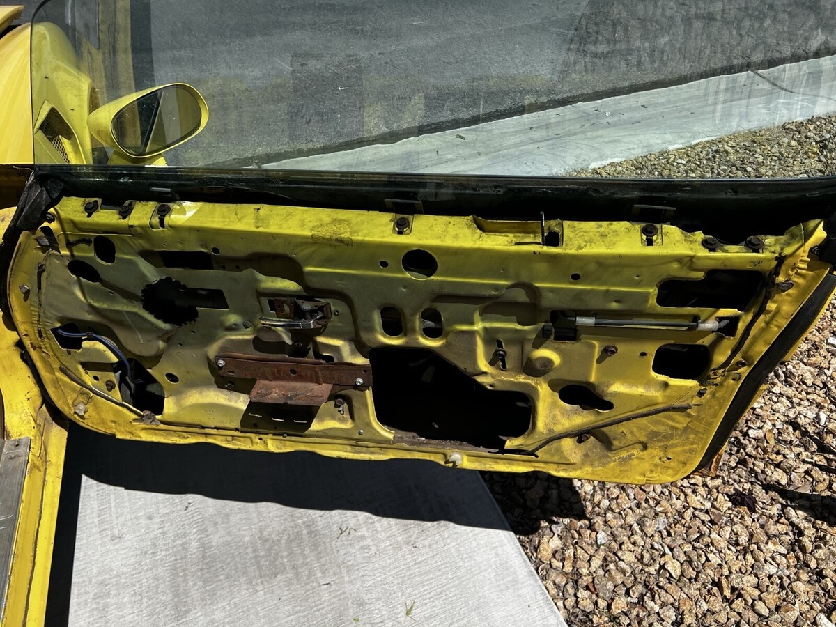 Yellow exterior and brown interior. All parts not installed are in the trunk.
