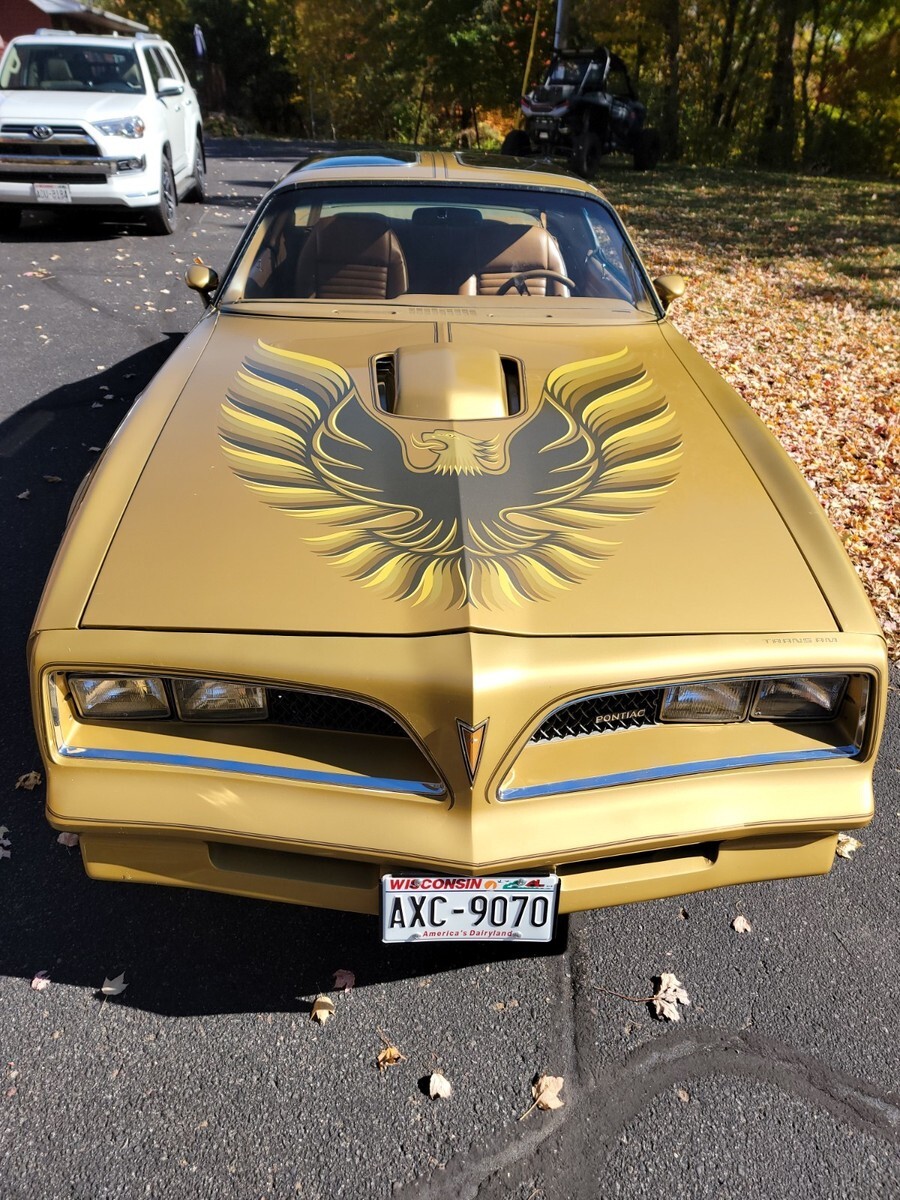1978 Y88 TRANS AM. Matching number engine and factory 4-speed car. Solar Gold paint and interior in great condition. Lots of options and comes with the a/c components. This car was listed last fall but had a non paying bidder so was put in storage until now. Please call or text questions to 715-563-0353.