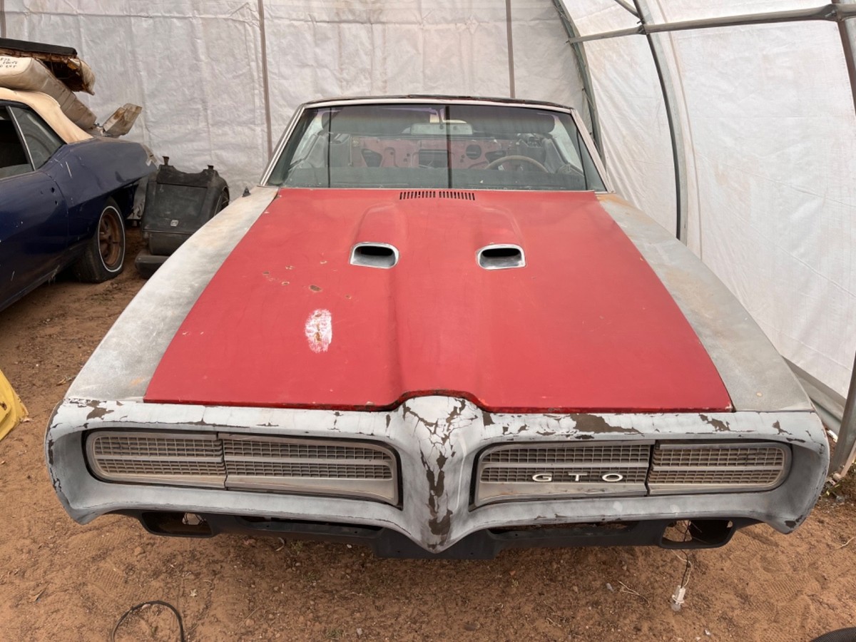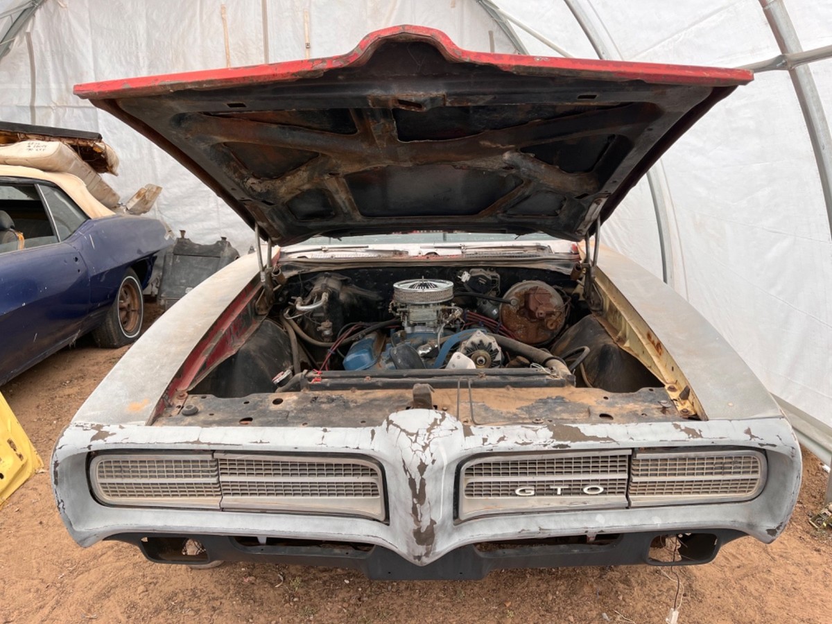 Up for grabs is one 1969 Pontiac GTO convertible this is a factory ordered 400 4-speed also factory ordered A/C convertible if I remember correctly it’s one of 330 made with A/C and a 4-speed . As you can see in the pictures the four-speed is all in pieces and will need to be rebuilt the motor I was told was rebuilt and running when parked and then the transmission was removed and taken apart in 1 million pieces lol . As you can see it is a really solid car it has had brand new quarter panel skins put on it it has their original trunk which is in great condition as is the floor it comes with the patch floor panel for the driver side which has some rot in it other than that super solid car especially for being a convertible. Well if you have any questions or concerns feel free to reach out to me and I will try to answer them as soon as I can. Have a happy fourth