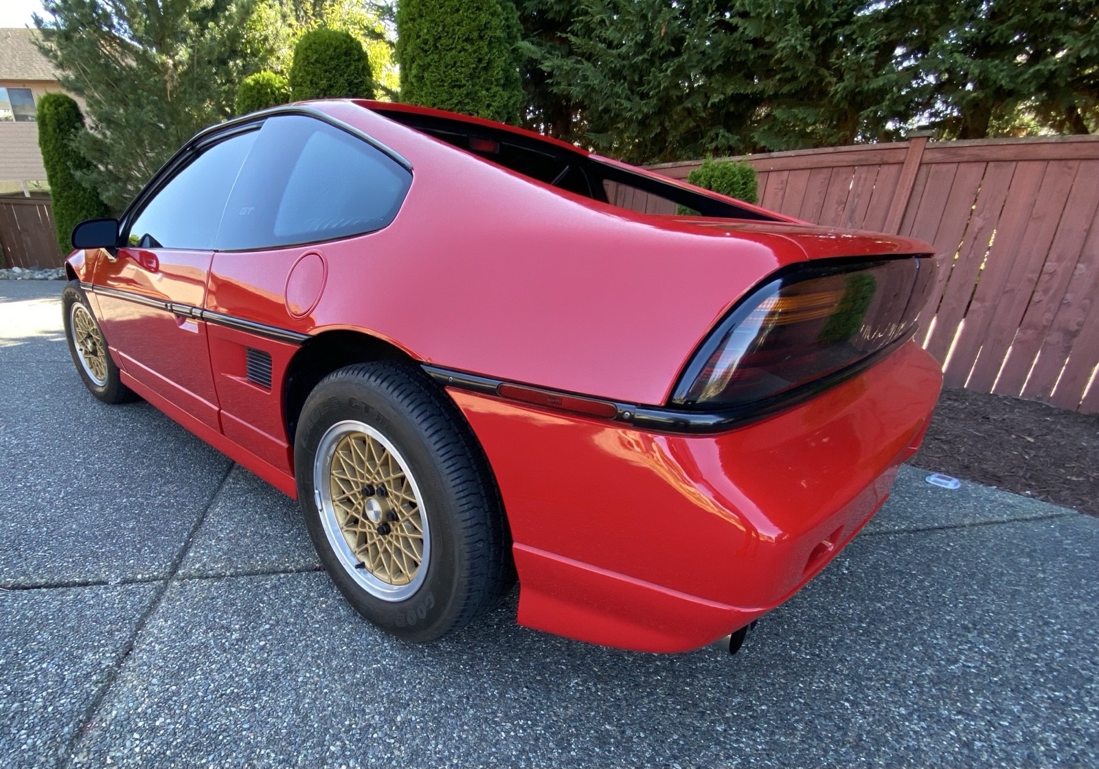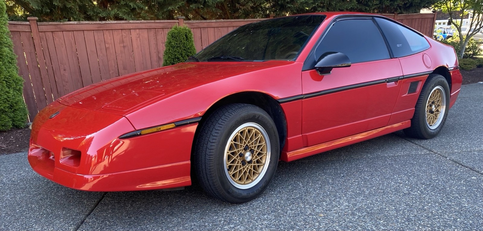 This 1988 bright red Fiero is a rare spoiler delete order. I have an original Fiero spoiler that I had painted at a reputable Auto painter with Pontiac red correct paint and it looks amazing so the buyer can decide to either keep it spoiler delete or put on one of the big wings . The car shifts immaculately and the five speed transmission is easy and fun to drive. I have very wide feet and have difficulty with the clutch and brake being so close but this car is a cinch. If you know anything about Fiero GT‘s, they are a blast. This one has the original tan interior with the original floor mats that are rolled up in the trunk, it comes with a car cover. The tires are in excellent condition. I put a battery disconnect on it because I go weeks and weeks without driving it and the battery disconnect is pictured in one of the photos. The car has a seat and it works just fine. At one point it had a vintage Clifford, alarm, but I’ve torn most everything out, including the little siren and the wiring in the back. The only thing that is an issue is the radio, sometimes it works sometimes it doesn’t and sometimes it’s just the left speaker I would go under the dash but I’m way too old and I’m not limber enough so I’m gonna leave it for the buyer to deal with. Questions are welcome and I will take additional photos upon request.