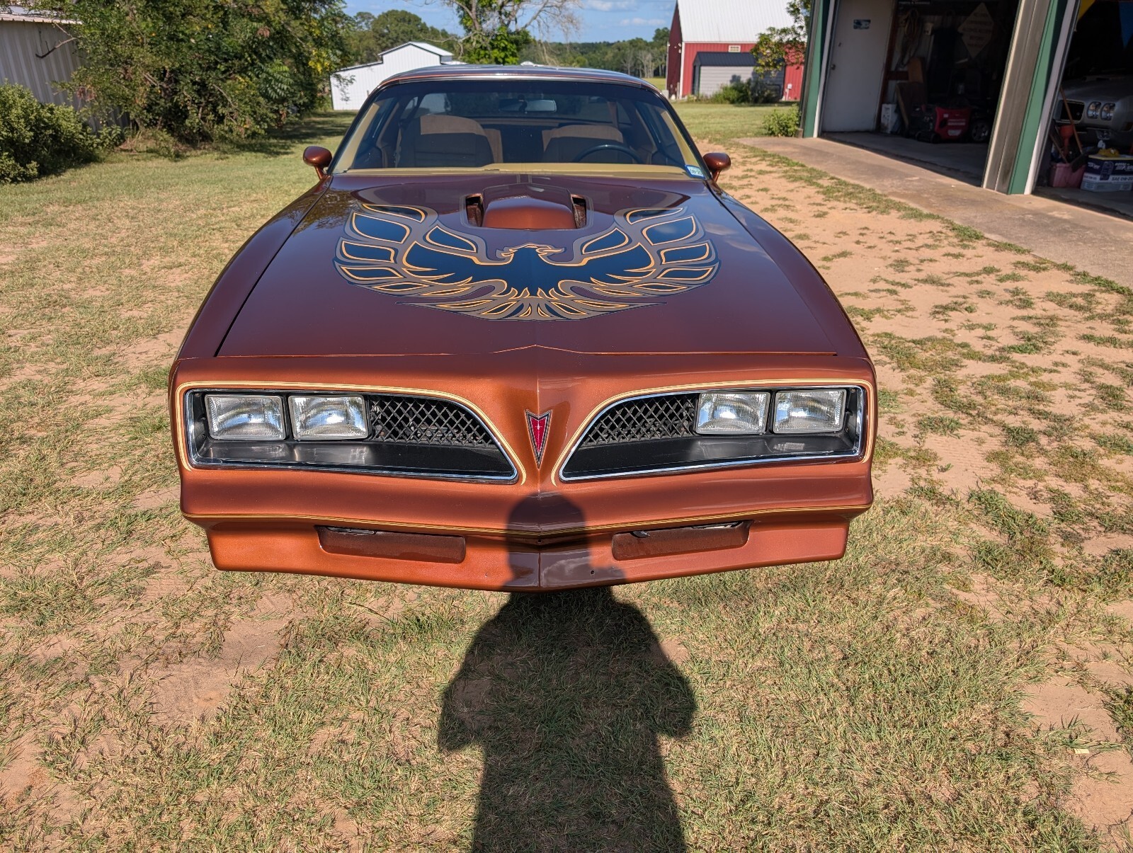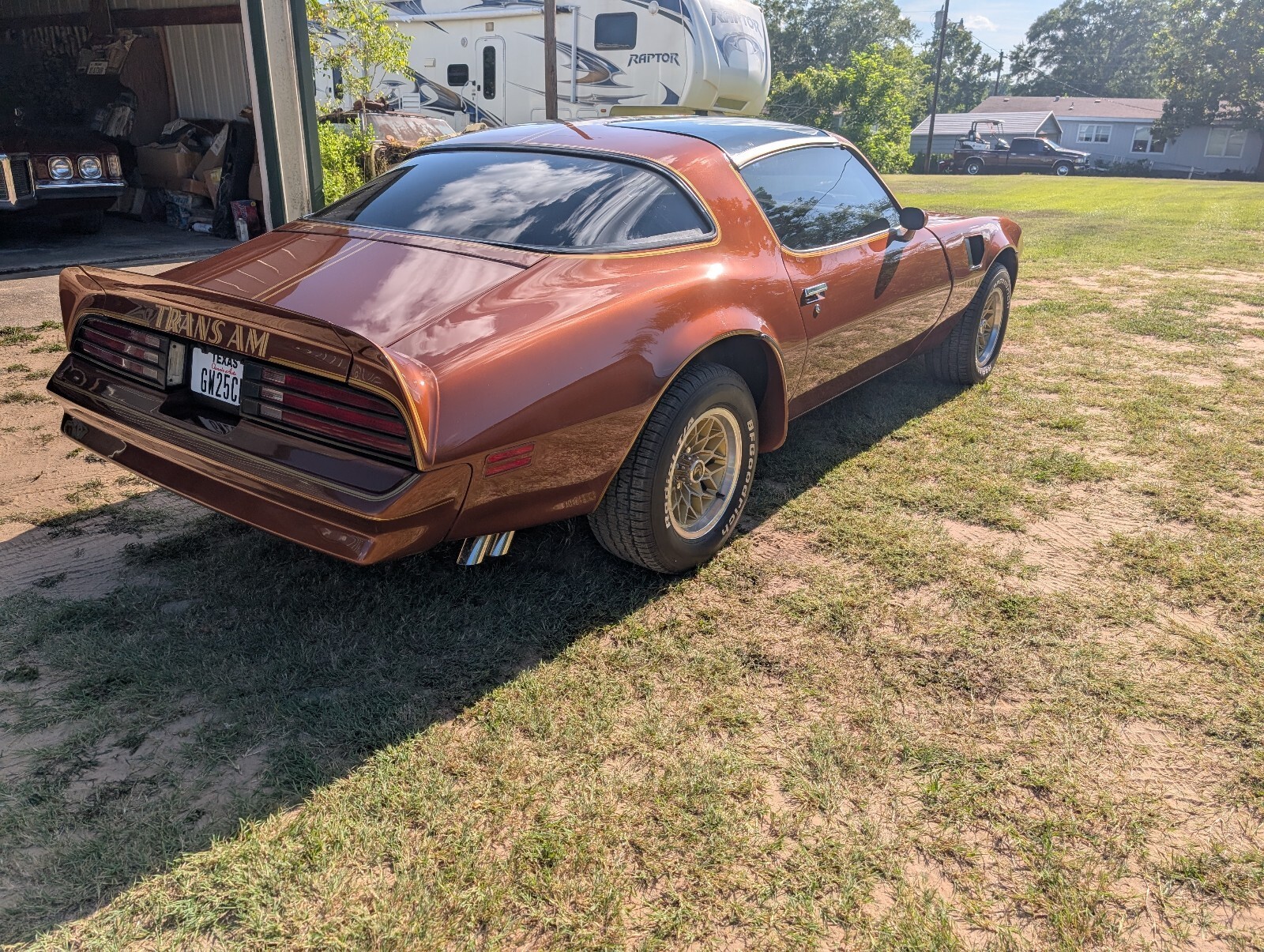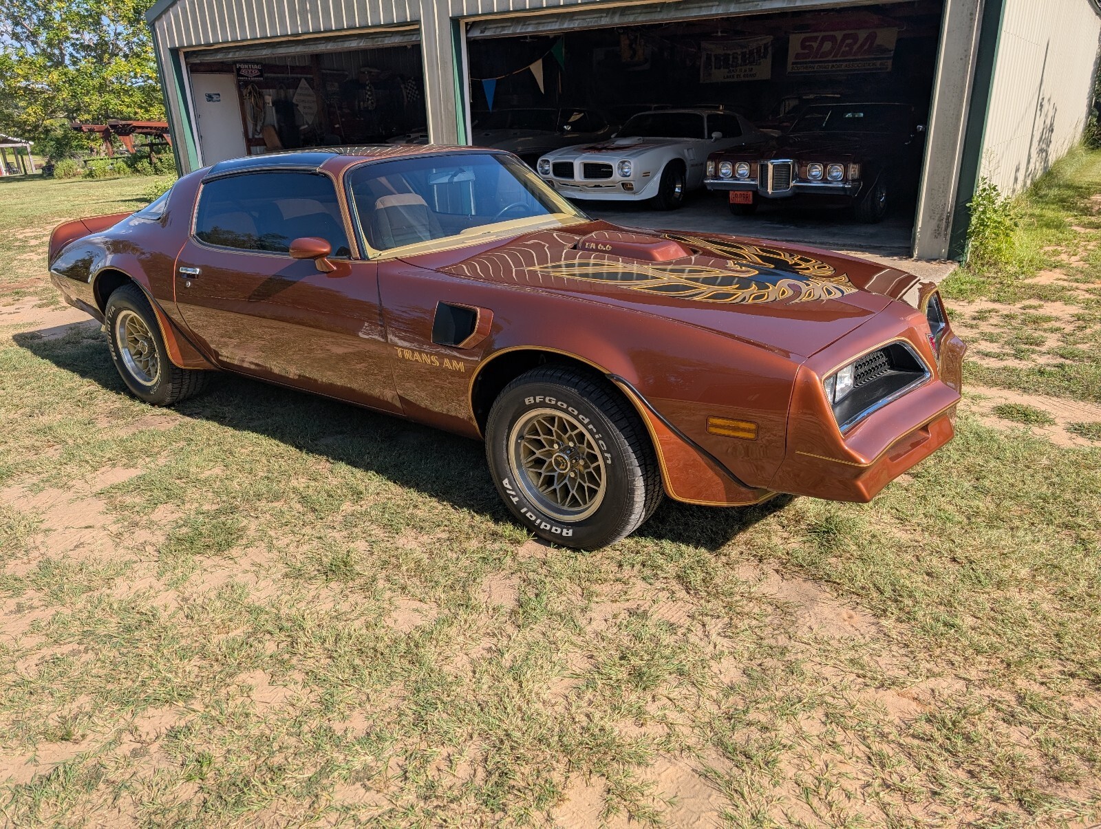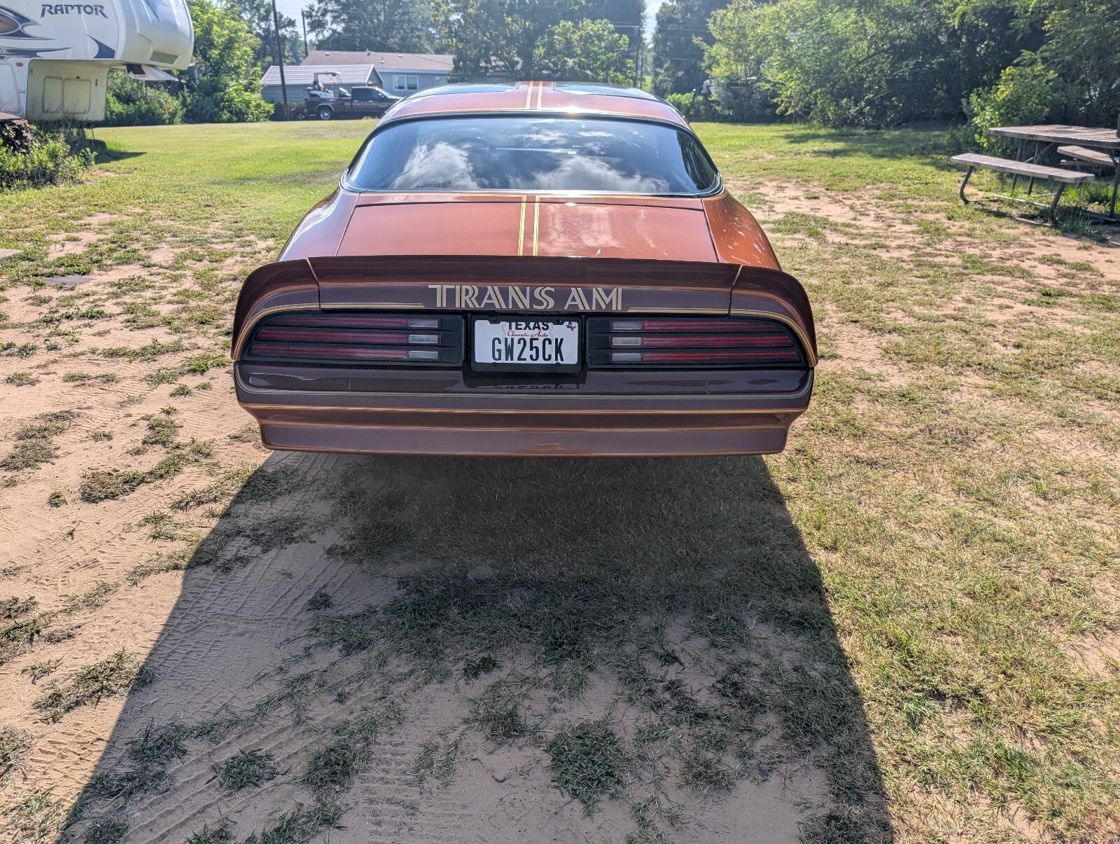 Relisting due to buyer flaked out.This is a very nice 1978 Trans AM,one year only Chesterfield Brown(Copper), original 400 Pontiac (TA 6.6) original 4sp now tremic 5sp,one made to fit car,no hacked floors,3:23 posi,T-tops,power window,power locks,power trunk,rear defogger,tilt,cruise. 400 has been hoped up for more power,heat wrapped headers, mandrill bent exhaust,ra III cam, aluminum intake ECT. Hydrolic clutch, vintage air,ws 6 wheels. Damn near mint original int,Very nice original weather strip. Very straight rust free body,with a high quality repaint,no bubbles or scratches,SE stripes.Very nice original floors with factory primer.Car runs hard,no rattles or squeaks,t tops are tight,no leaks. Cruises highway effortlessly,no overheating. This is a nice ta.Have more pictures and video. $45,000 OBO any questions please call 903-three five2-0147