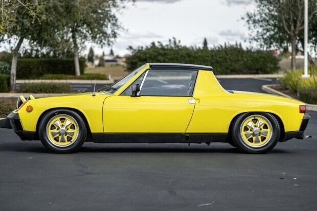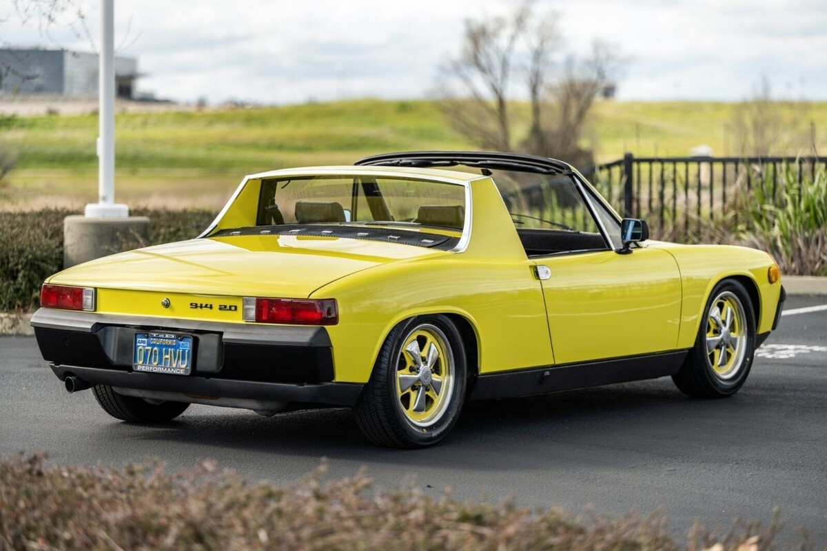 This 1973 Porsche 914 was first sold by Neufeld Porsche of San Carlos, California, and acquired in 1987 by the seller’s father, who commissioned the installation of a 2.2L air-cooled flat-six engine in 1991. Additional work performed at that time included repainting the body in the factory hue of Saturn Yellow, retrimming the seats in black vinyl with houndstooth inserts, and installing Weber 40 IDA carburetors, 5×130 hubs, and 15″ Fuchs wheels with body-color accents. Additional details include a JVC cassette stereo, a removable Targa top, disc brakes, a five-speed manual transaxle, and an aluminum oil tank. The car was acquired by the seller in 1999 and placed in long-term storage from 2005 to 2023 when it was sent to Mobile Works West of Grass Valley, California, to be recommissioned in preparation for the sale. This 914 is now offered with the owner’s manual, a service logbook, repair manuals, service records, and a clean California title in the seller’s name. The front and rear hubs were swapped out in favor of units with a 5×130 bolt pattern, bolt-on spacers were fitted up front, and 911-sourced 15″ Fuchs alloy wheels measuring 6″ in width and mounted with 195/60 Yokohama Avid Ascent GT tires were installed. Stopping power is provided by four-wheel disc brakes with ATE calipers. The two-way adjustable bucket seats are trimmed in black vinyl with houndstooth inserts. Amenities include a carpeted dashboard cover, a JVC cassette stereo, and a cigarette lighter. The dashboard is cracked and the VDO/Kienzle clock does not work The leather-wrapped four-spoke steering wheel frames VDO instrumentation consisting of a central tachometer, a 150-mph speedometer, and a fuel-level gauge. Readouts for voltage and engine temperature are housed in the center stack. The five-digit mechanical odometer is inoperative, therefore true mileage is unknown.