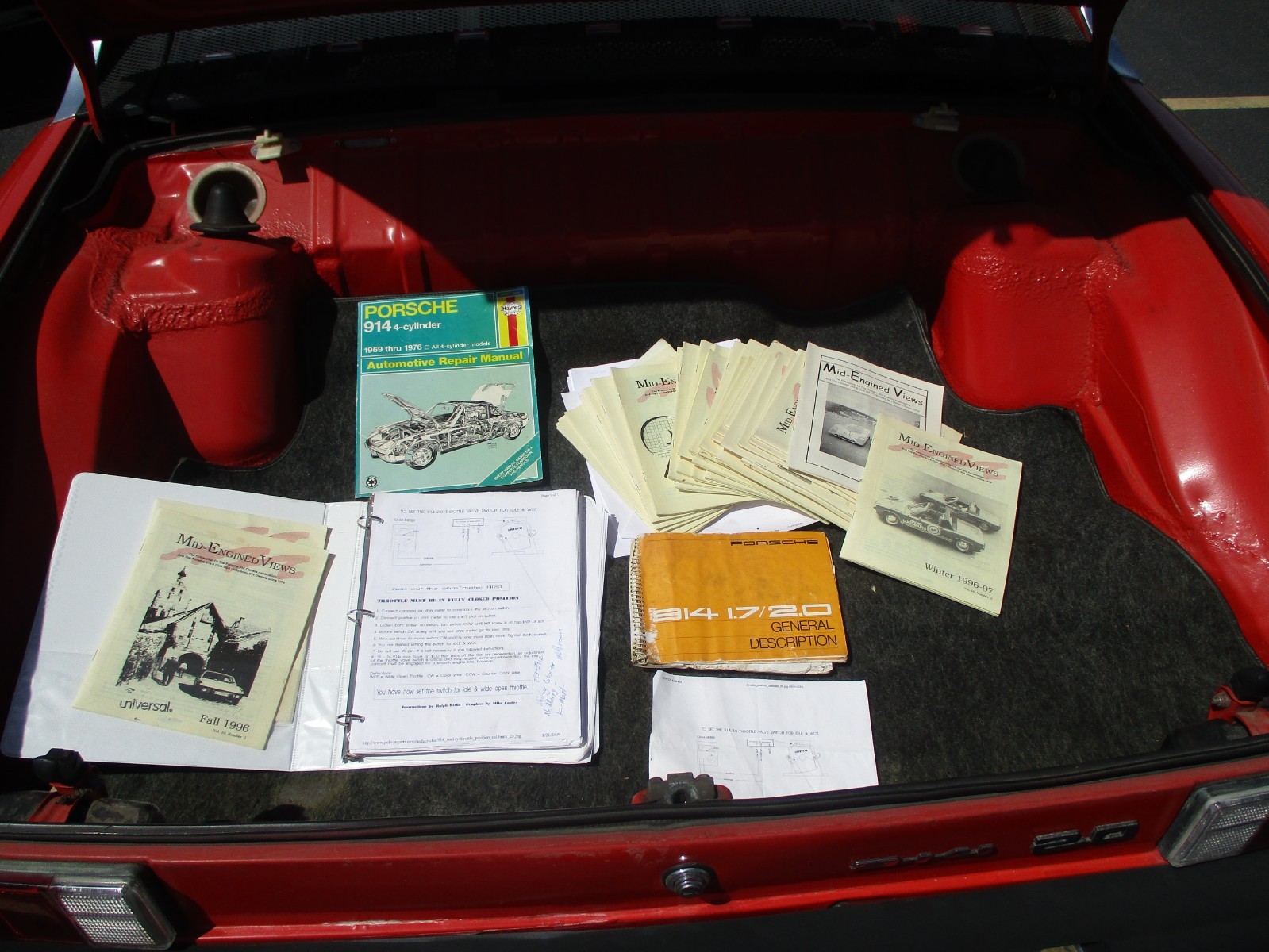Up for sale is a 1973 Porsche 914 2.0 liter in good running order. This little Porsche starts easy and runs nice, with no smoke, good power and with resent shop upgrades. Engine and transmission were pulled and complete new clutch assembly kit with new Presher plat, drive plate, TO bearing, pilot bearing all added, and Clutch plate machined. Also, replaced were all the rubber fittings (hoses and gaskets) While the engine was out the steel fuel lines were replaced and a new electric fuel pump installed and one new fuel injector. Also just added are all new vacuum hoses, a smoke test for vacuum leaks was performed, after the engine and transmission were reinstalled. It has new fuel filters and a new thronal possessing switch installed. (runs nice) Also the transmission has been rebuilt and only has about 30 miles put on it. The speedo is showing 49294 miles, but we are not sure if they or the originals. The body has had an older repaint in the original red color, but it is showing its age with a door ding or two and a couple of light rust spots just behind the top of the doors. (pictured) Some older repairs are. Battery tray in the hell hole rust repaired, fire wall rust repaired, and the rear trunk aria is showing some repair work also. (please look at all pictures closely) Windows roll up and down nicely and I only saw one small nick in the windshield. All lights work as they should, but one backup light needs a new bulb. The interior is original showing its age with one bad spot on the driver's side seat back. The temp gage in the center consol is not working and needs looked at, as dose the E-brake and horn. The car has been sitting for a while and the brakes should be looked at, they work ok but not perfect. It is running its original wheels, and the spare wheel is also an original. Two new Nanking 165/80 15" Tires were added. The original Ownes manual, jack and tow pin do come with the car and also other paperwork. I'm listing this little Porsche for my Dr. friend, that bought the car in 2007 as a project car for him and his son, but the project never took place. I will take all your questions to my friend. Buyer is responsible for shipping and all shipping costs. We will help with loading on our end and in anyway we can. For your questions, please call Bill 208-750-0000.