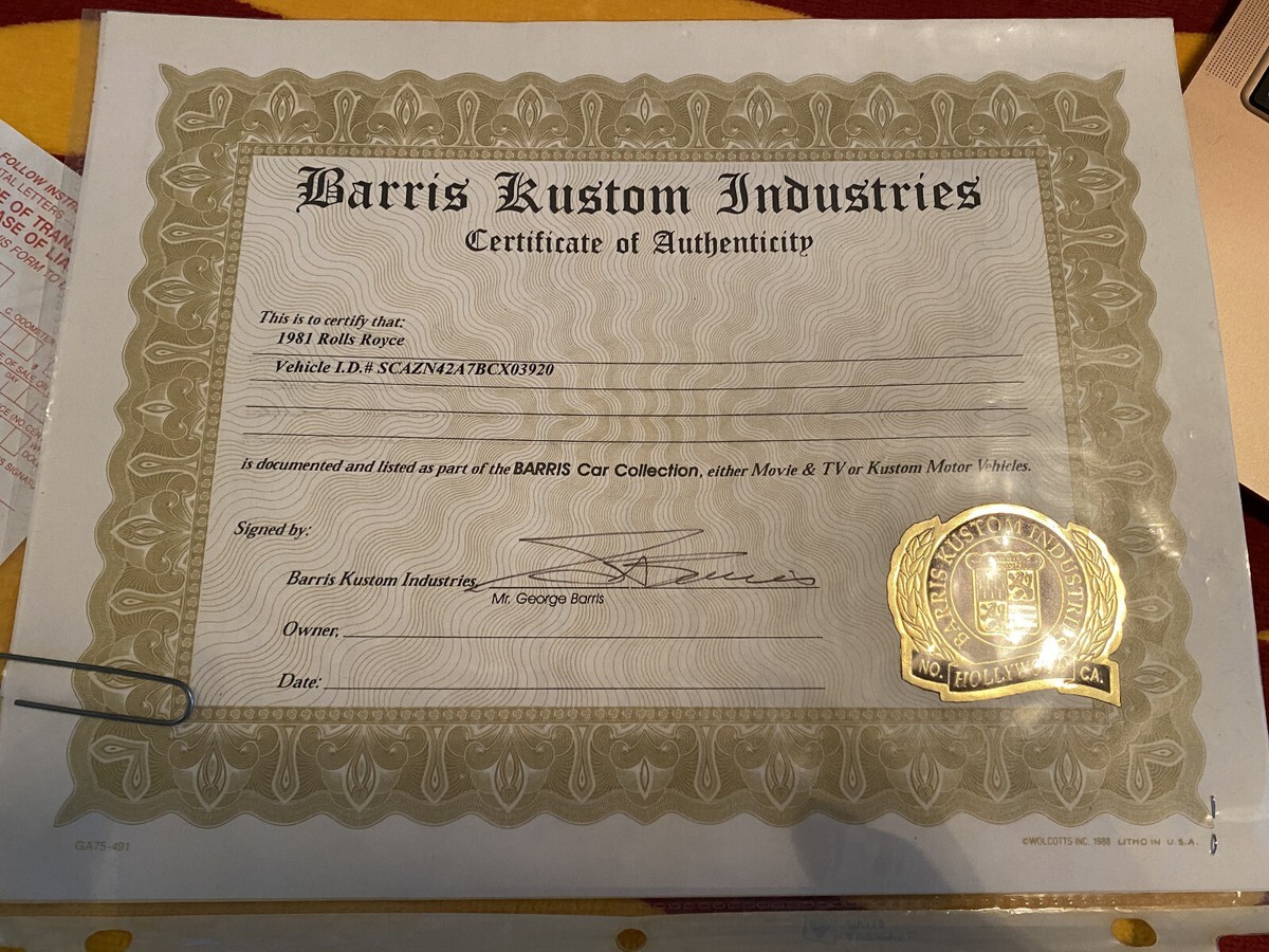 Up for sale is my George Barris Silver Spur Rolls Royce. This was George Barris' own personal car, a Certified Barris Kustom, see pic, and brother of the Batmobile, obviously. Currently in non running condition. See pics 6 onwards that show current condition. It's was in storage in my garage for some ten years prior to more recently, since July 2021 in storage in an open air lot in Sylmar, N San Fernando Valley, just off the 210, Los Angeles. First 4 pics are what it looks like cleaned up, and the next 5 pics after the Certification doc pic is what it looks like now. According to the owner of the open storage lot, the dust protects the paint from the sun, hence no car cover. I just took his advice. It probably doesn't look great in person, but it'll clean up no problem. In 2021 we had it all cleaned up and almost running. New spark plugs, some tinkering, etc, but we ascertained that the fuel pump and fuel lines needed cleaning. Last time I started it up was 2020. It's a Rolls Royce, with some massage it'll fire right up, and the car will clean up nice as per the first 4 picsand the canvas top will straighten out with some heat, castor oil and massage. Well worth doing, as it is, obviously, worth a lot more than $10k, given it's certified heritage. I'd say the sky's the limit on this. I meant to do it myself, but just didn't get round to it. When it does clean up and start, the only real fault I can think of is the rubber painted bumpers, the paint is cracked slightly, where paint doesn't really go well on rubber. I have seen this on other Barris Kustoms. It's typical of Barris cars. But, the guy who painted it in 1981 still works at Barris in North Hollywood and he quoted me a decent price to touch up any paintwork that needed doing. To pick it up, you might need an air pump to put some air in the tires, and a trailer or flatbed. I have 100 mile AAA if that's of any help to the buyer - see second to last pic, just before the title pic. Also, ebay was having trouble finding the match of the VIN number, no idea, the VIN number is fine and it's a clean title ready to be signed over to you, along with the certification doc. Any other docs are in the car, a long with a spare wheel and tire in the trunk. When I was driving it around Los Angeles the only thing I had done on it was a new windshield washer pump and I had the inside of the back wheel rims cut to fit the larger wheels. It was done at a pro shop and he did a great job. Very last pic is circa 2000 and it's original wheels, which I don't have, and in any case I prefer the chrome wheels. Looks bad ass rolling down Sunset. Sold AS IS, obviously.