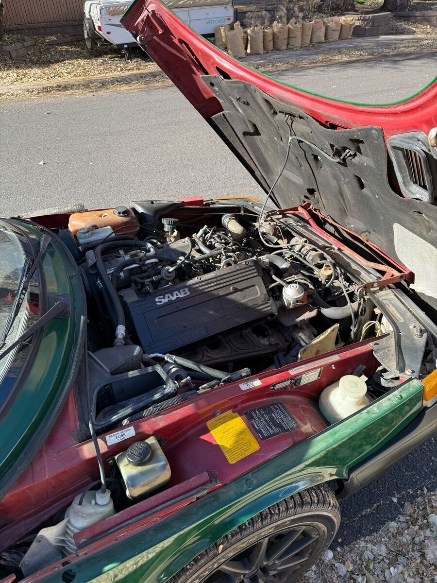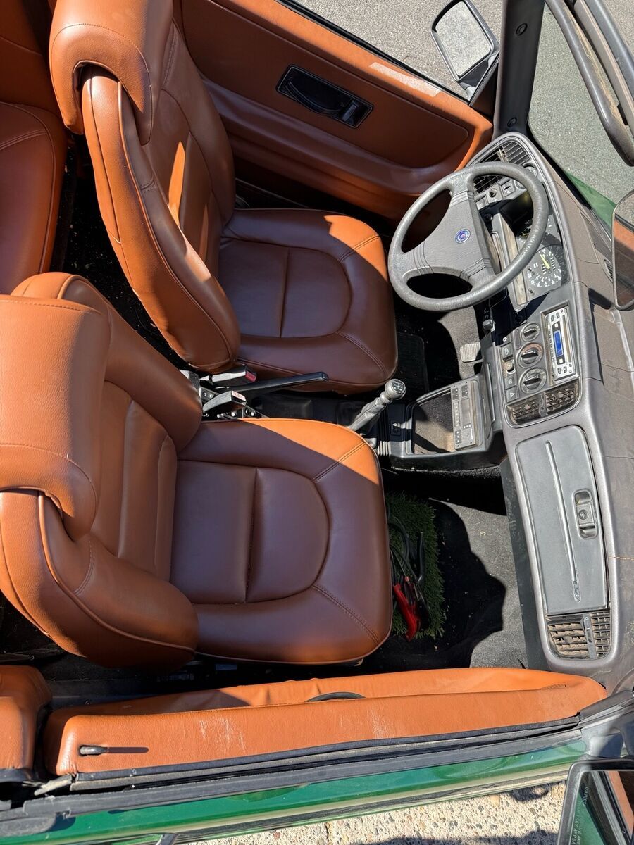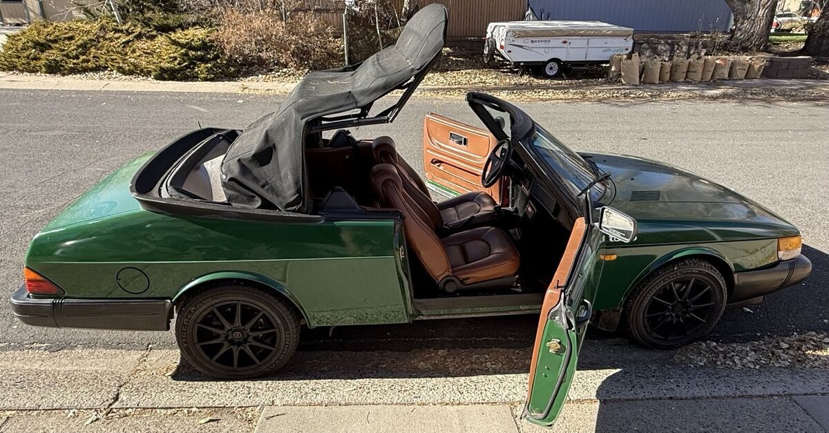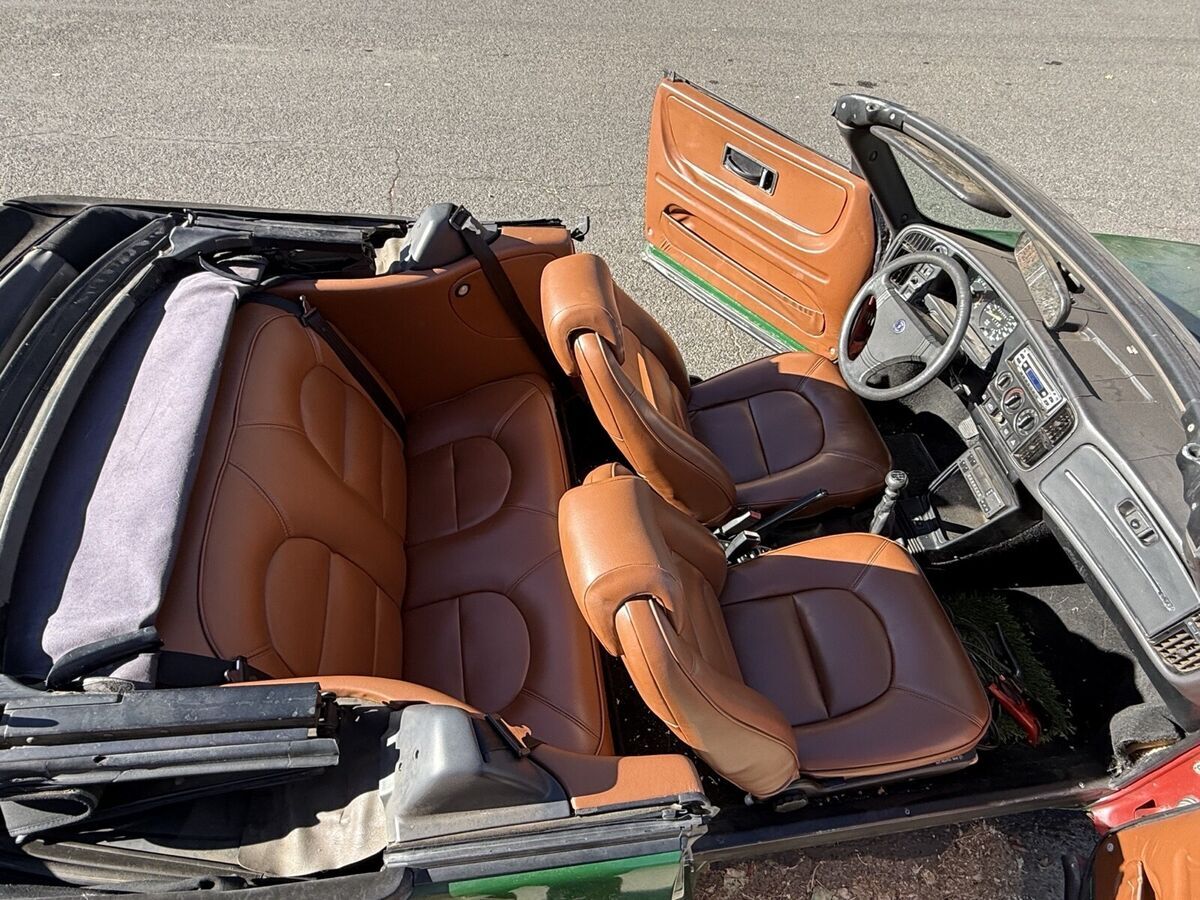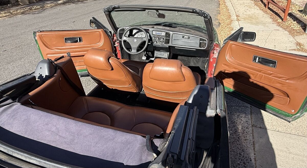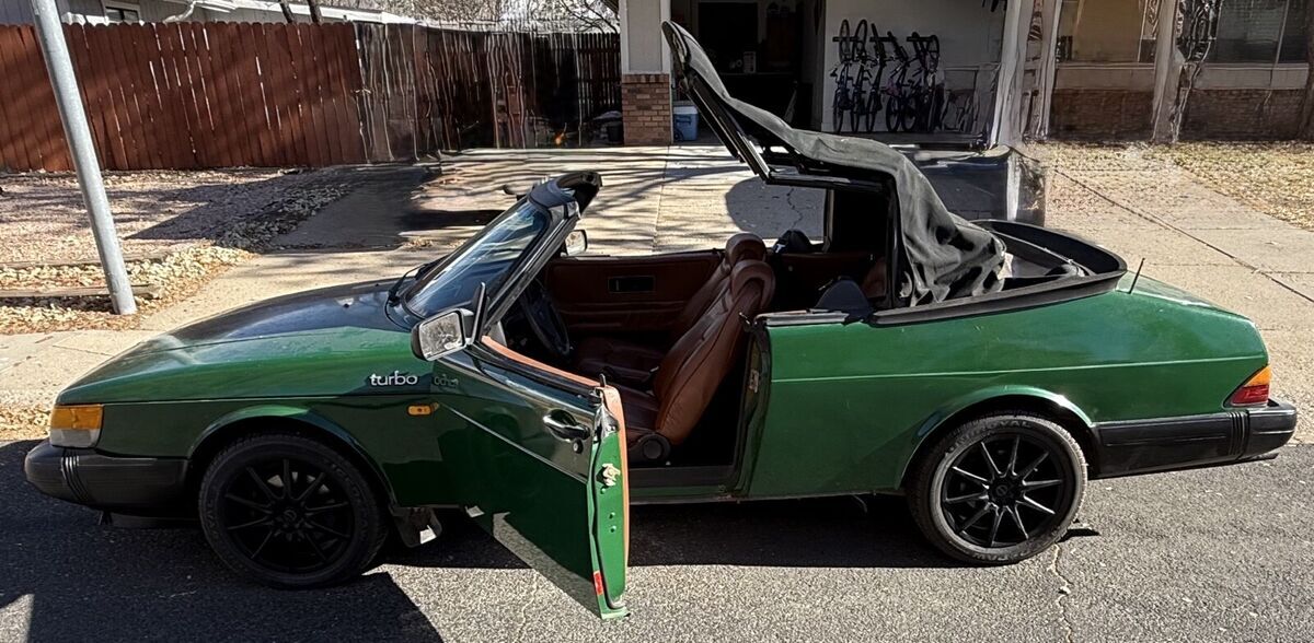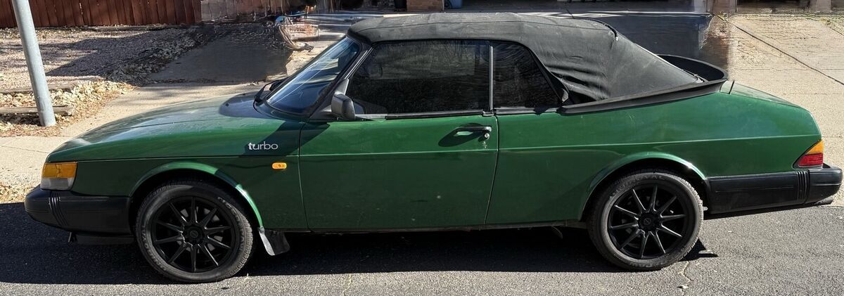 This is a 1988 Saab 900 convertible in green exterior color with a tan interior. It has 3 seats and a manual transmission, with a 2.0L gas I4 engine and front-wheel drive. The vehicle has 202,984 miles and is a classic car with a clean title.