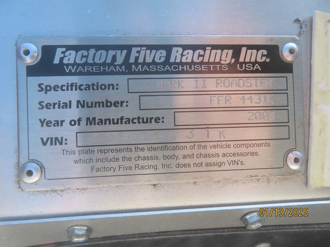 Factory Five Racing Mk2 RoadsterFuel-Injected 302ci V8Five-Speed Manual TransmissionBlack Leather Upholstery17" Cobra R-Style WheelsFour-Wheel Disc BrakesSide-Exit Exhaust PipesSimpson Multi-Point HarnessesEmblems are not permanent, will peel off13300 milesnew starter, battery, alternatorFox body engine and transmission have all build instructionsreach out with any questions
