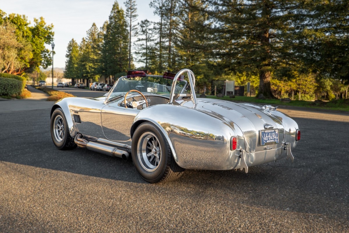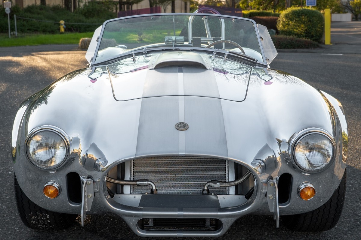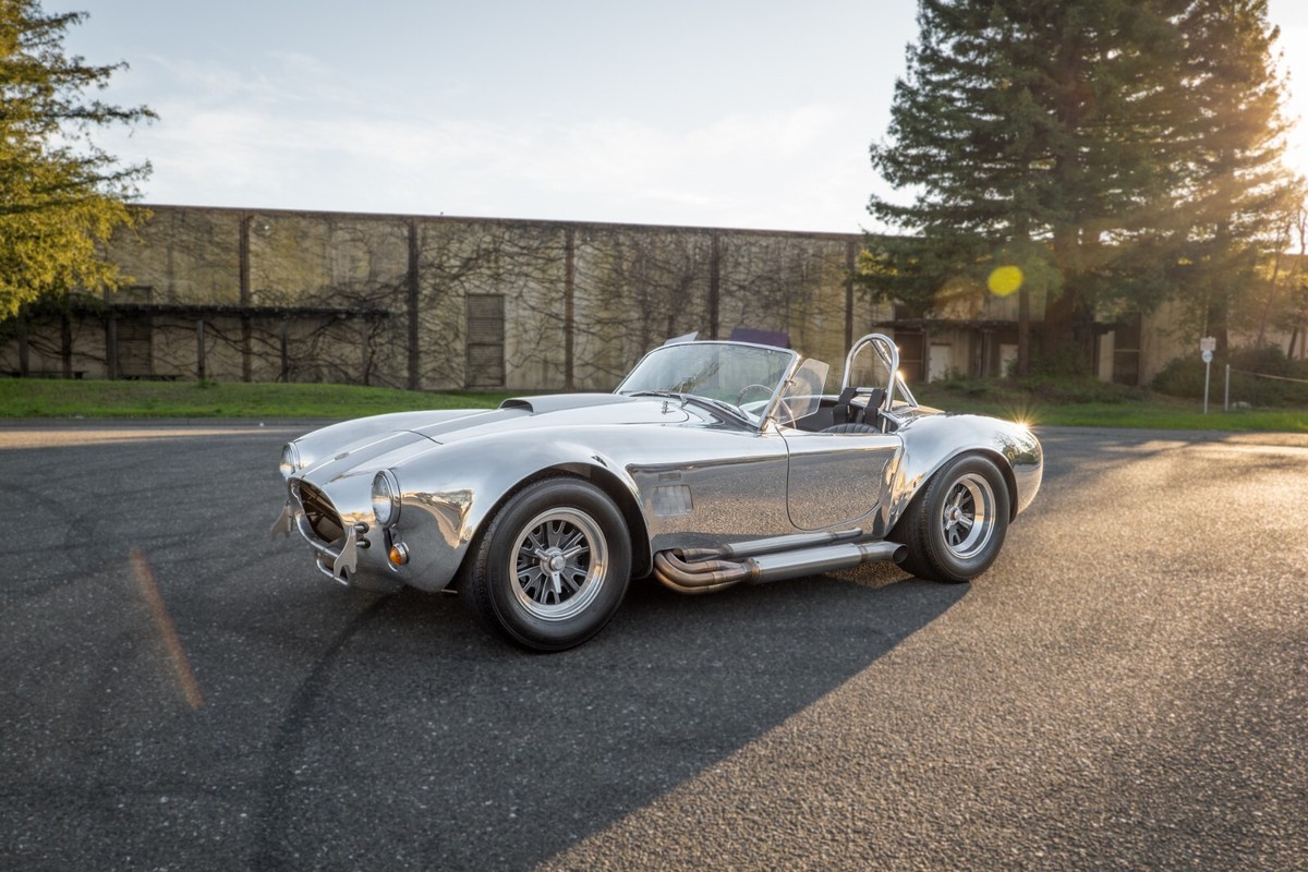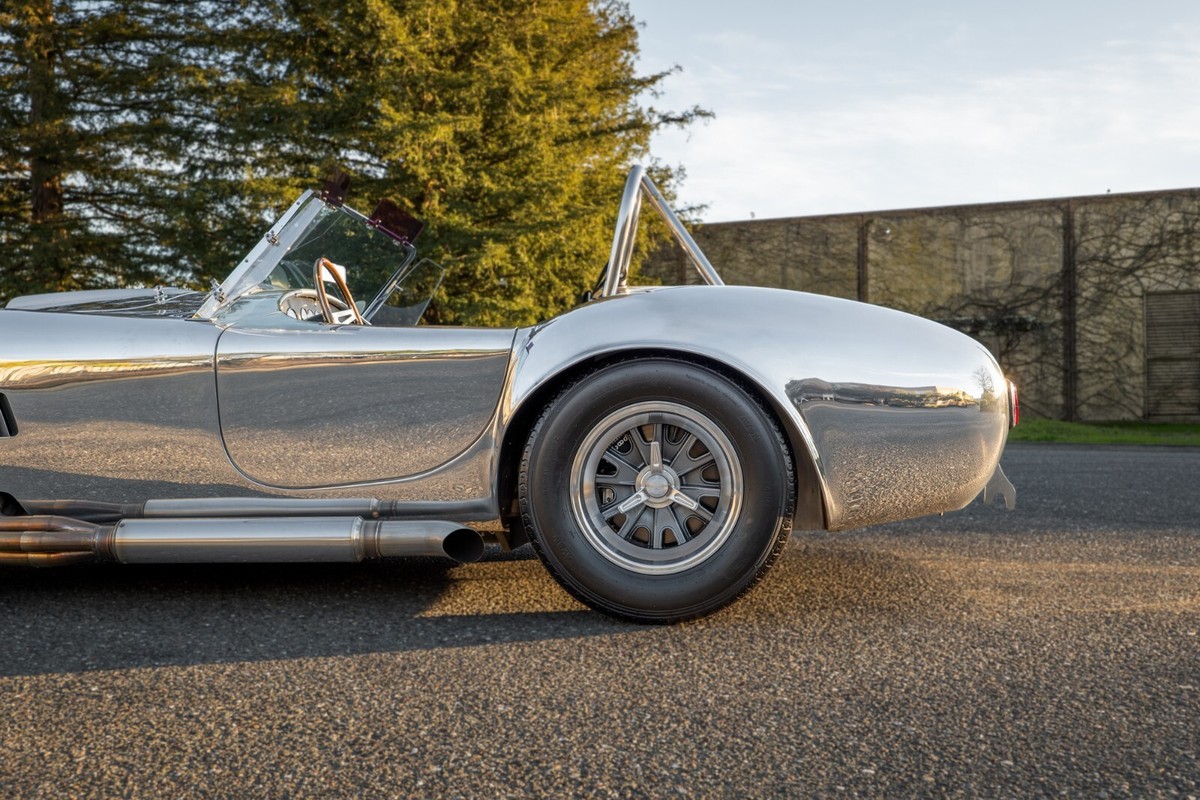 The Cobra 427 S/C 50th Anniversary Edition offered here was the 17th built and was very desirably specified with Kirkham’s beautifully finished bare polished aluminum body with brushed stripes, as well as a leather interior, heater/defroster, 15-inch wood steering wheel, and Shelby gauges. It was set up with transmission mounts for a Tremec five-speed transmission, the standard 3.54:1 rear differential, steel side exhaust and headers, Shelby coil-over suspension and Shelby Wilwood racing brakes, rack-and-pinion steering, 28-gallon fuel tank, and original-style aluminum 15-inch wheels with winged knock-offs. The Carroll Shelby Engine Company then supplied an aluminum 427 FE engine,displacing 468cubic inches, capable of producing 550horsepower at 5,800 rpm and 580pound-feet of torque at 4,200 rpm.