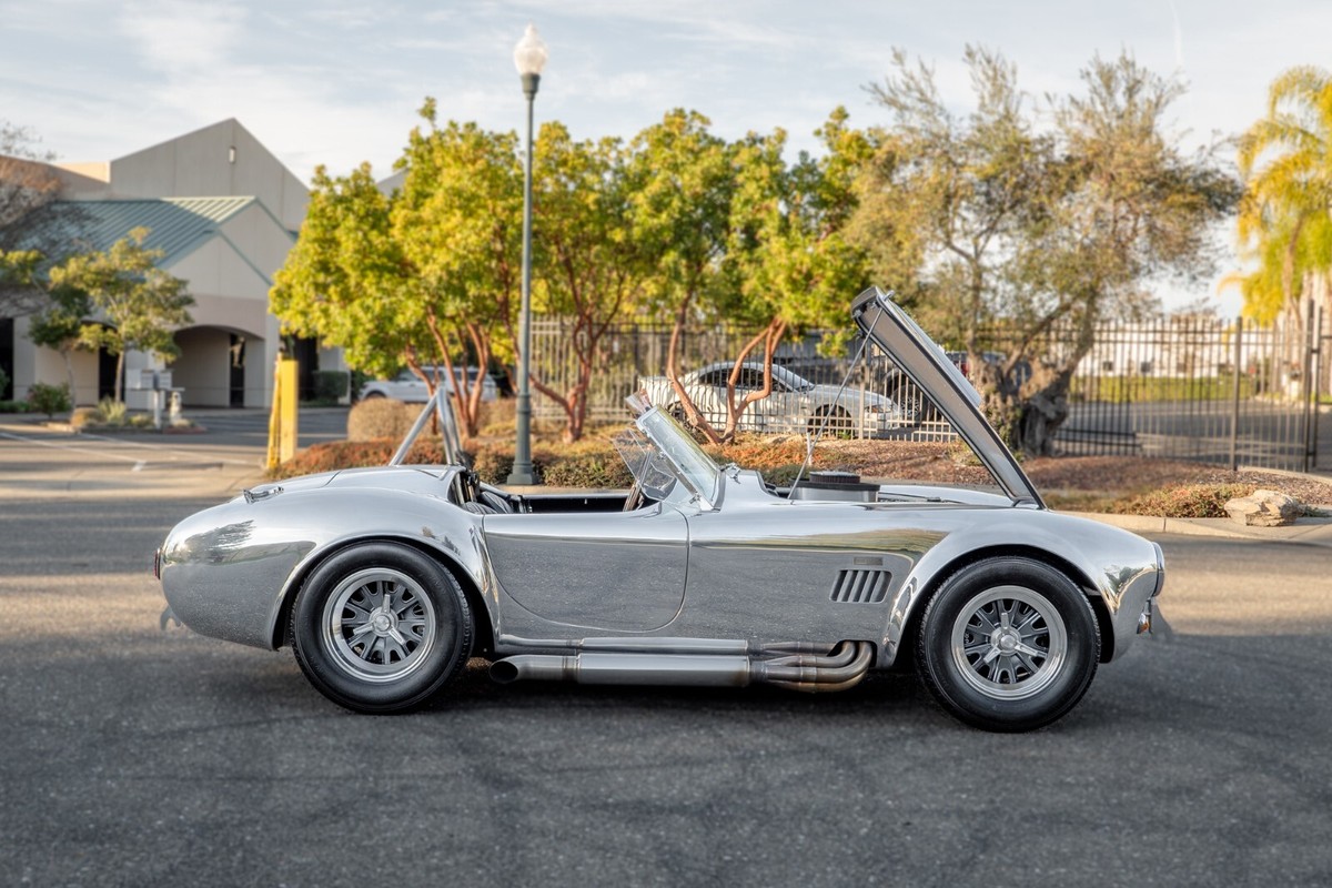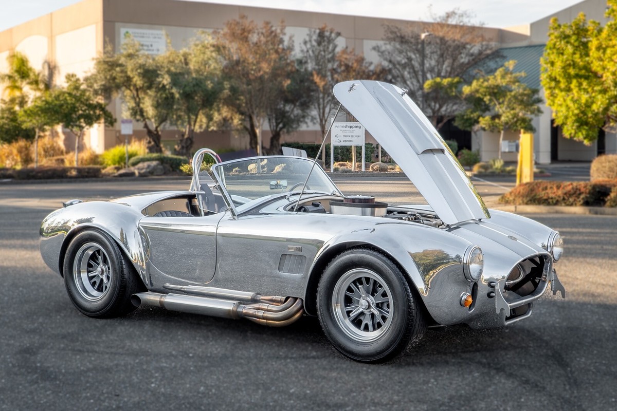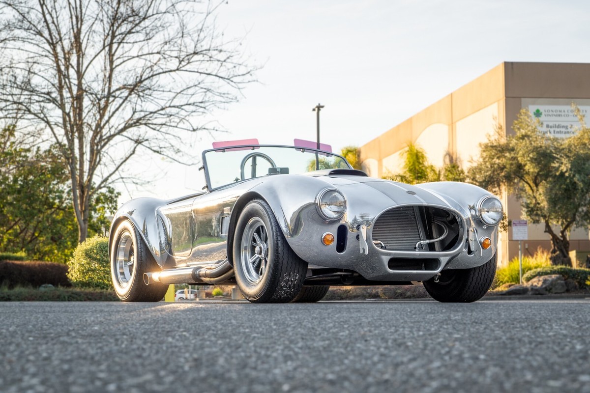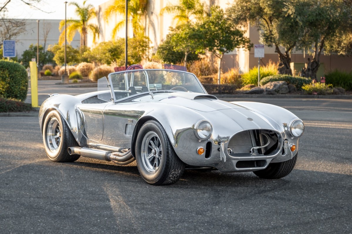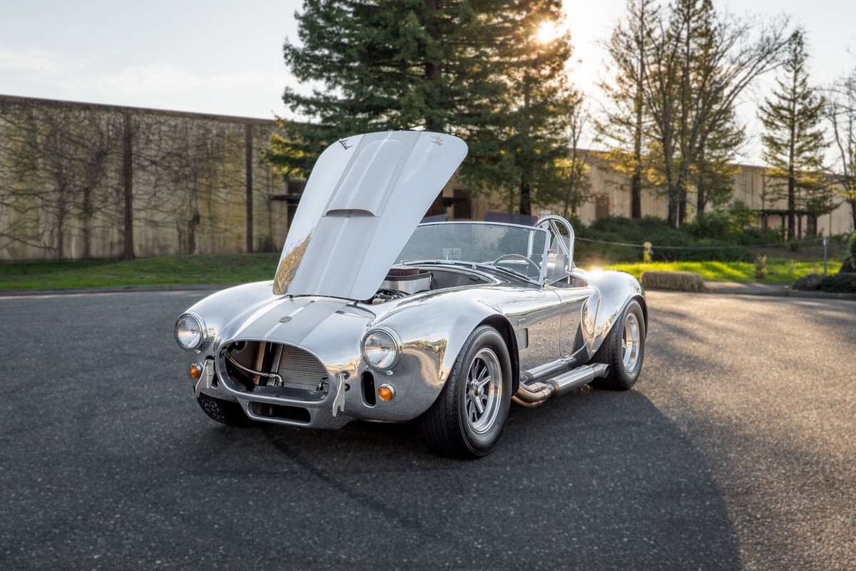 The Cobra 427 S/C 50th Anniversary Edition offered here was the 17th built and was very desirably specified with Kirkham’s beautifully finished bare polished aluminum body with brushed stripes, as well as a leather interior, heater/defroster, 15-inch wood steering wheel, and Shelby gauges. It was set up with transmission mounts for a Tremec five-speed transmission, the standard 3.54:1 rear differential, steel side exhaust and headers, Shelby coil-over suspension and Shelby Wilwood racing brakes, rack-and-pinion steering, 28-gallon fuel tank, and original-style aluminum 15-inch wheels with winged knock-offs. The Carroll Shelby Engine Company then supplied an aluminum 427 FE engine,displacing 468cubic inches, capable of producing 550horsepower at 5,800 rpm and 580pound-feet of torque at 4,200 rpm.