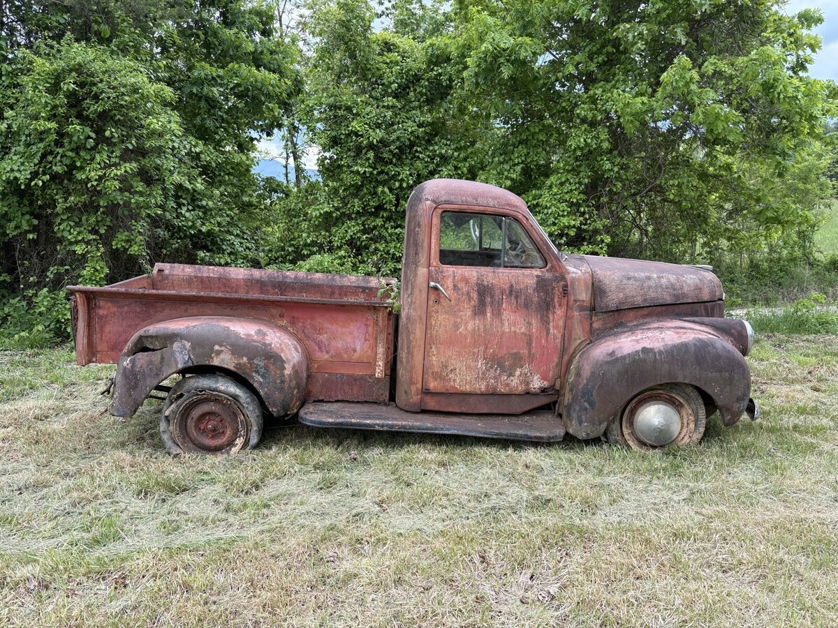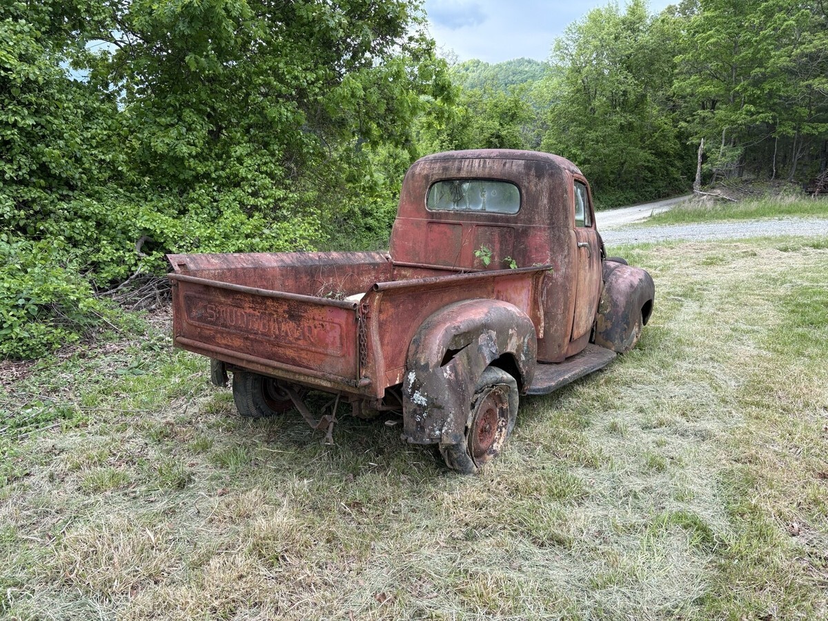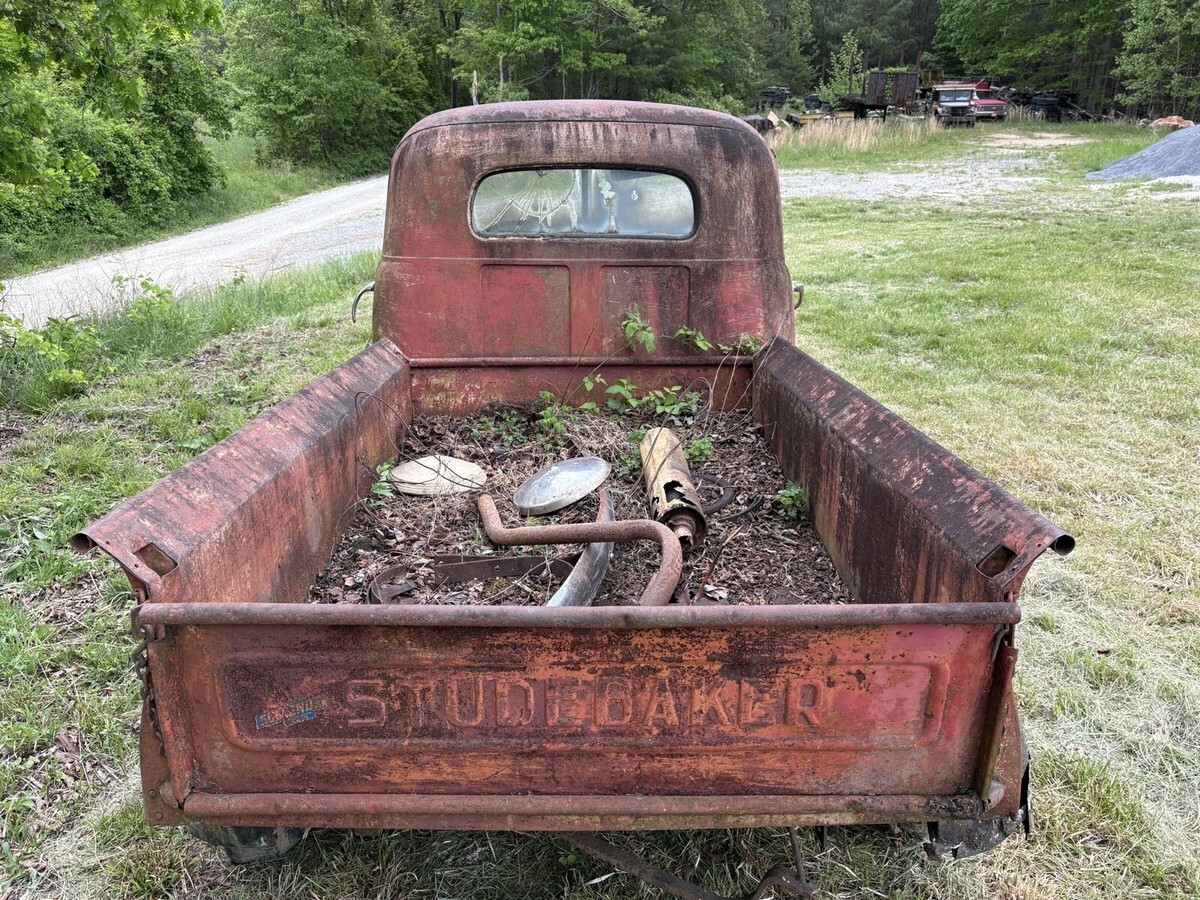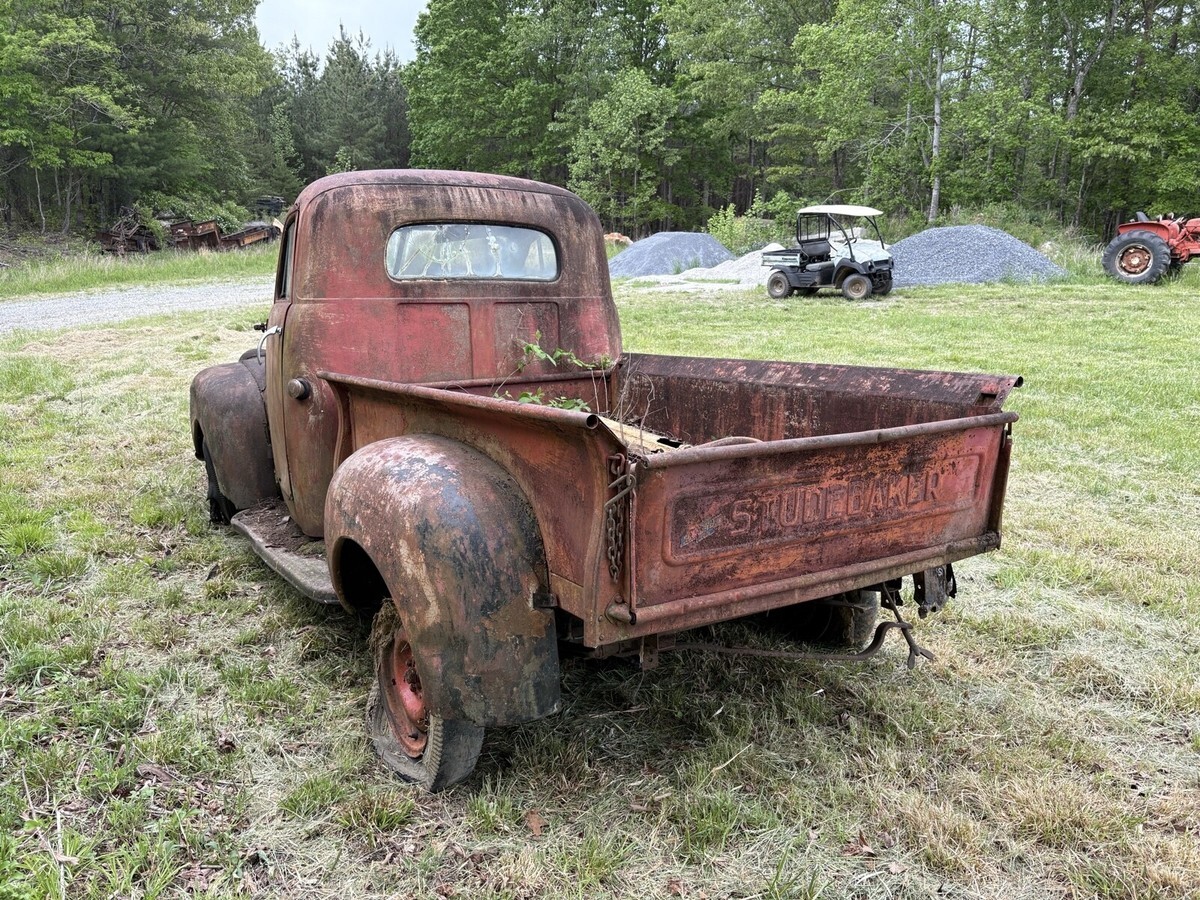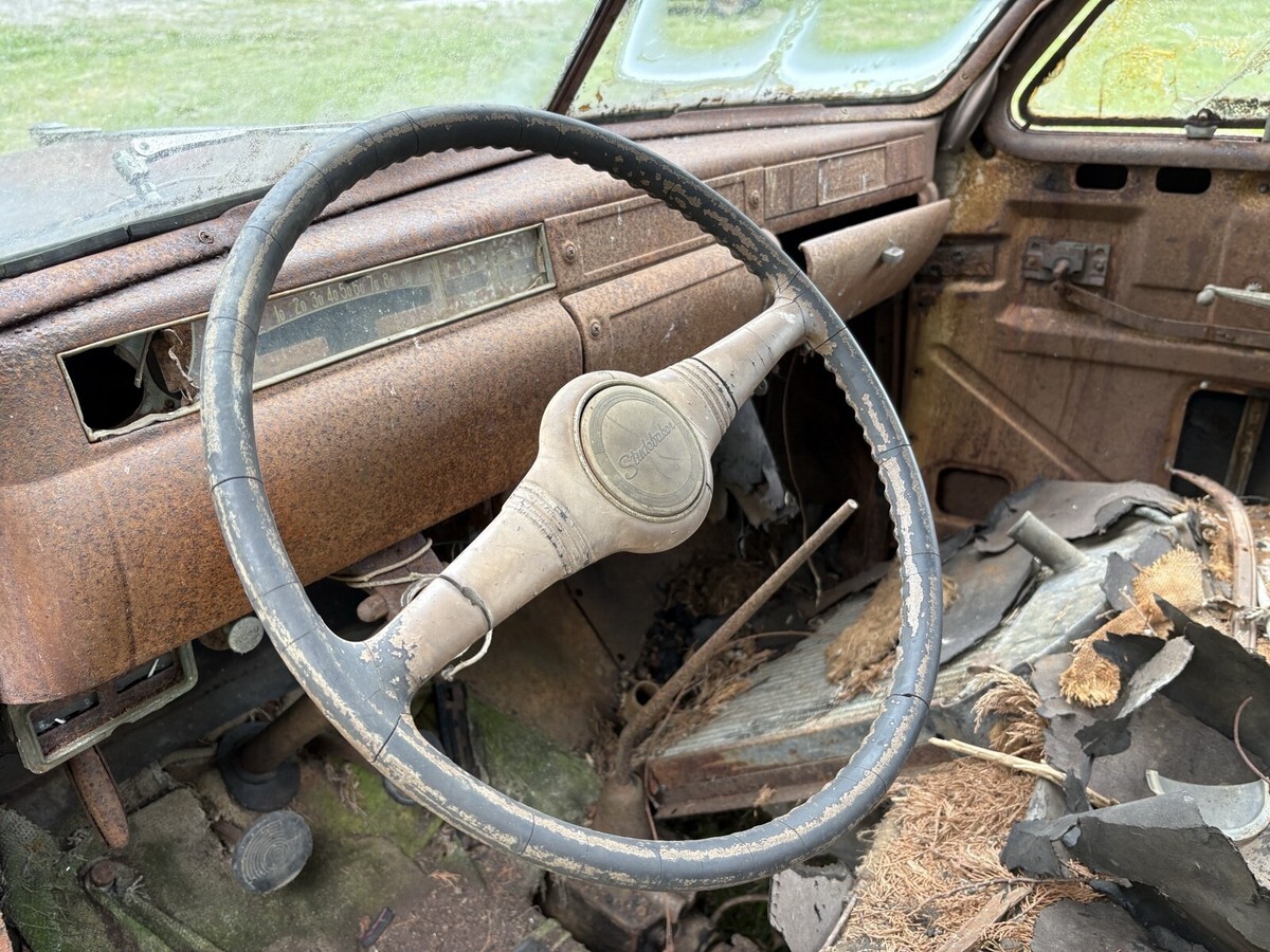 This 1946 Studebaker M5 Pickup has been in a pasture for 50+ years, it has accumulated plenty of rust, the tires are rotted. It has the radiator inside the cab. And it has a good clean title.