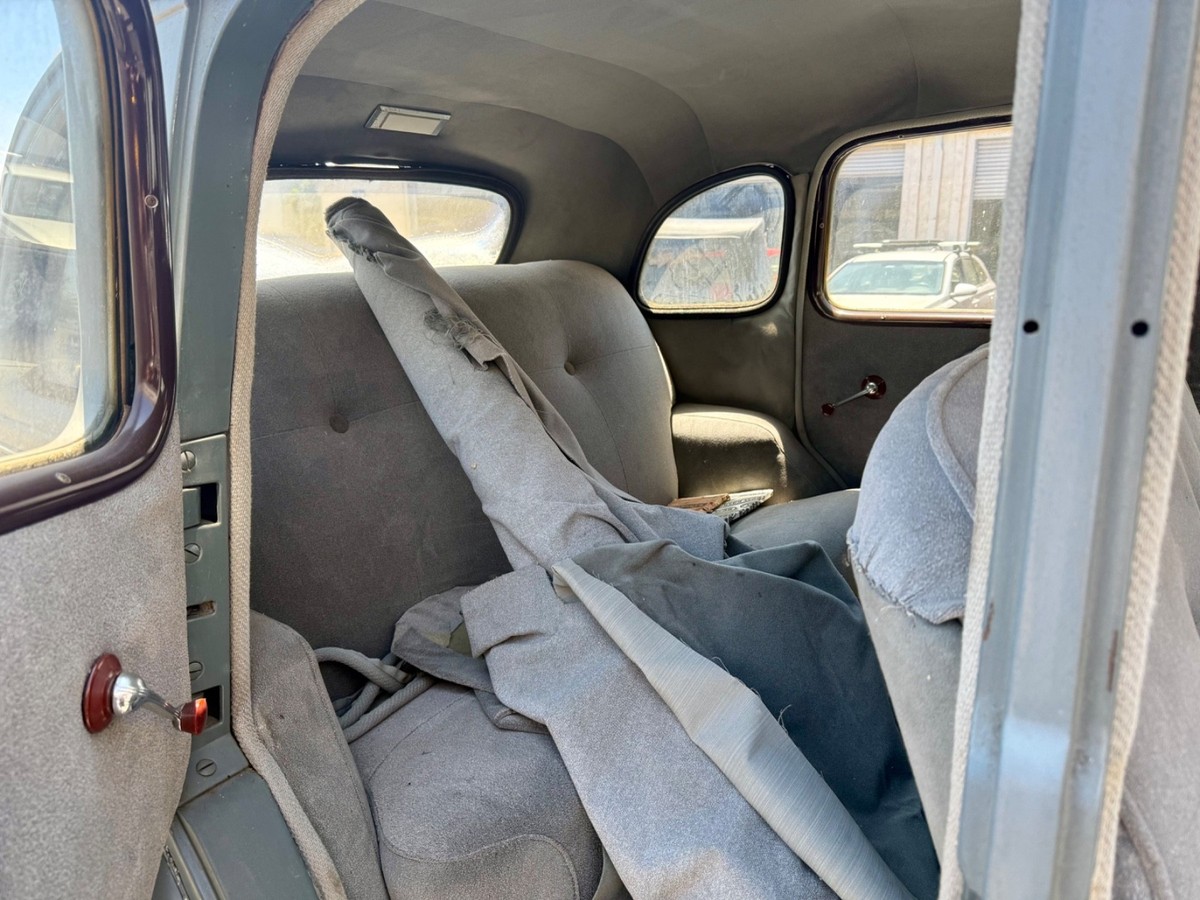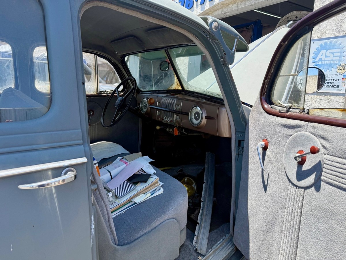 - Exterior: The body is finished in a gray primer, with the original bodywork appearing to be very straight and complete. It features the distinctive "suicide" style rear doors. The chrome trim, bumpers, and handles all appear to be original.