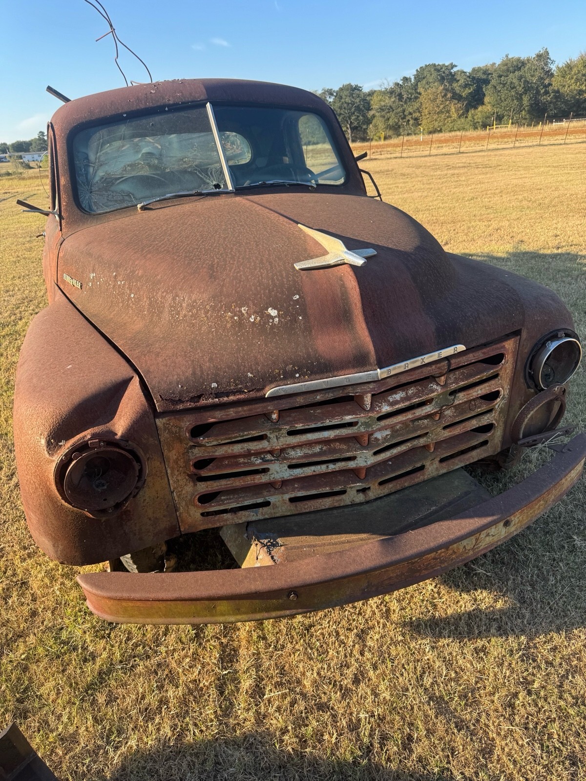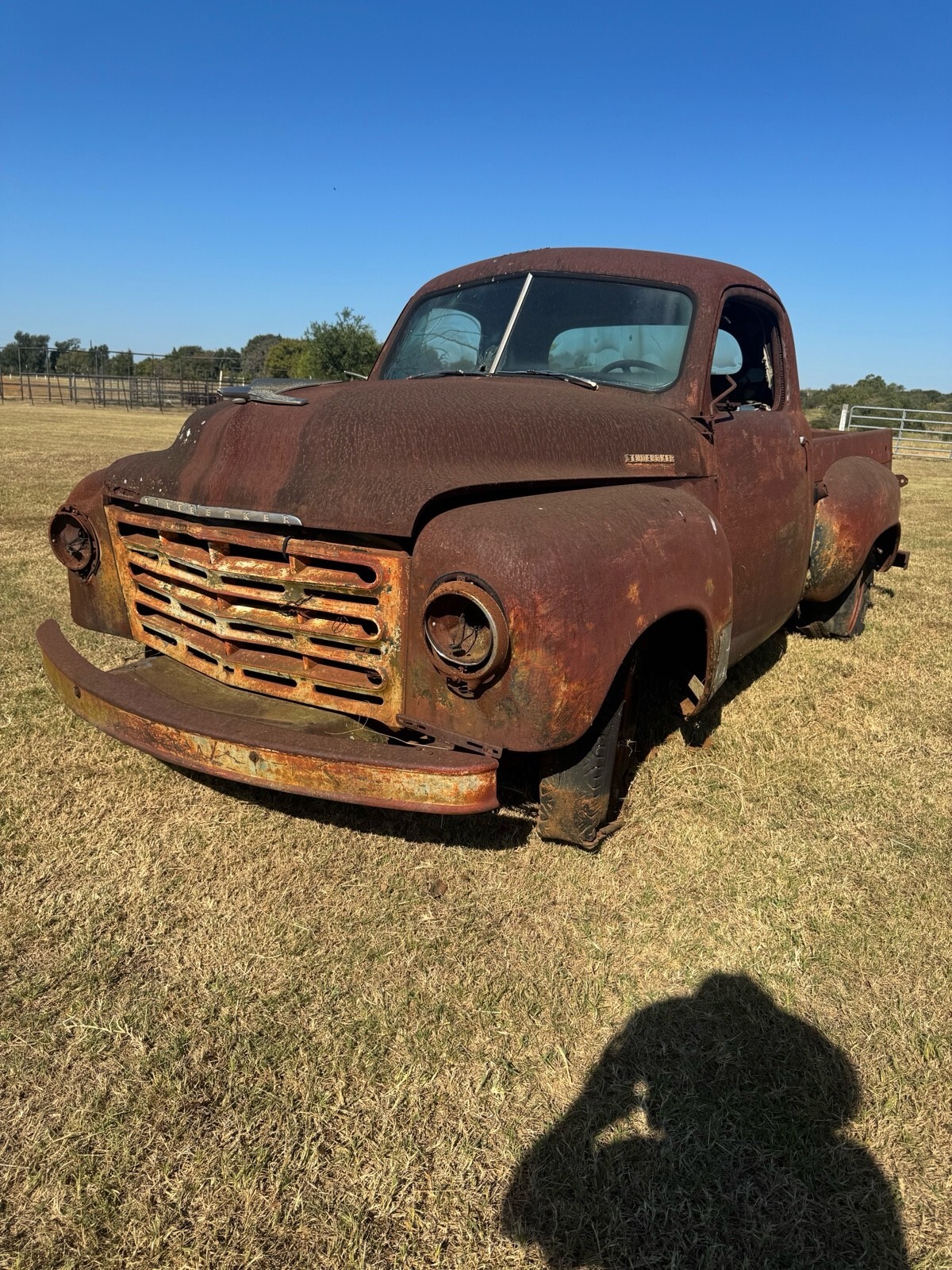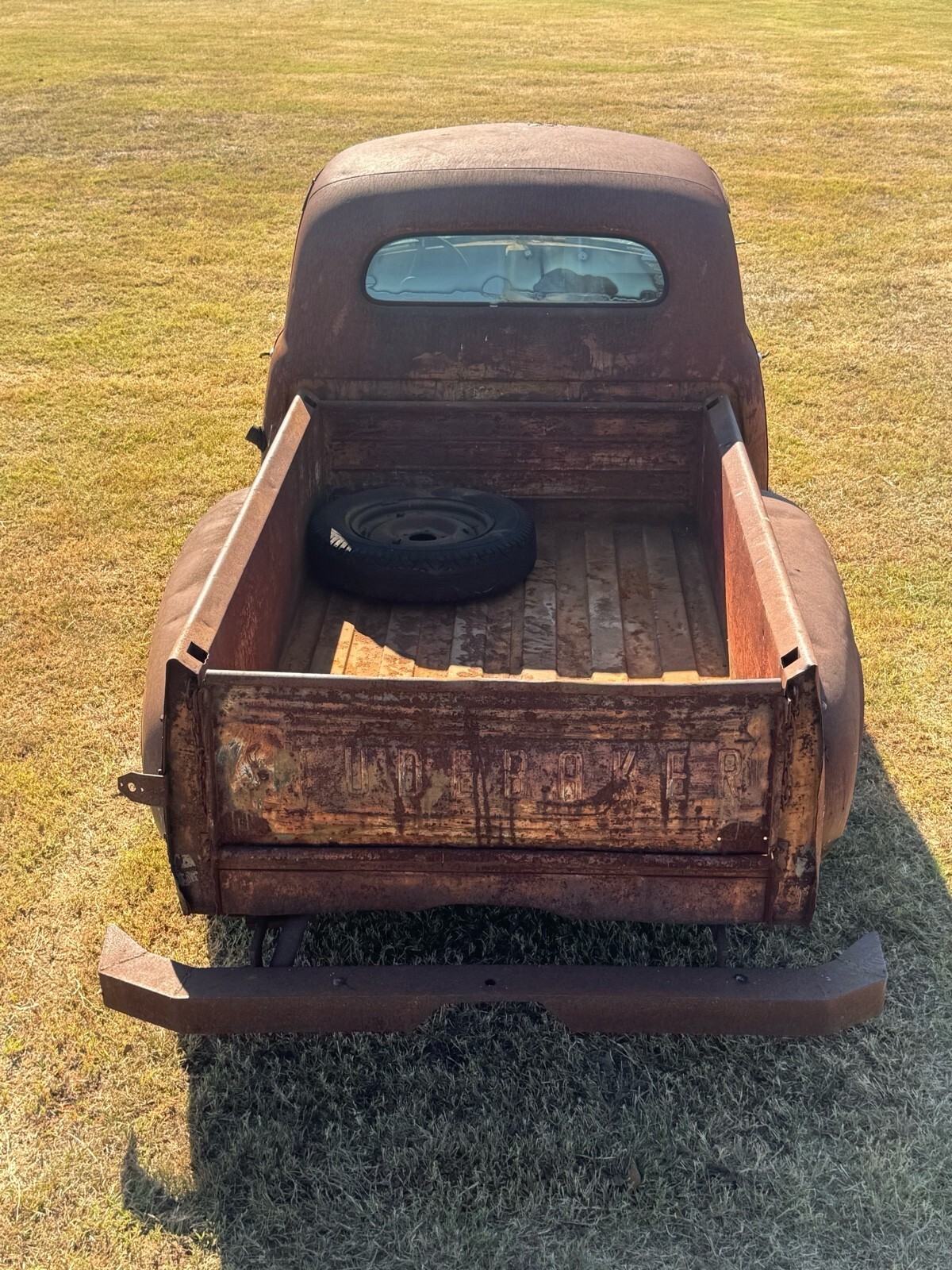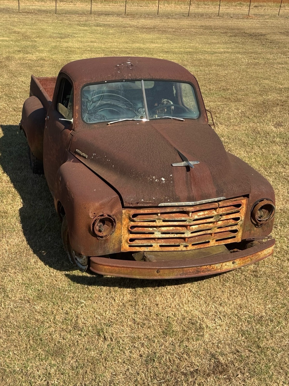 Solid old Studebaker pickup ready for restoration. Body shows typical surface rust and patina but mostly complete. Engine not currently running. Great candidate for a full rebuild or custom rat rod project