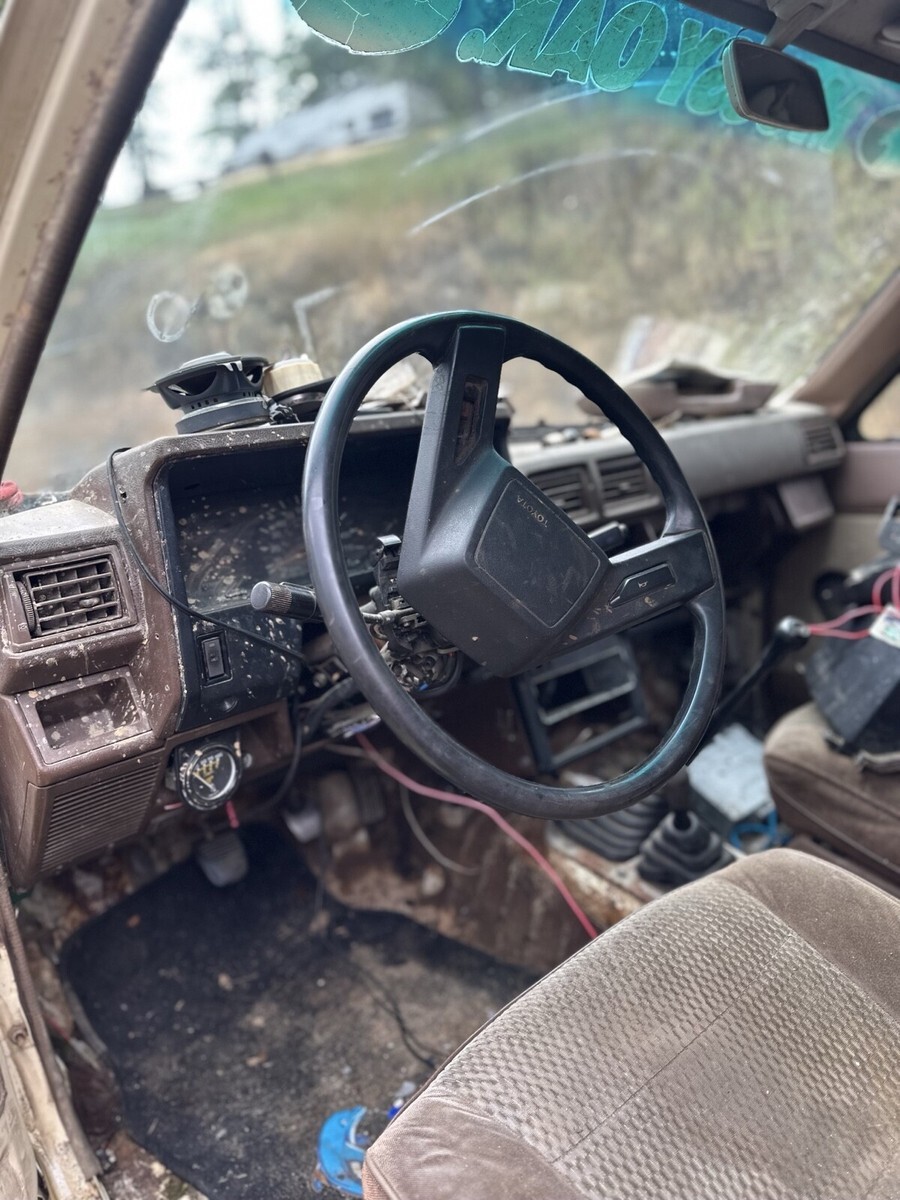 The 1986 Toyota Pickup SR5 is a classic truck with a beige/creme exterior and brown interior, featuring a manual transmission and 4WD drive type. This vehicle has a 2.4L engine with a mild performance cam, 86 - 110 kW (115.24 - 147.4 hp) of horsepower, and comes with features such as truck registration, AM/FM stereo, trailer hitch, cassette player, cloth seats, tilt steering wheel, power steering, and tow bar. With a 2-inch suspension lift and 1.5” ball joint spacers, this pickup is capable of achieving a fuel consumption rate of combined 16-22 mpg and has a partial service history available.